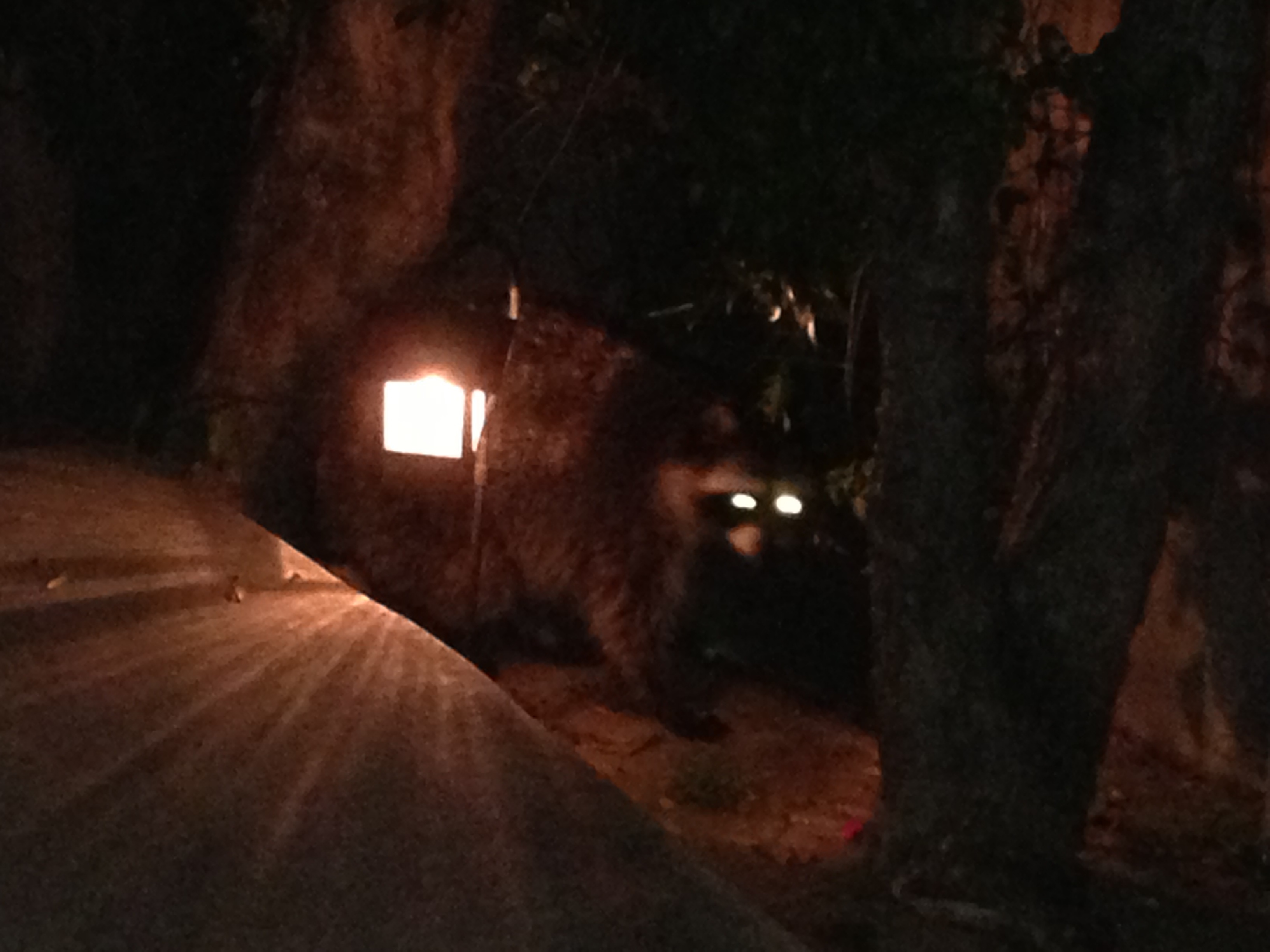 I heard the neighbors dog going crazy and looked out the front door to see those eyes and a second tail going up into the trees. DH is on his way home from the airport and I called him to tell him to come in the back because I don't want to have to go to the hospital for a raccoon bite!