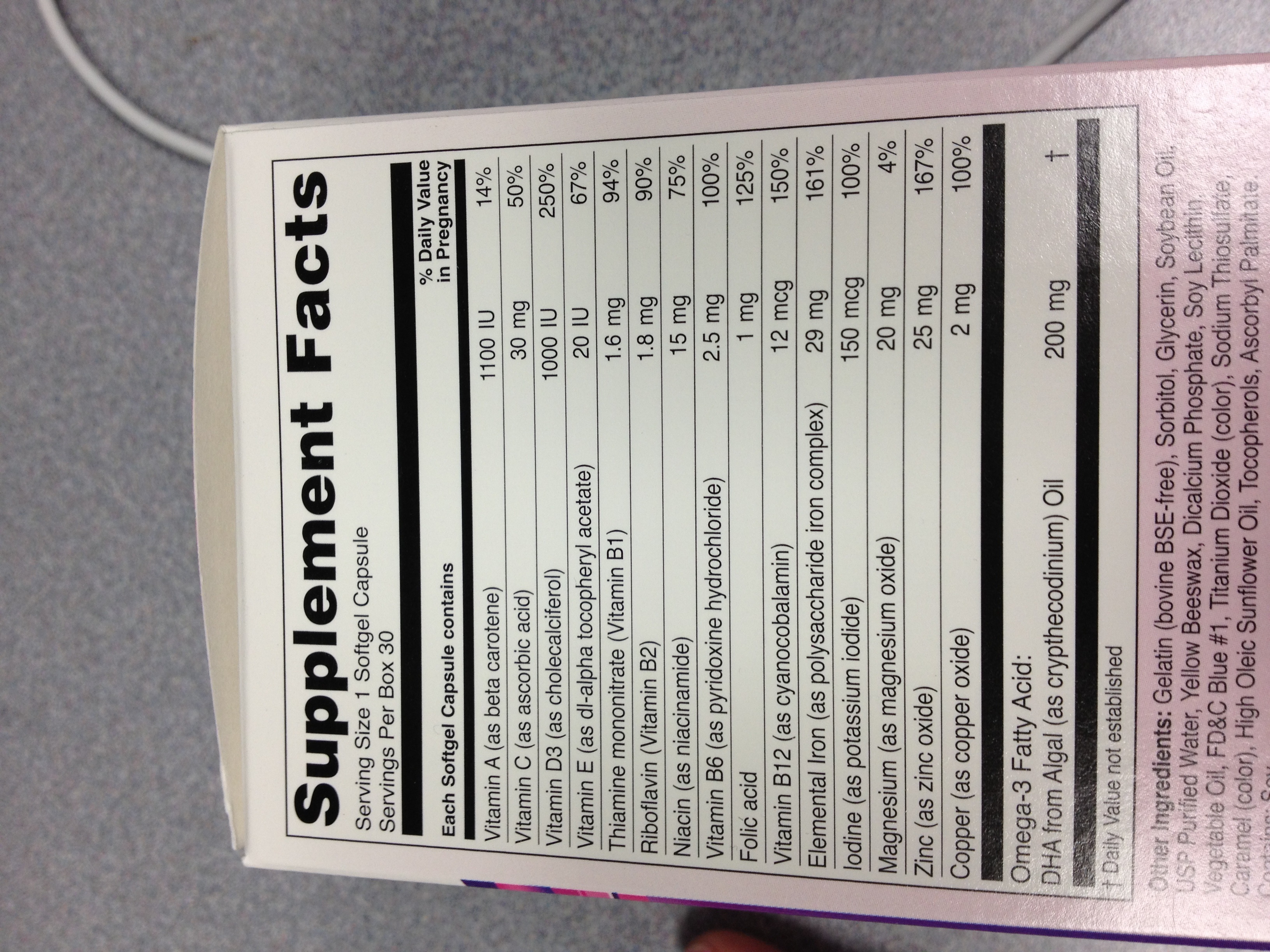 Just curious what prenatals everyone is on. My doctor put me on Prenatal Plus Tab and the generic form Vol Plus Tab Trig is free at Meijer! But I'm unsure of the ingredients..if you have any insight I'd love to hear!