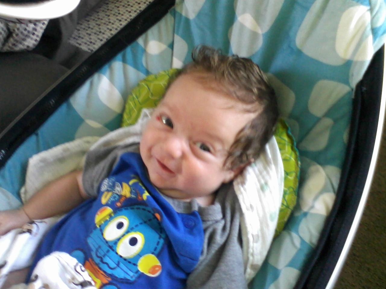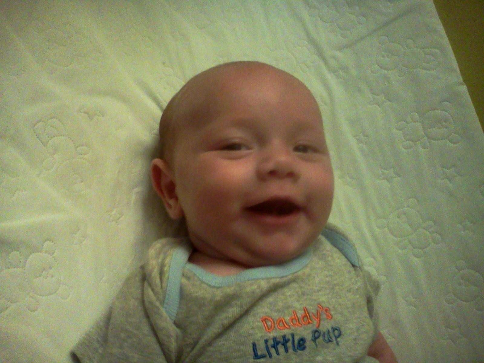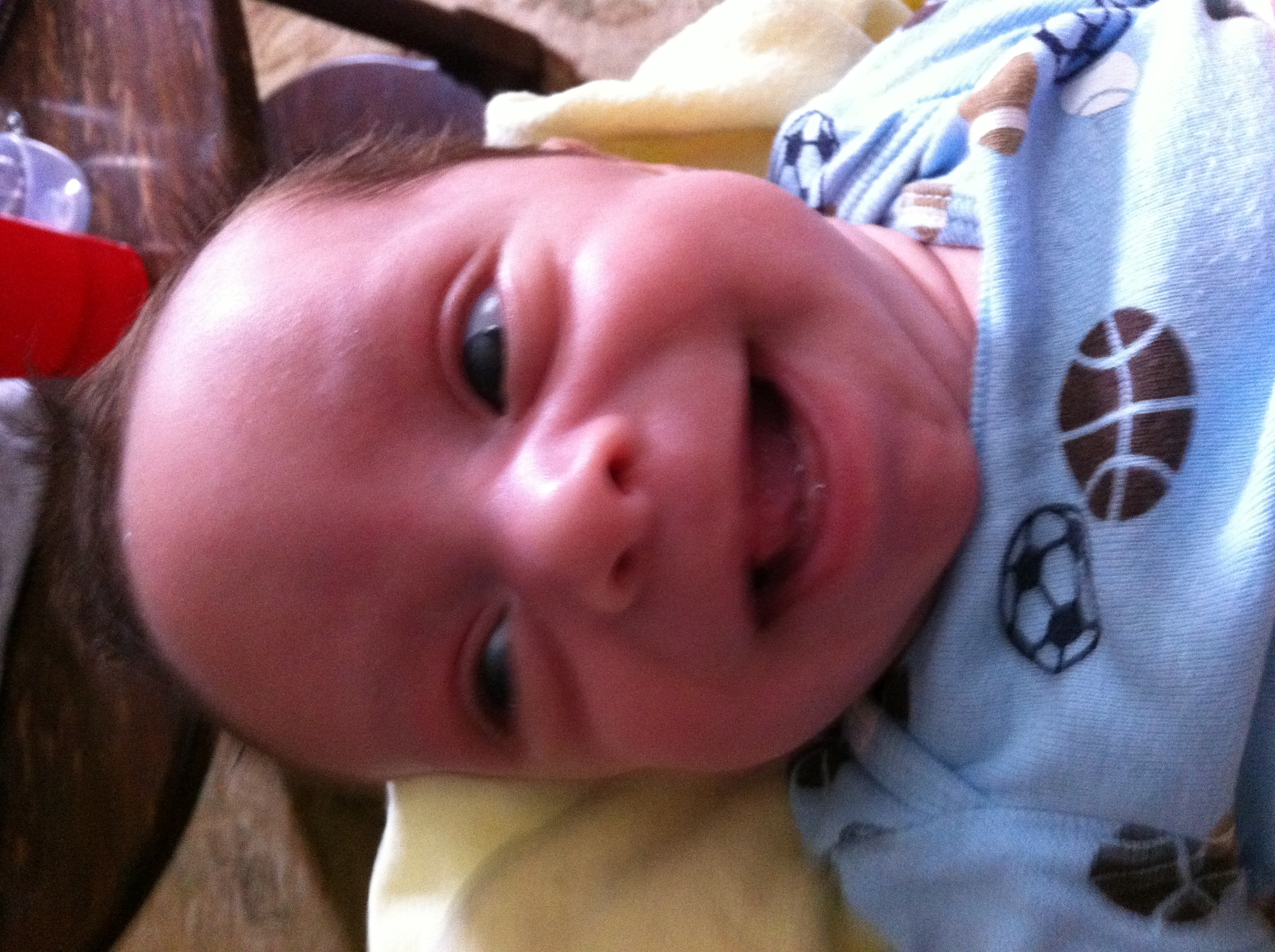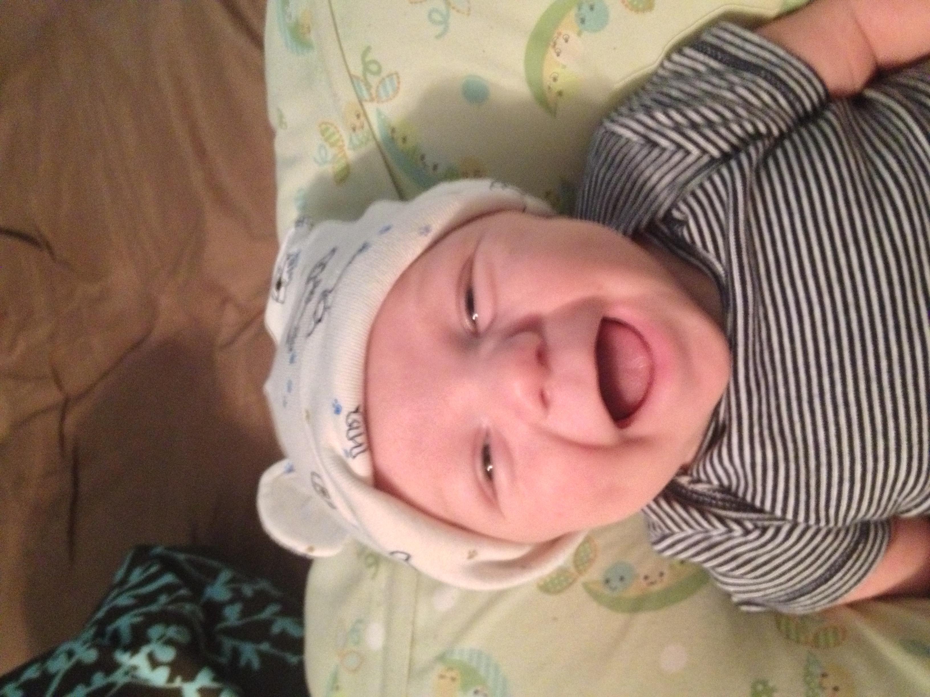 My lil man will be 6 weeks tom and is about 10lbs now. I was finally able to catch a smile on camera... 1st pic was the end of a smile, 2nd was a smirk with his tounge out and 3rd was a big cheesy smile!