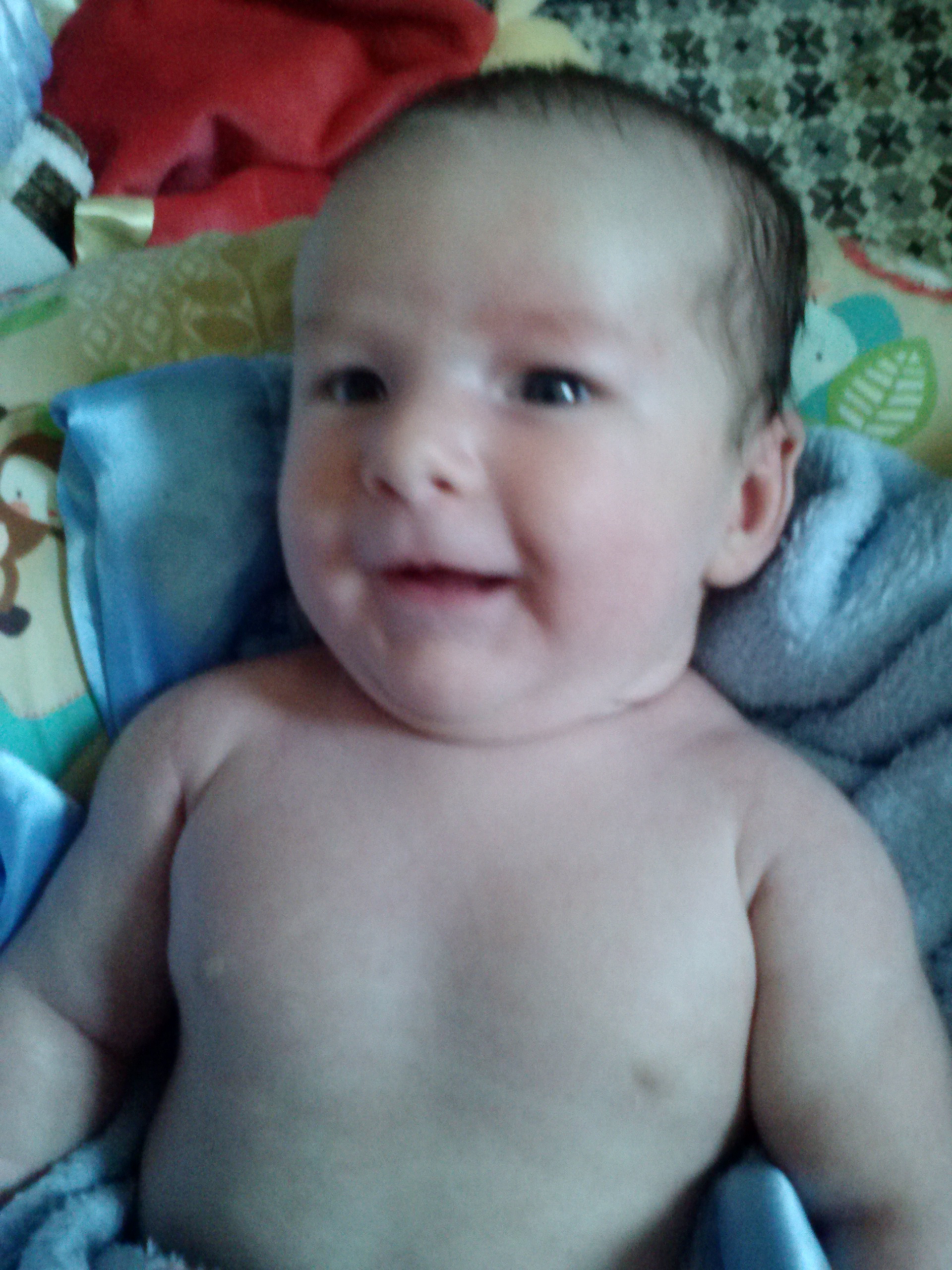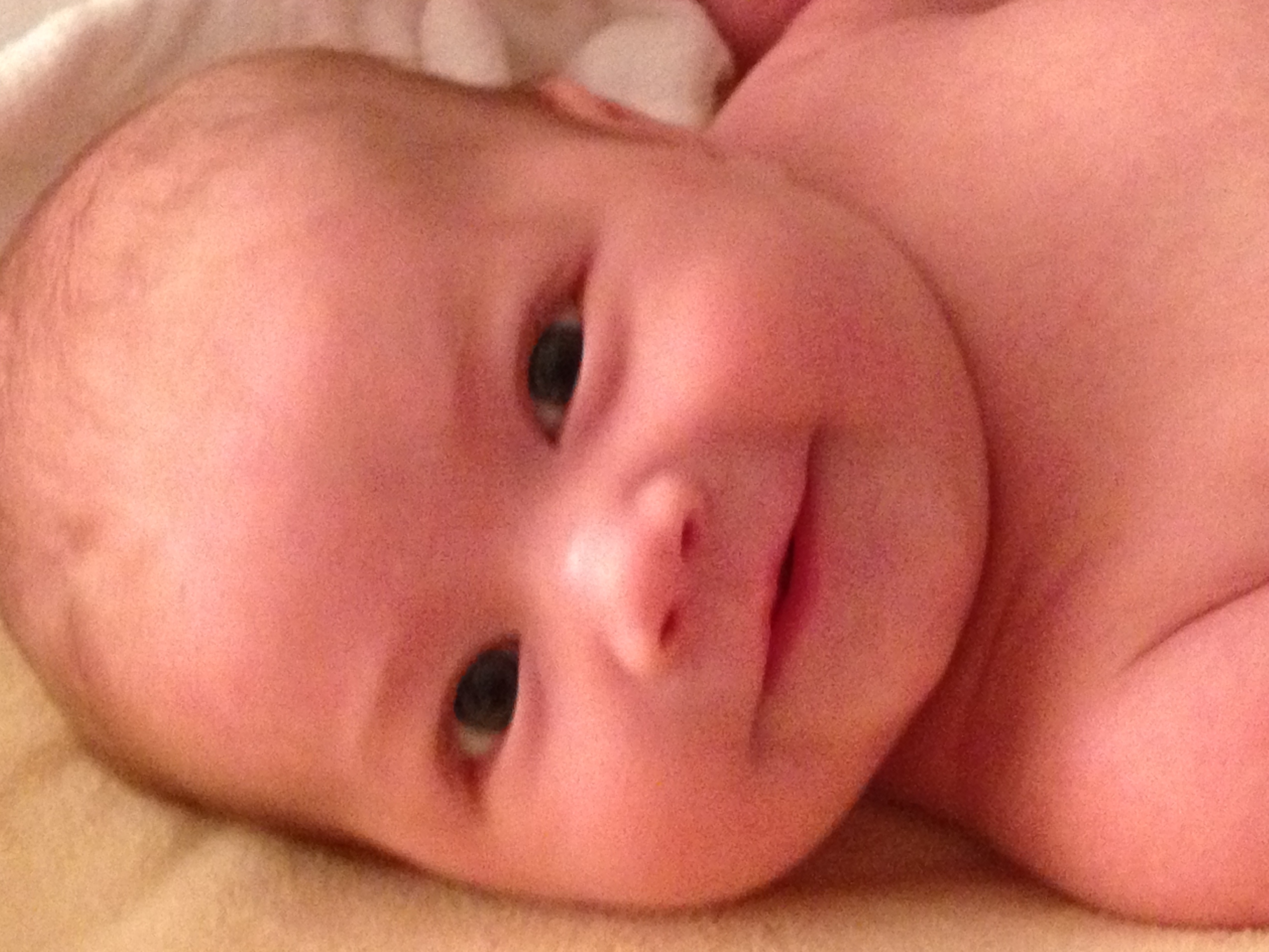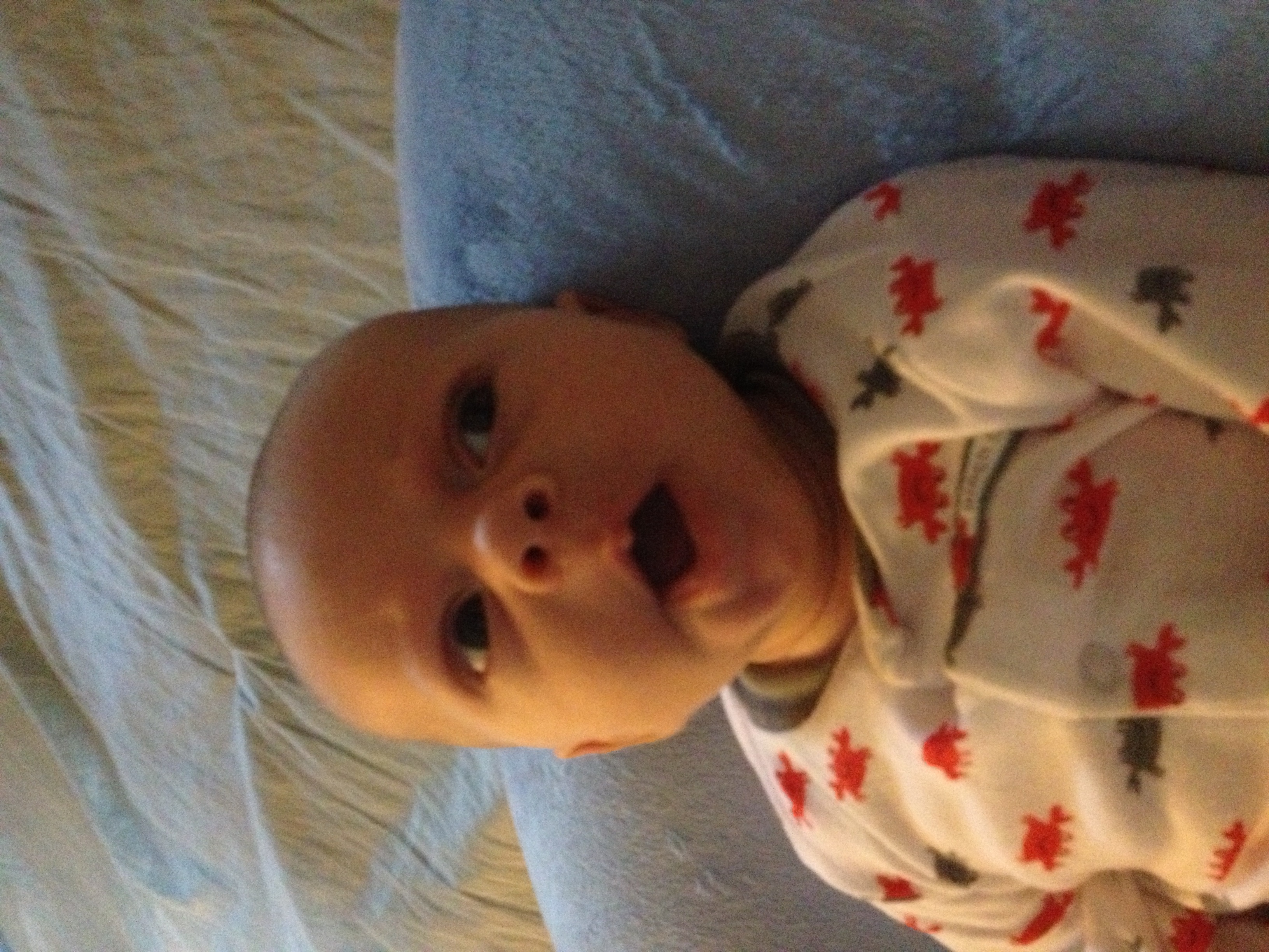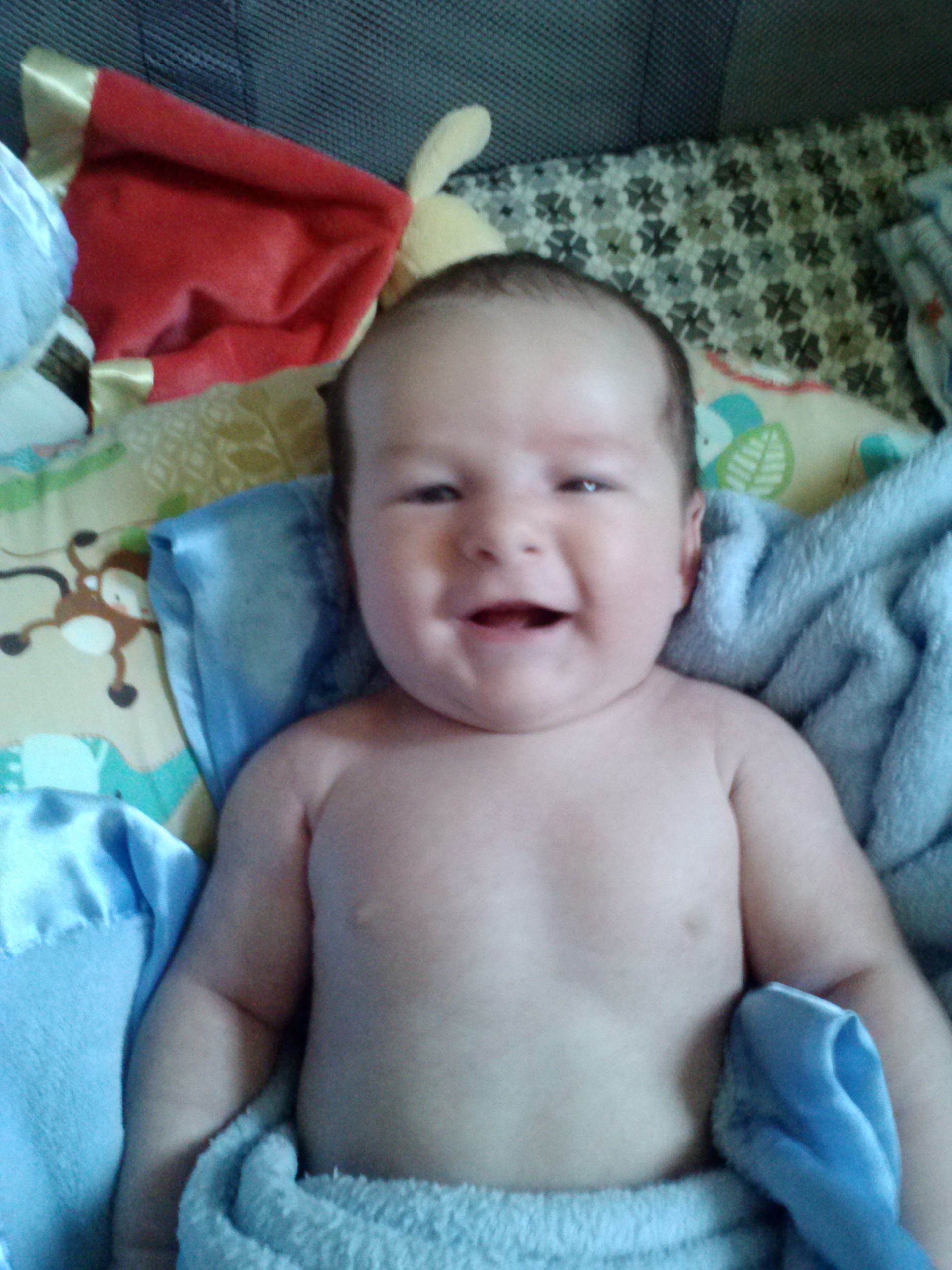 My lil man will be 6 weeks tom and is about 10lbs now. I was finally able to catch a smile on camera... 1st pic was the end of a smile, 2nd was a smirk with his tounge out and 3rd was a big cheesy smile!