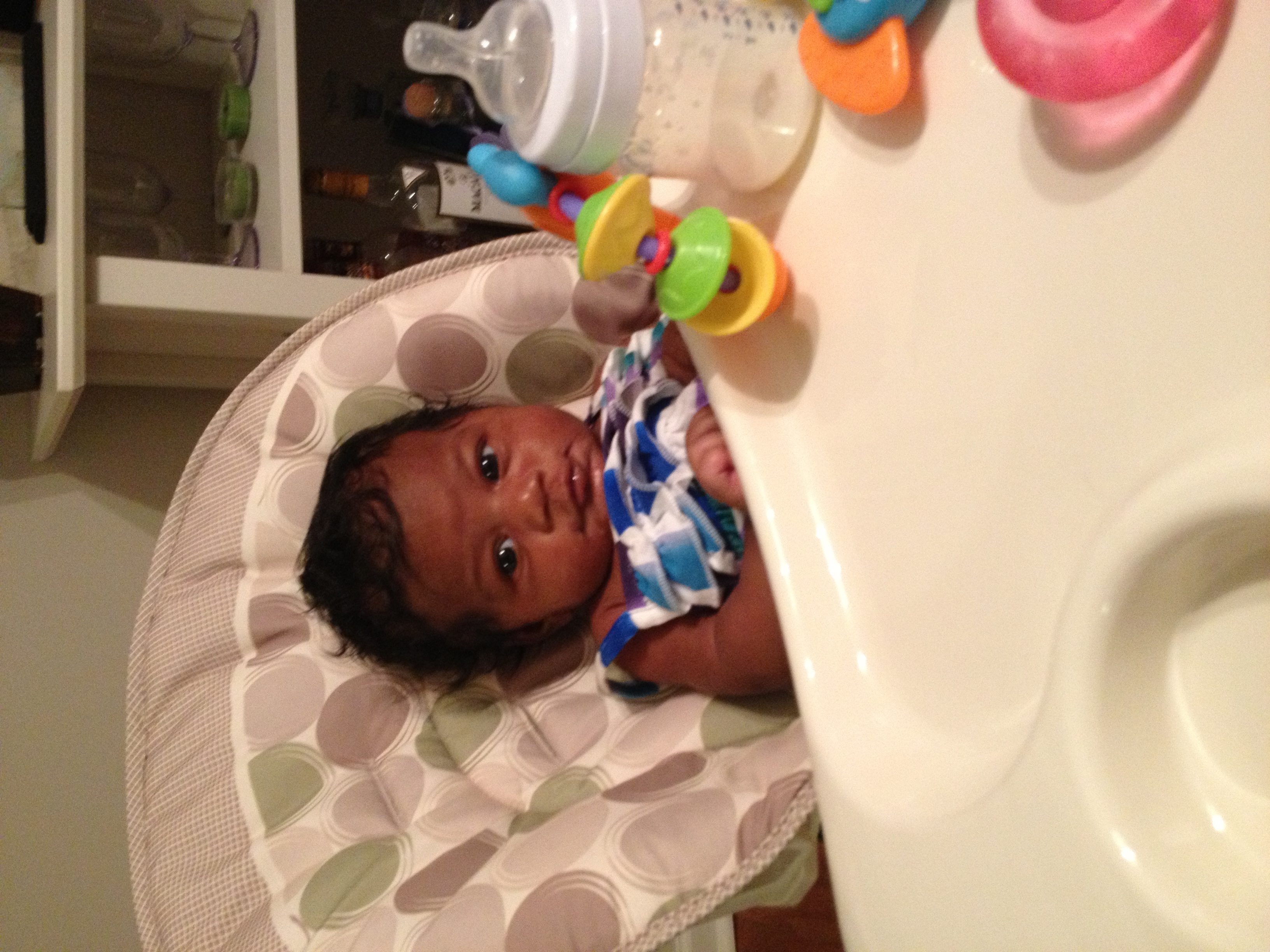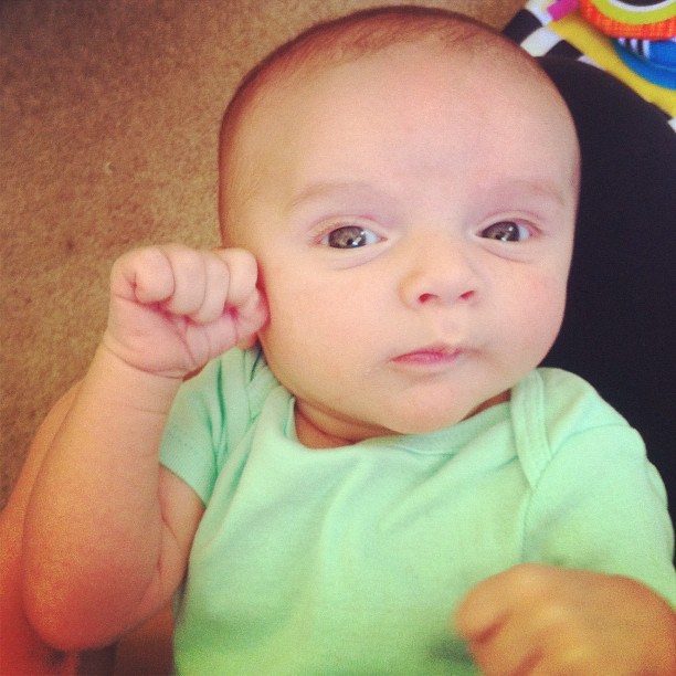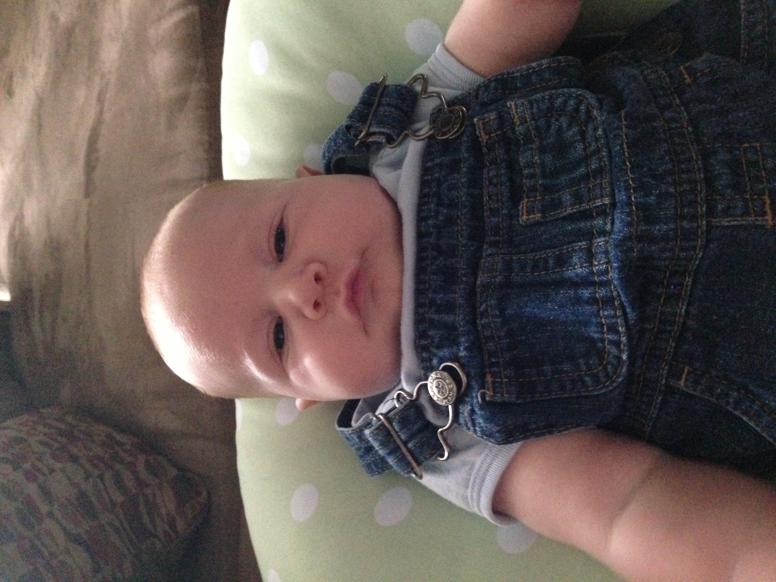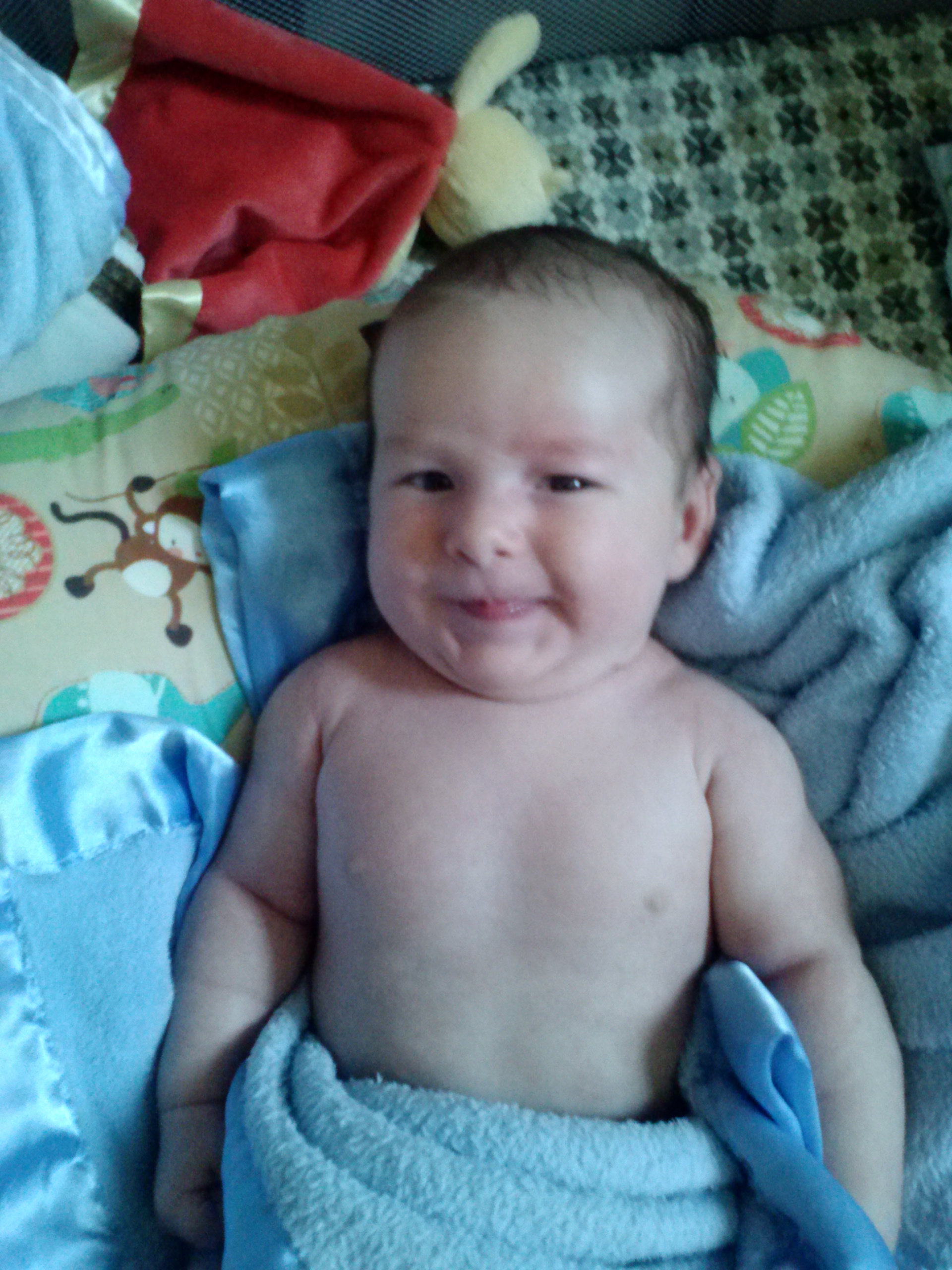 My lil man will be 6 weeks tom and is about 10lbs now. I was finally able to catch a smile on camera... 1st pic was the end of a smile, 2nd was a smirk with his tounge out and 3rd was a big cheesy smile!