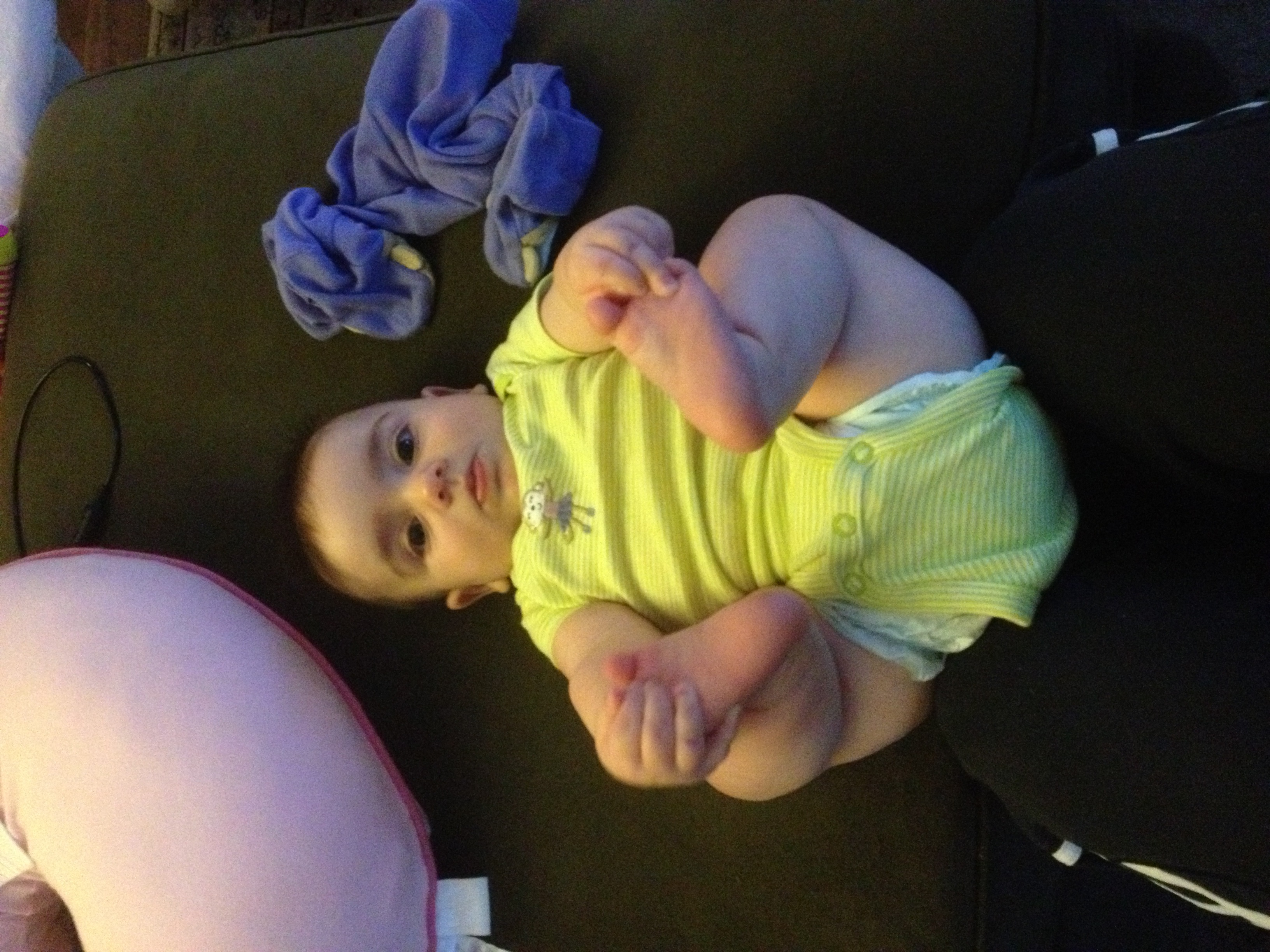 She found her feet the other day and if she is laying down, she is hanging on to them! So cute!