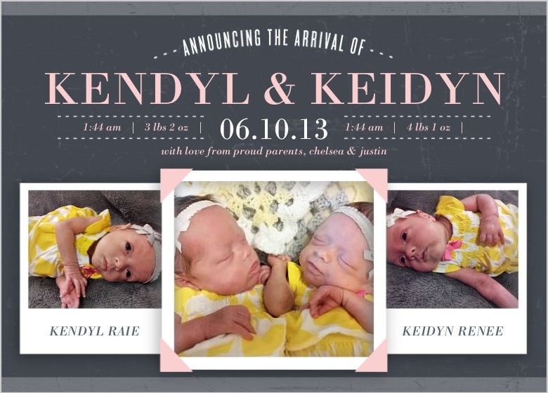 In December 2012 my amazing boyfriend and I found out that I was not only pregnant, but pregnant with mono-di twins! We were definitely shocked, but doubly excited! My pregnancy was actually very easy. No morning sickness, mood swings or absurd 3am food cravings. At 29 weeks I was put on home bed rest as my blood pressure had spiked. At 32 weeks I went in for my routine weekly Dr's appointment and all was well, that is until she checked my cervix at the end of the visit and determined that I was 2cm dilated and 90% effaced. Off to the hospital to be admitted I went! I was put on a magnesium IV to slow contractions and did the 48 hour steroid shots. About 5 hours after clearing my steroid window, the Dr's decided that there was concern in the way that Baby A was responding to the monitors and determined it would be best to do an emergency c-section right then. The whole night was a blur, but at 1:44am on June 10th Kendyl Raie was born 3lb 2oz and Keidyn Renee was born 4lb 1oz.