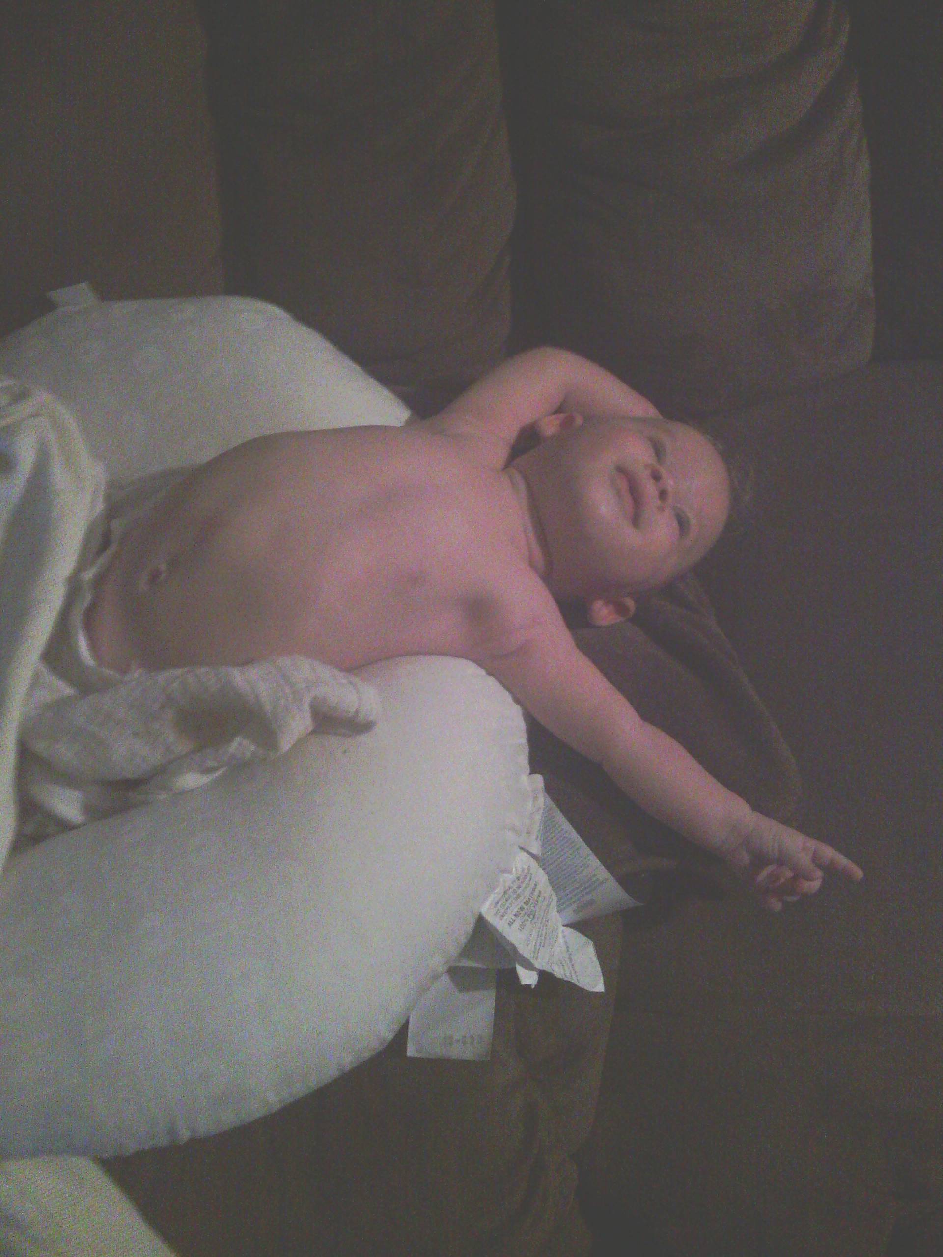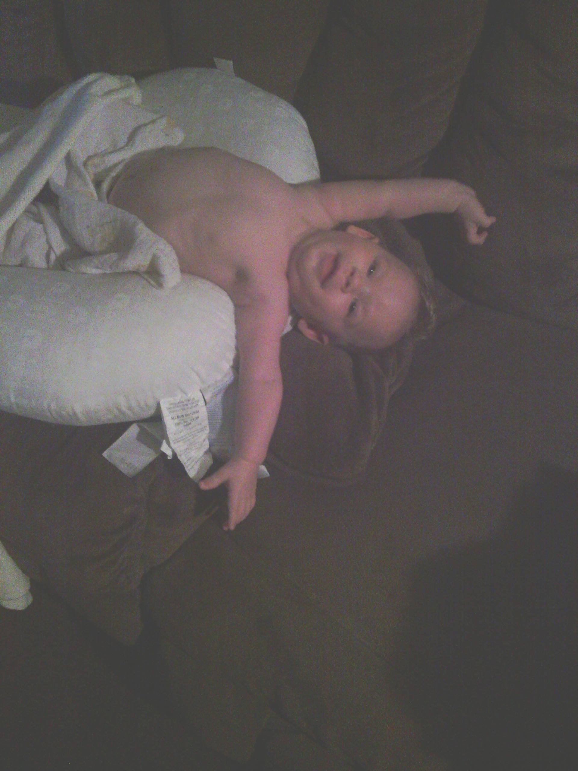I am feeding him, hoping he goes to sleep and he starts doing this.. for the past few days now he has been trying to hang upside down while I am holding him... and doing it on his boppy (which is why there is a pillow under it in the picture).
