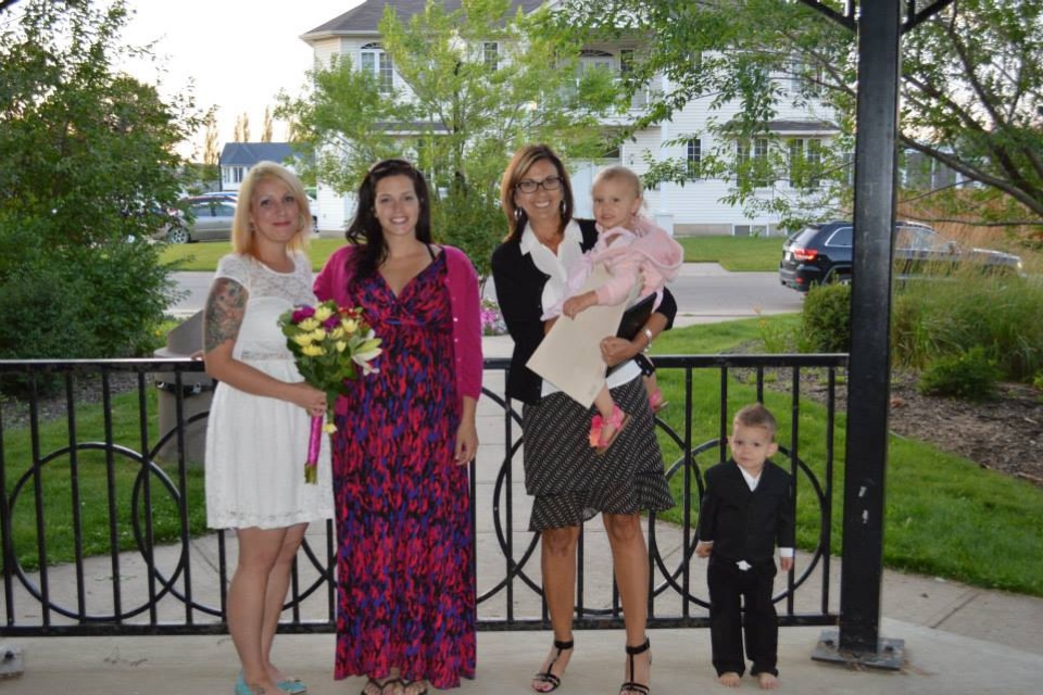 This photo was taken yesterday with my goddaughter. Also, I went from blond to brown! Ah!!