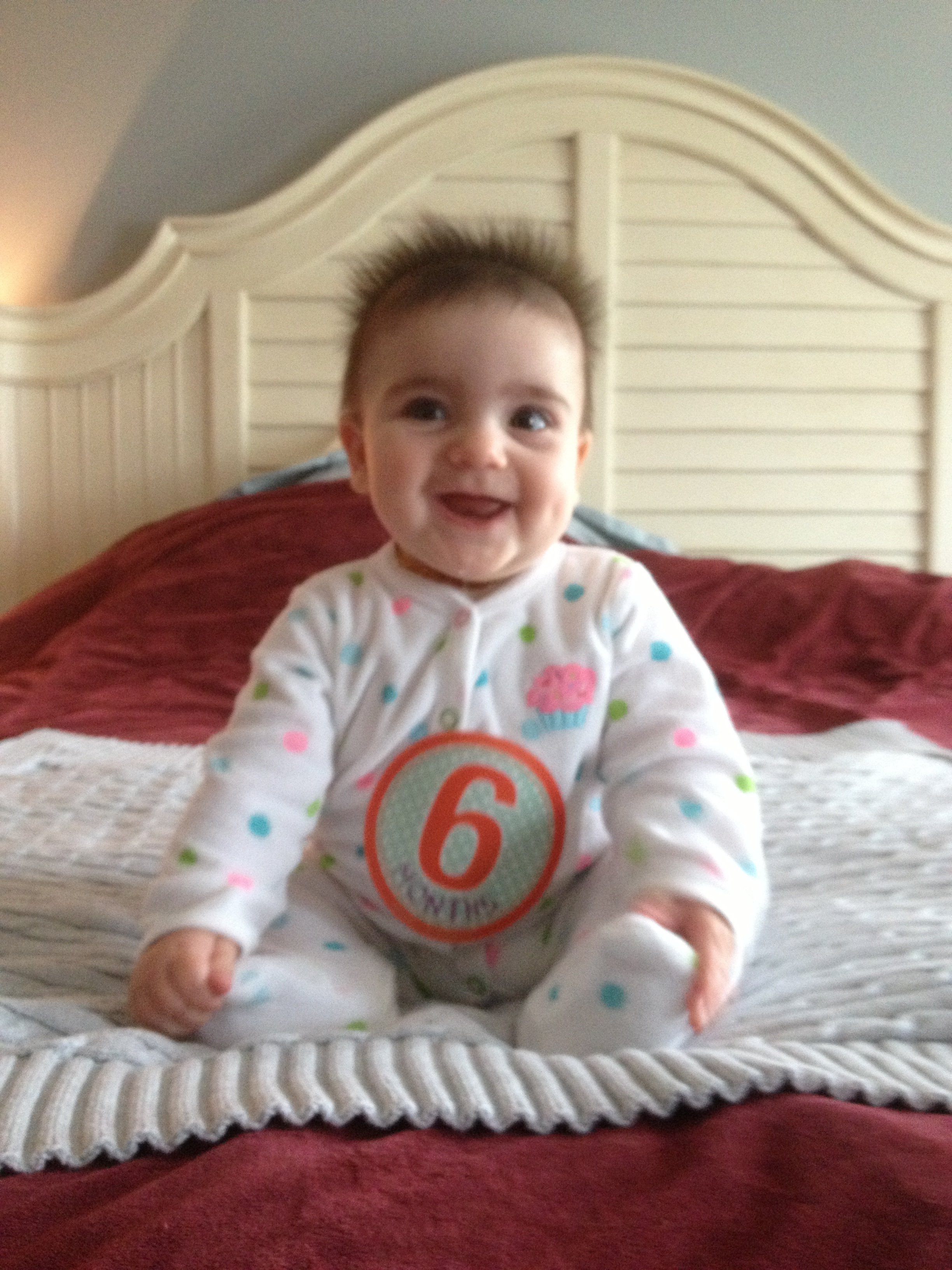 A is 6 months old today! I can't believe how fast it happened. She has figured out how to sit on her own and she has wild hair!! I love (almost) every second. She is such a snuggle bug, but sometimes just setting her down so I can pee induces hysterics. It's so amazing to see her watch the world. She tries to pet our dogs and she laughs at them when they play. She wants food in the worst way! We are going to do BLW and I think we will start on Thursday so DH can be home too.