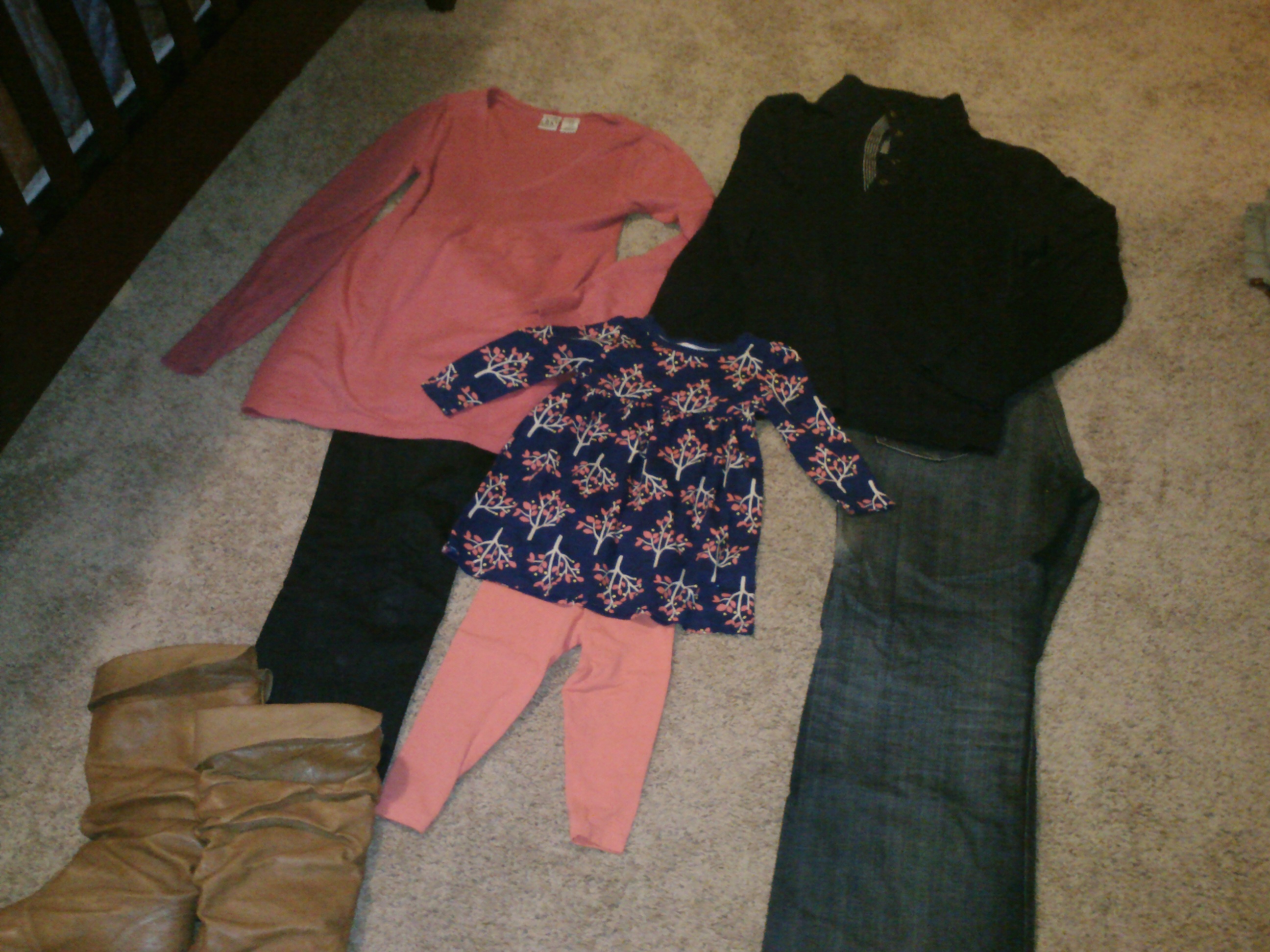 this dress with pink leggins and tan ugg boots. DH and I are wearing dark jeans, me with either a yellow and white striped top and DH with a yellow polo t shirt. My other option is I wear a solid coral top, but I'm worried it will be too bright. What are your thoughts on my wearing a striped top with the dress I want DD to wear? Other suggestions welcome...
