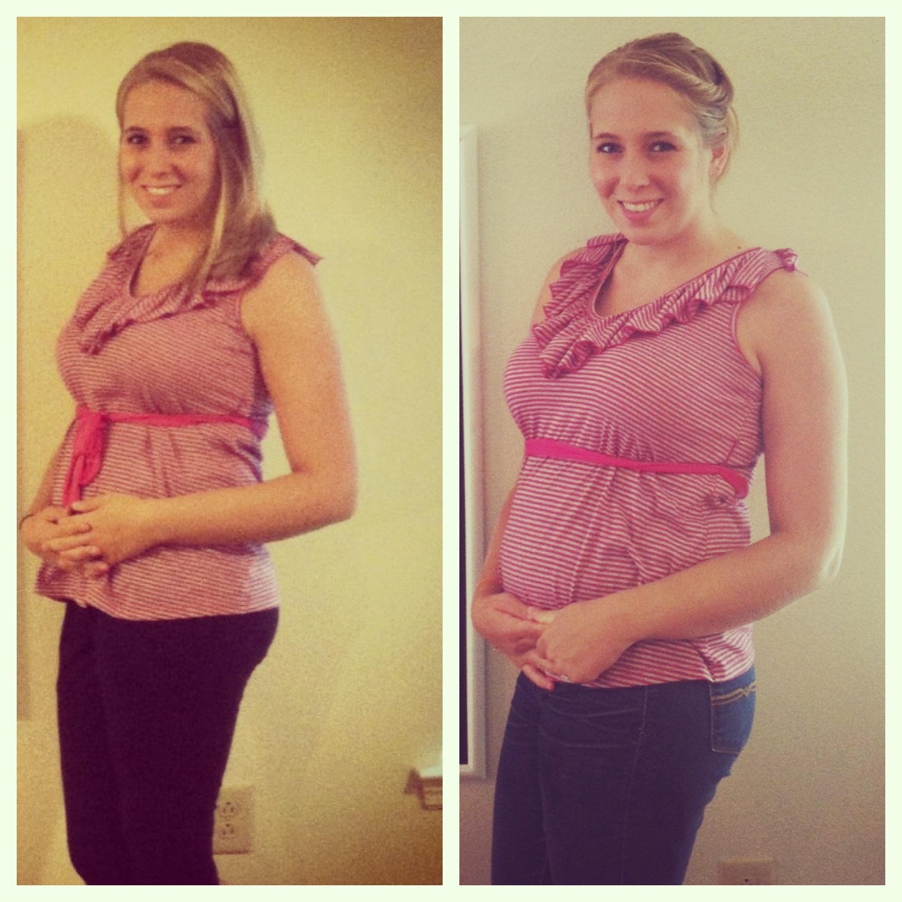 The first picture was taken at 4 weeks, 1 day (Yes, I'm in a swim suit, don't judge Lol) and the picture on the right was taken on Monday at 11 weeks. (I blacked out our last name).