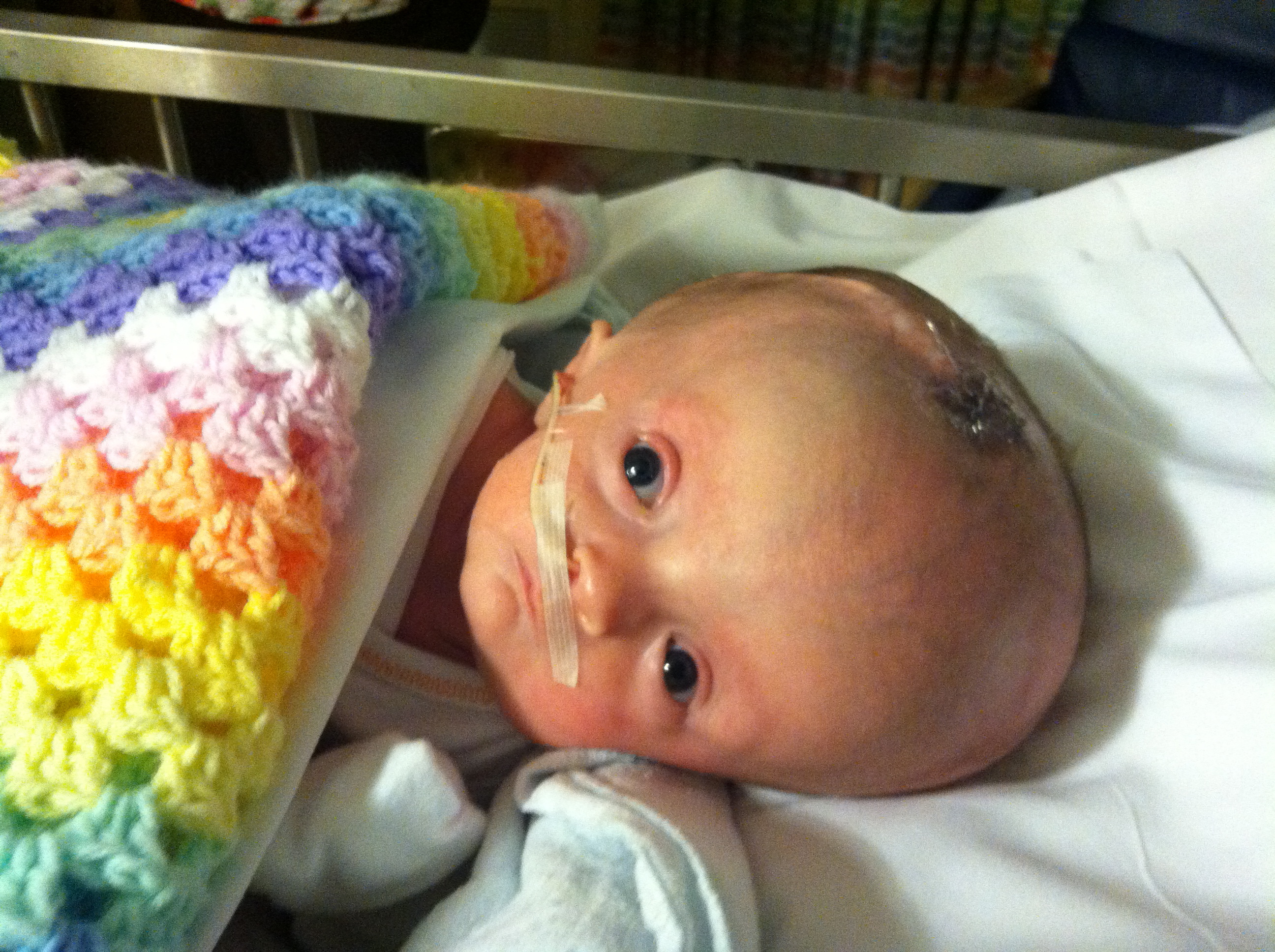 She had a surgury to put in a shunt to drain the fluid two days after birth, and when she couldn't eat enough on her own, she had surgery to put in a feeding tube on September 11th.
