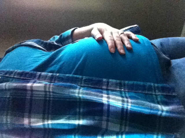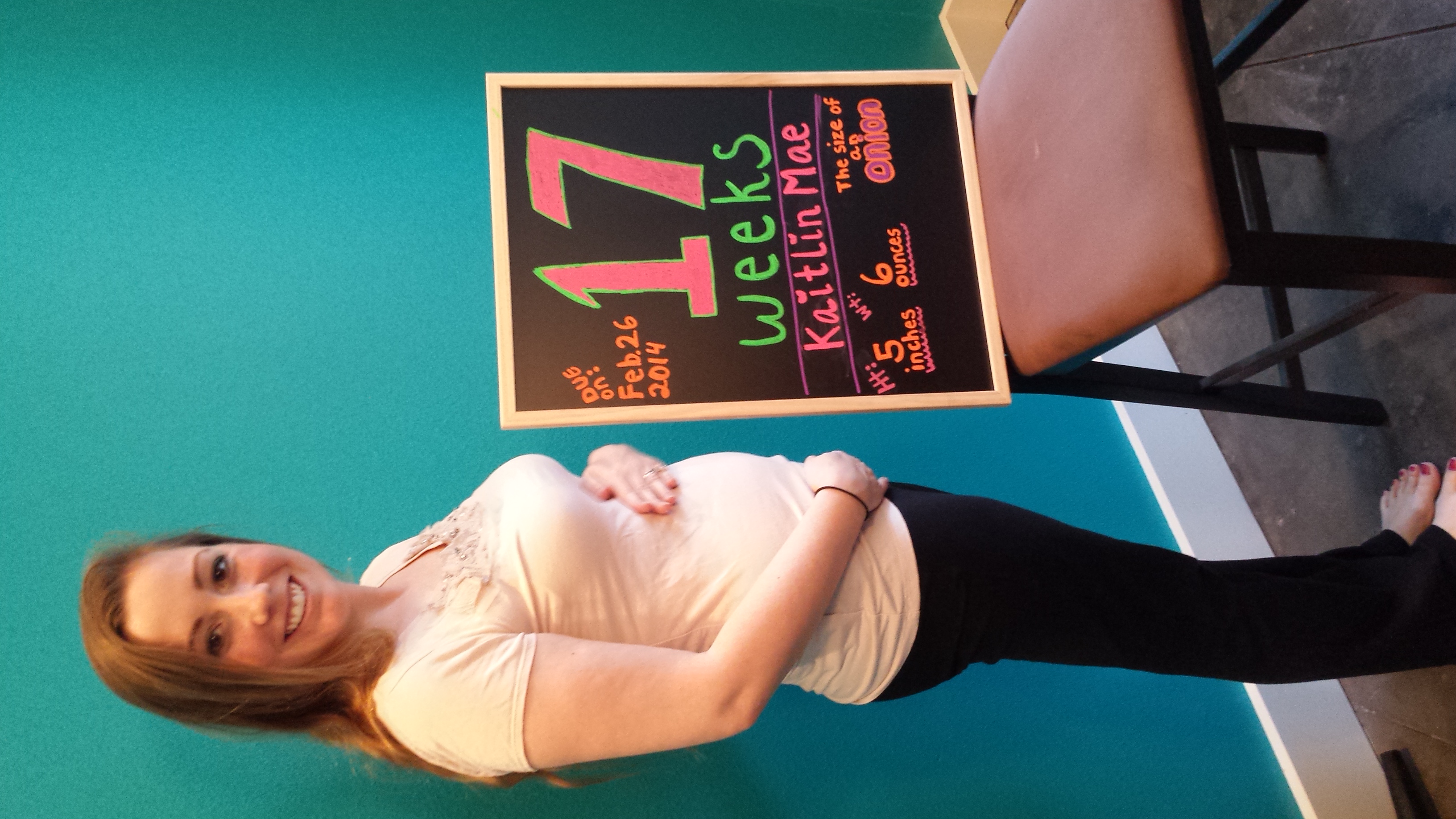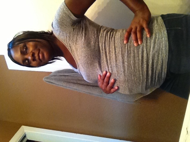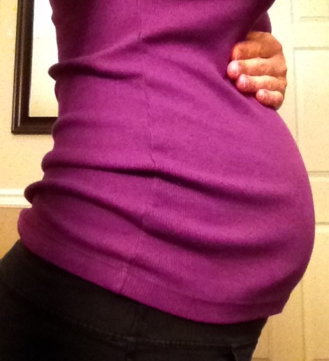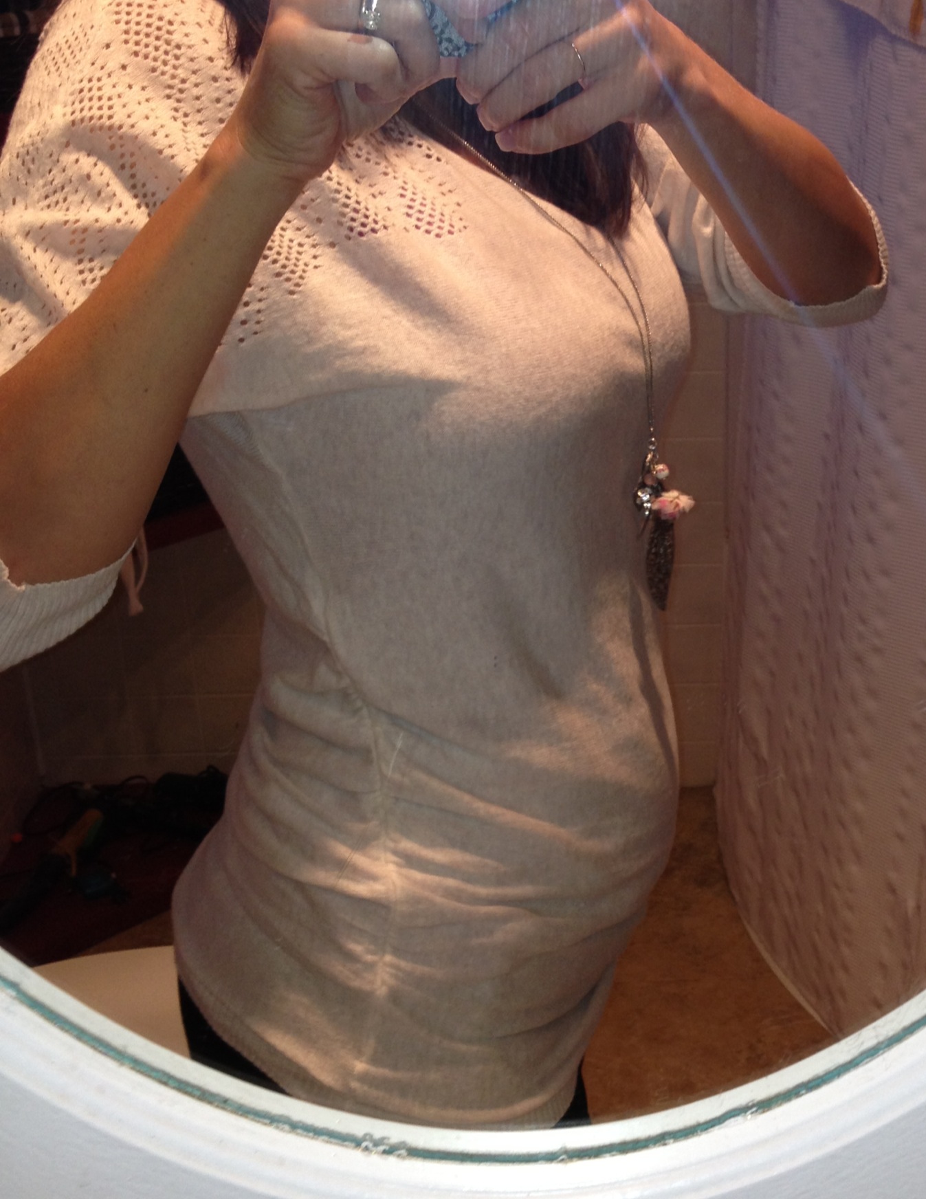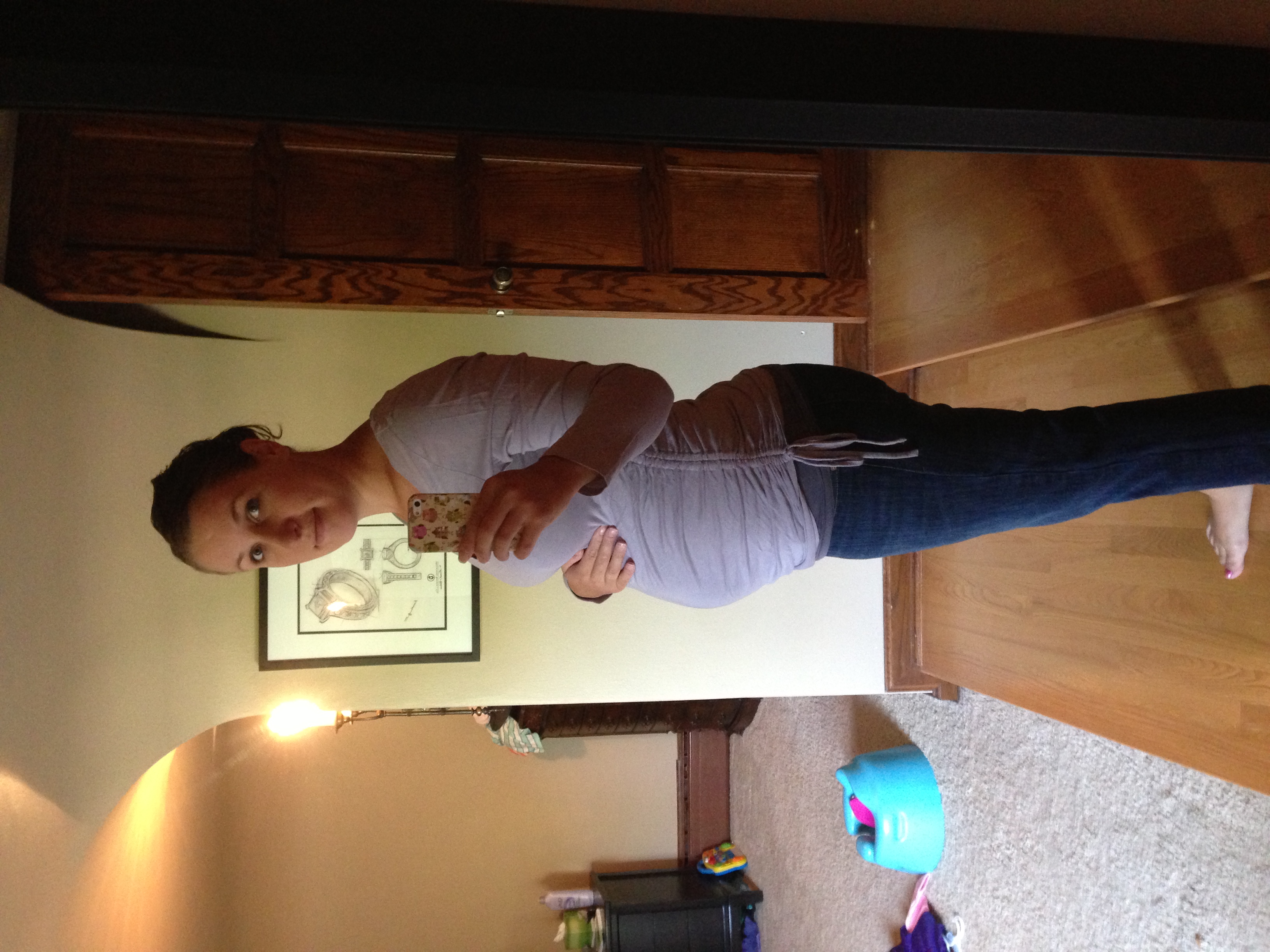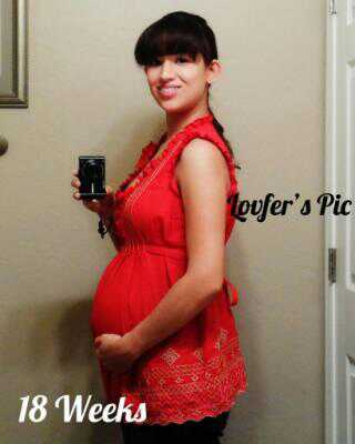 18 weeks 4 days. Bad picture, running late for work. My baggy shirt is hiding the belly, but it's getting big! As of yesterday, people are finally noticing the belly.