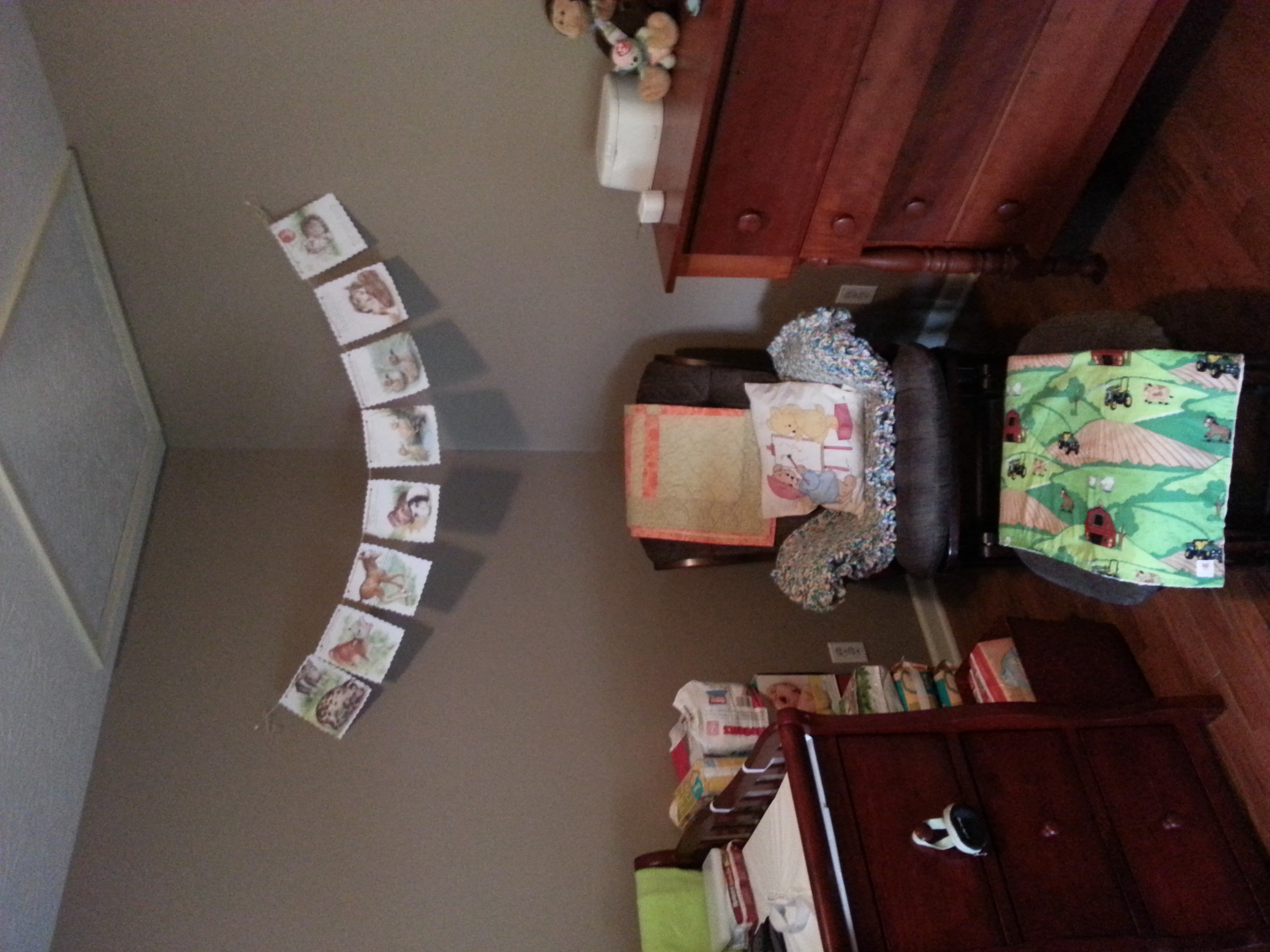 Here is our little boy's nursery. Not too fancy and I still have a few things left to do - curtains and a couple more pictures, but here it is. I have had a bunch of ladies make me homemade quilts so they are spread everywhere as of right now!