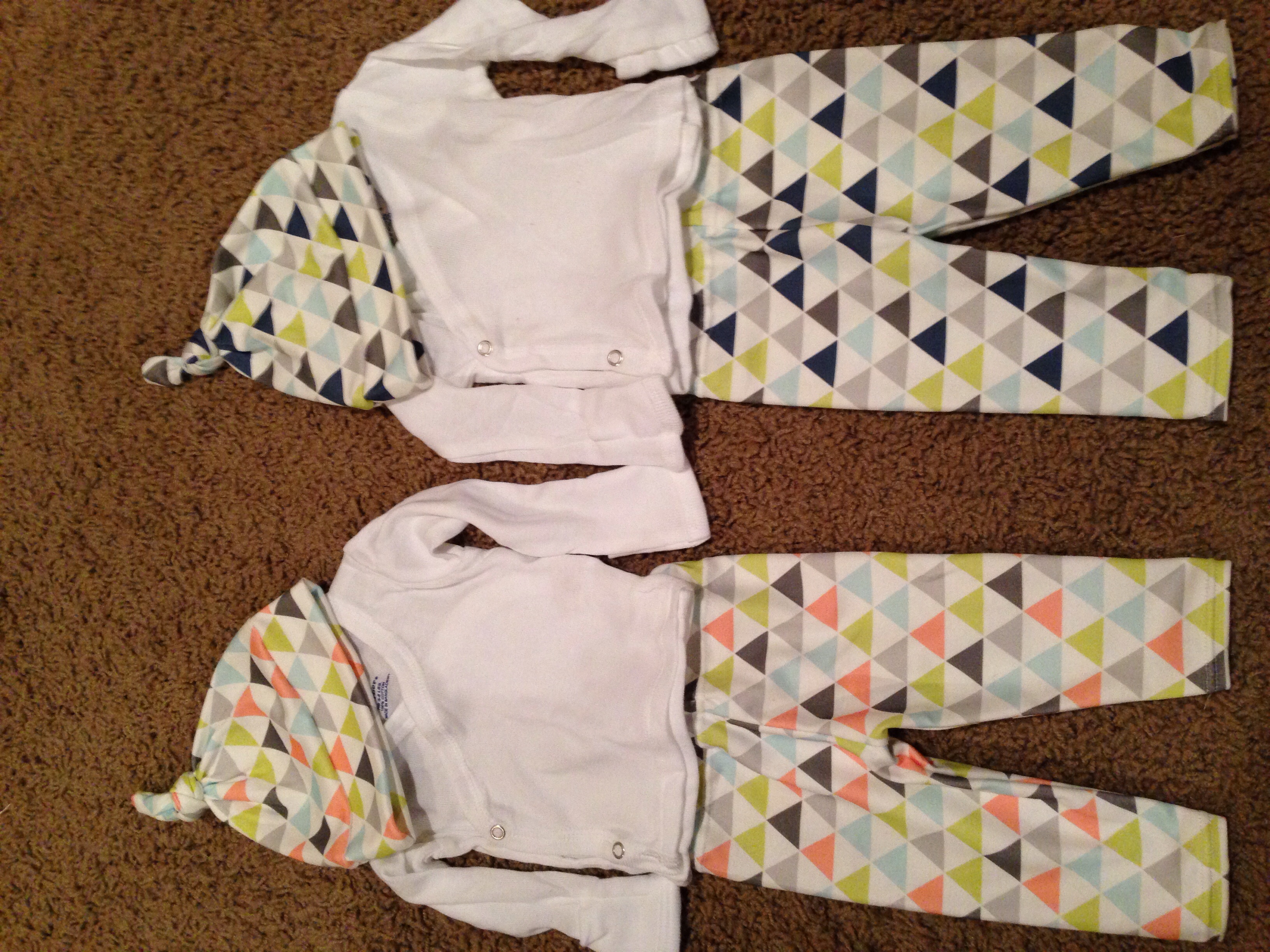 After not being able to find something I loved for bringing home baby (just don't love all the cutesy baby stuff), I decided to just make some pants/hats (we are team green!) and pair it with a side snap shirt. Love how they turned out. Now we just need baby