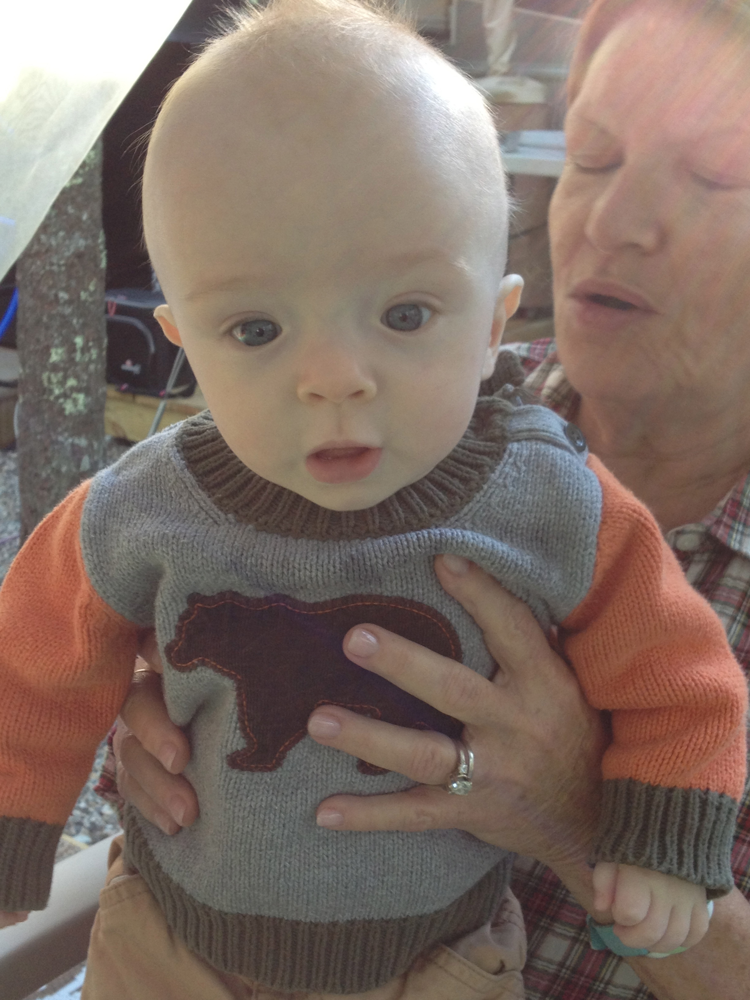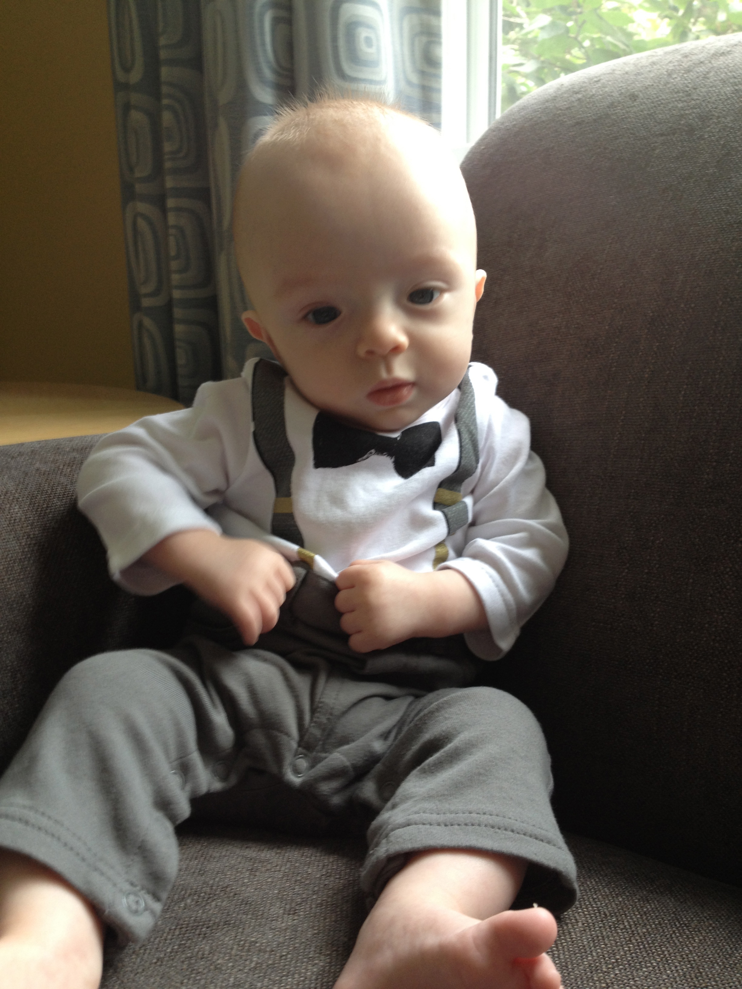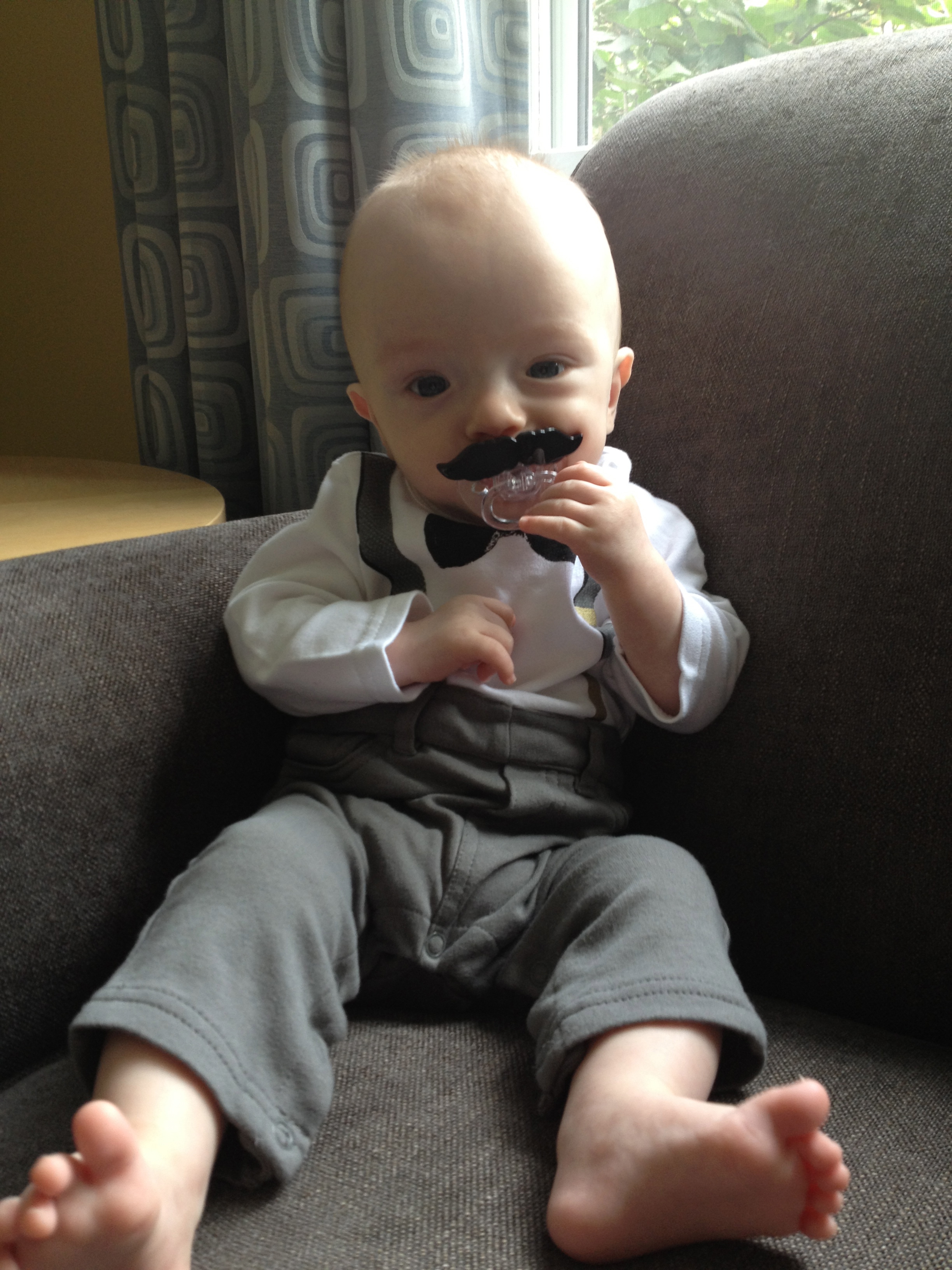I could not pick just one. My BIL sent A the outfit and the mustache binky. The other pic is from a get together at my in-laws last weekend (my MIL would probably like me to have not used this one since her eyes are closed, but A looks so cute!)
