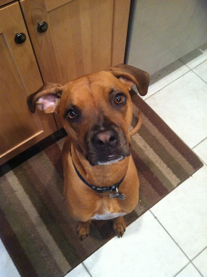 • This is Devi. She is a lab/boxer mix we rescued as a puppy. My husband and I are nervous for when the baby comes because she has been #1 for the past 3 1/2 years.