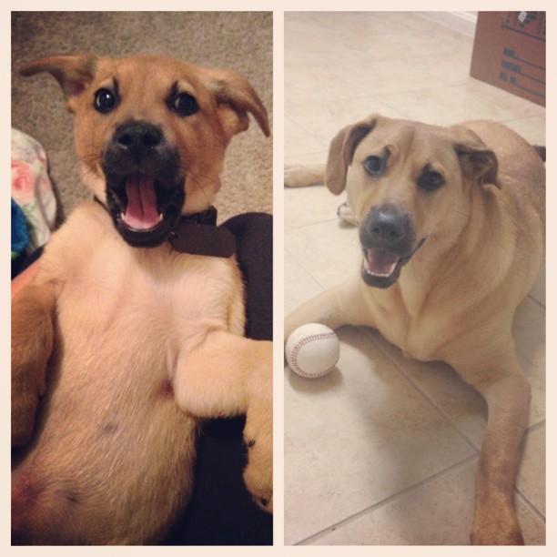 • This is my baby boy Tyson! On the left is when he was a puppy and the right is more recent. Not sure what he is because we adopted him from an SPCA. I love him to death but currently he is farting up a storm and it makes this mommy want to throw up :( hahaha