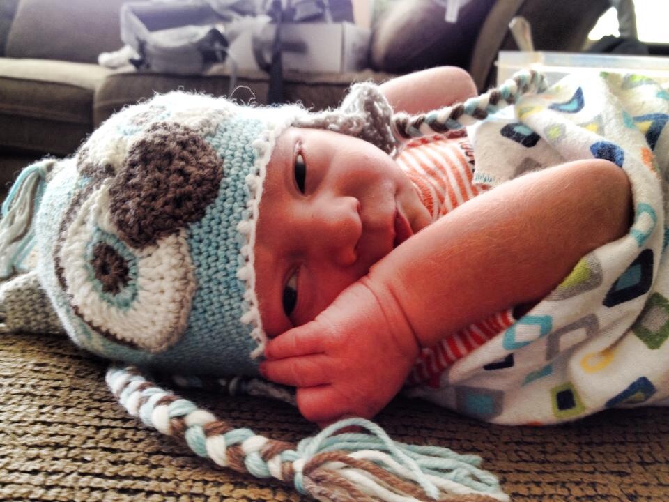 Here is baby Max (Maxwell Shane) modeling a sweet hat his grandma made him and another in his daddy's hands.