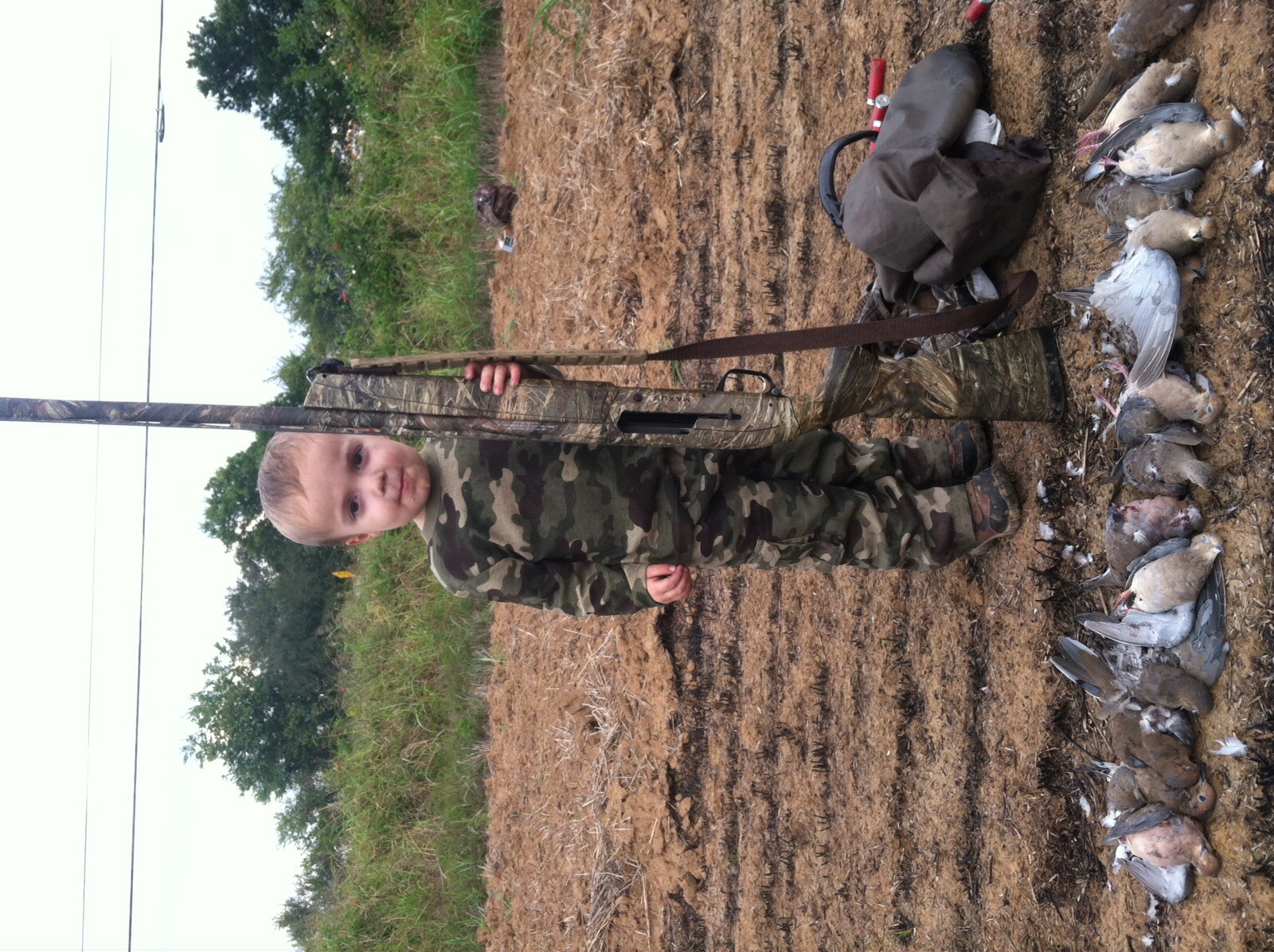 He's almost 3, and no the gun is not loaded also he was the bird dog, went and got all the doves dh shot... And yes we eat what we kill:() and he did wear very good ear protection:)