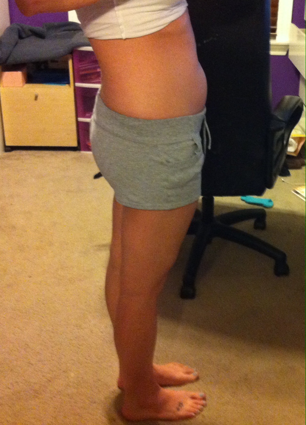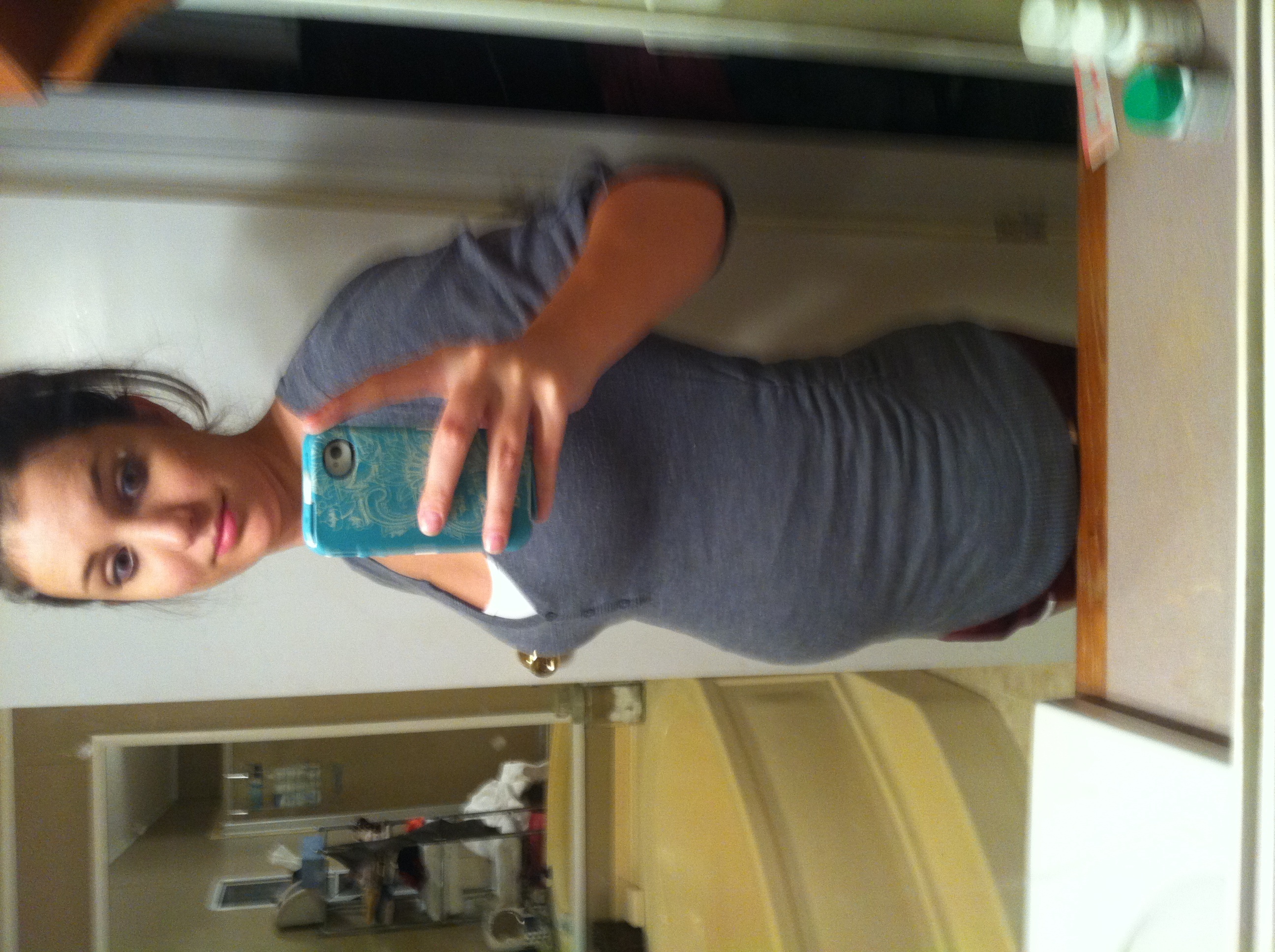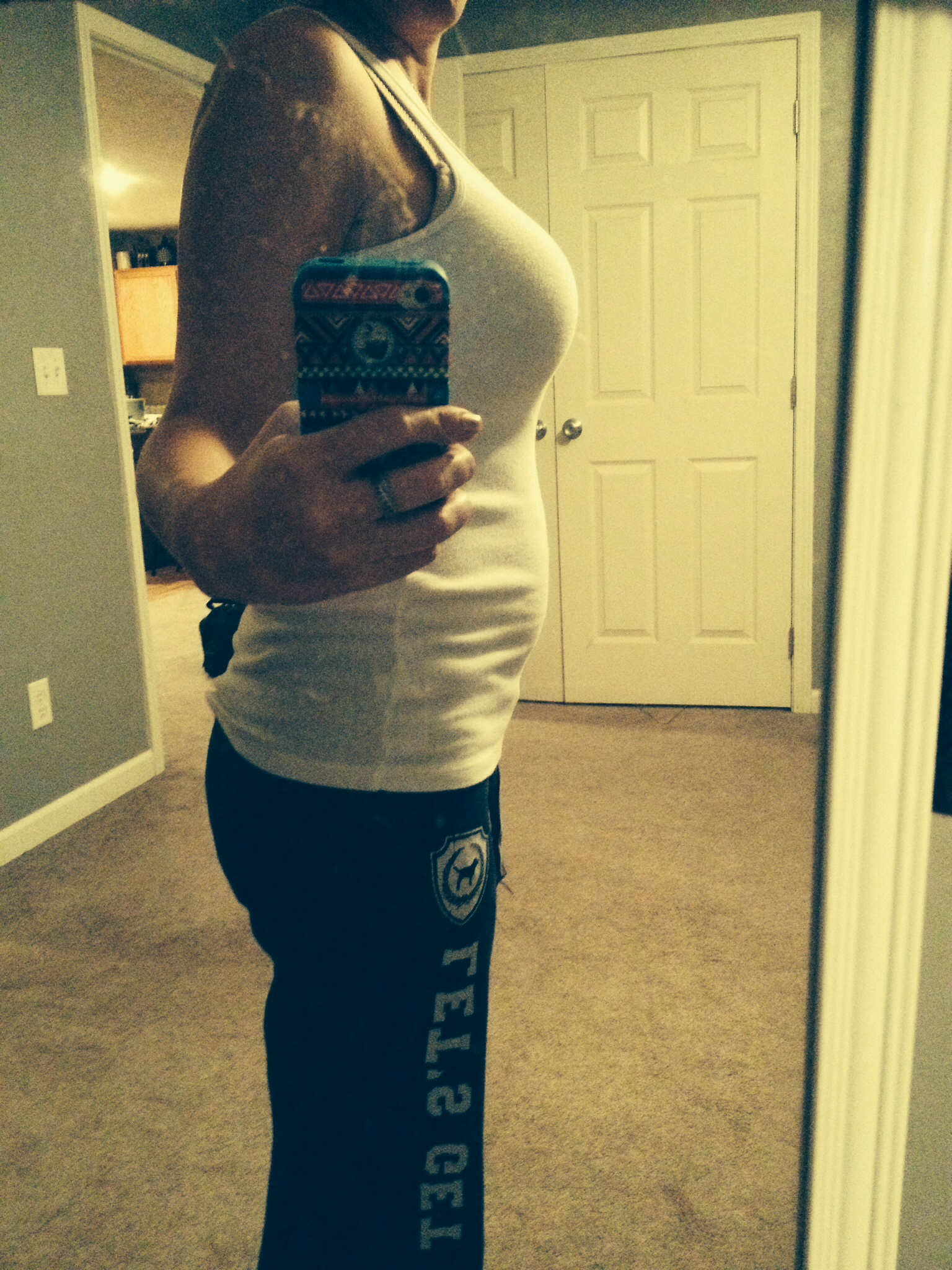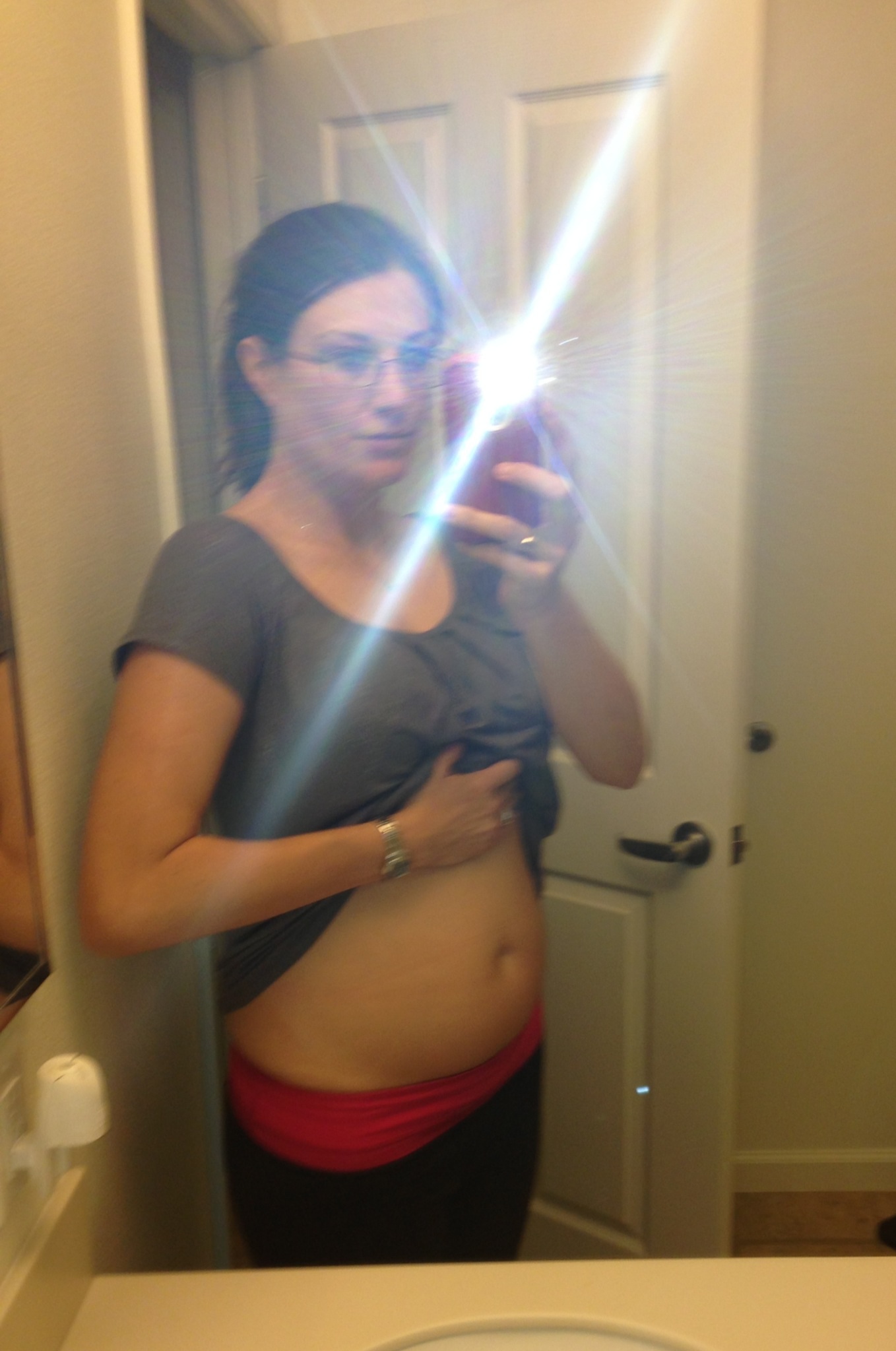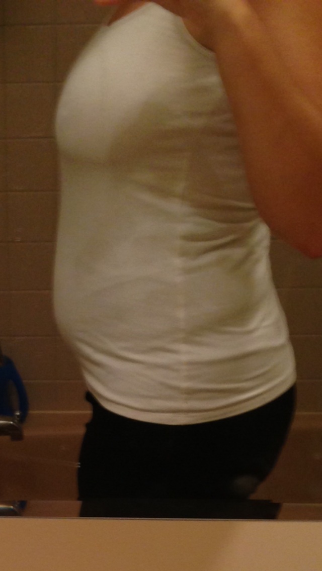 Disclaimer: I am fat, and not like, "oh I'm saying I'm fat so ya'll can make me feel better about not really being fat." It's just a fact for me at this point in my life. So I really haven't had anything to show since I already have a belly. So almost all of what you see is belly, but I'm posting because my pants don't zip any more and I haven't gained any weight, so I know I'm bigger, even if only a tiny bit! DH says he can't see a difference. But I feel it.