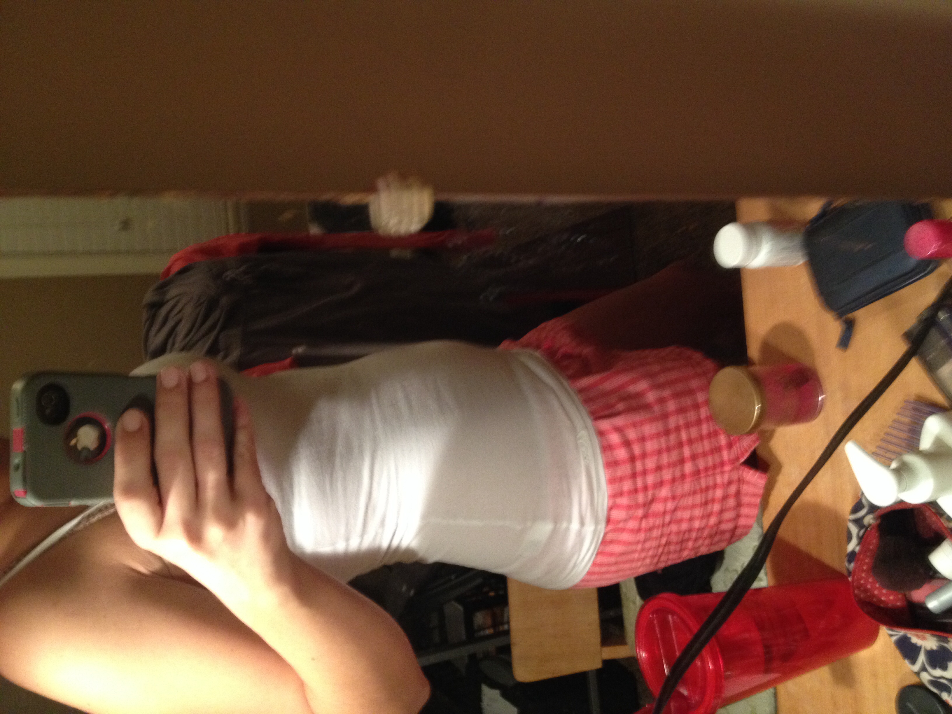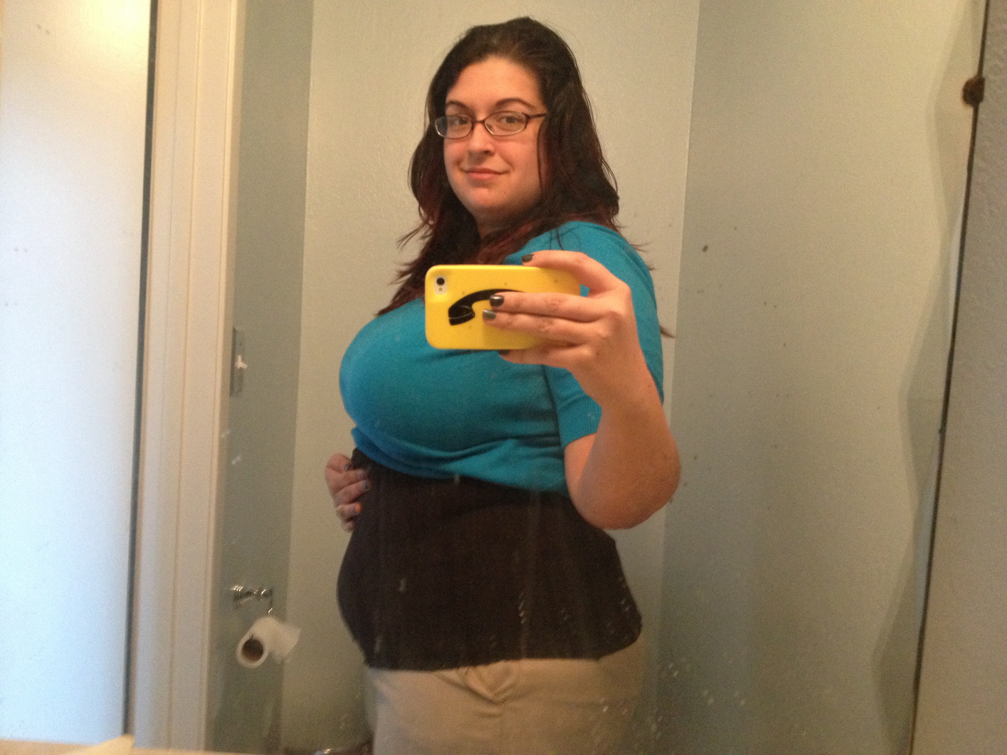 Finally feel like I've got something to show on here! Here's me rocking my Bella Band after work. Disclaimer: I am fat, and not like, "oh I'm saying I'm fat so ya'll can make me feel better about not really being fat." It's just a fact for me at this point in my life. So I really haven't had anything to show since I already have a belly. So almost all of what you see is belly, but I'm posting because my pants don't zip any more and I haven't gained any weight, so I know I'm bigger, even if only a tiny bit! DH says he can't see a difference. But I feel it.