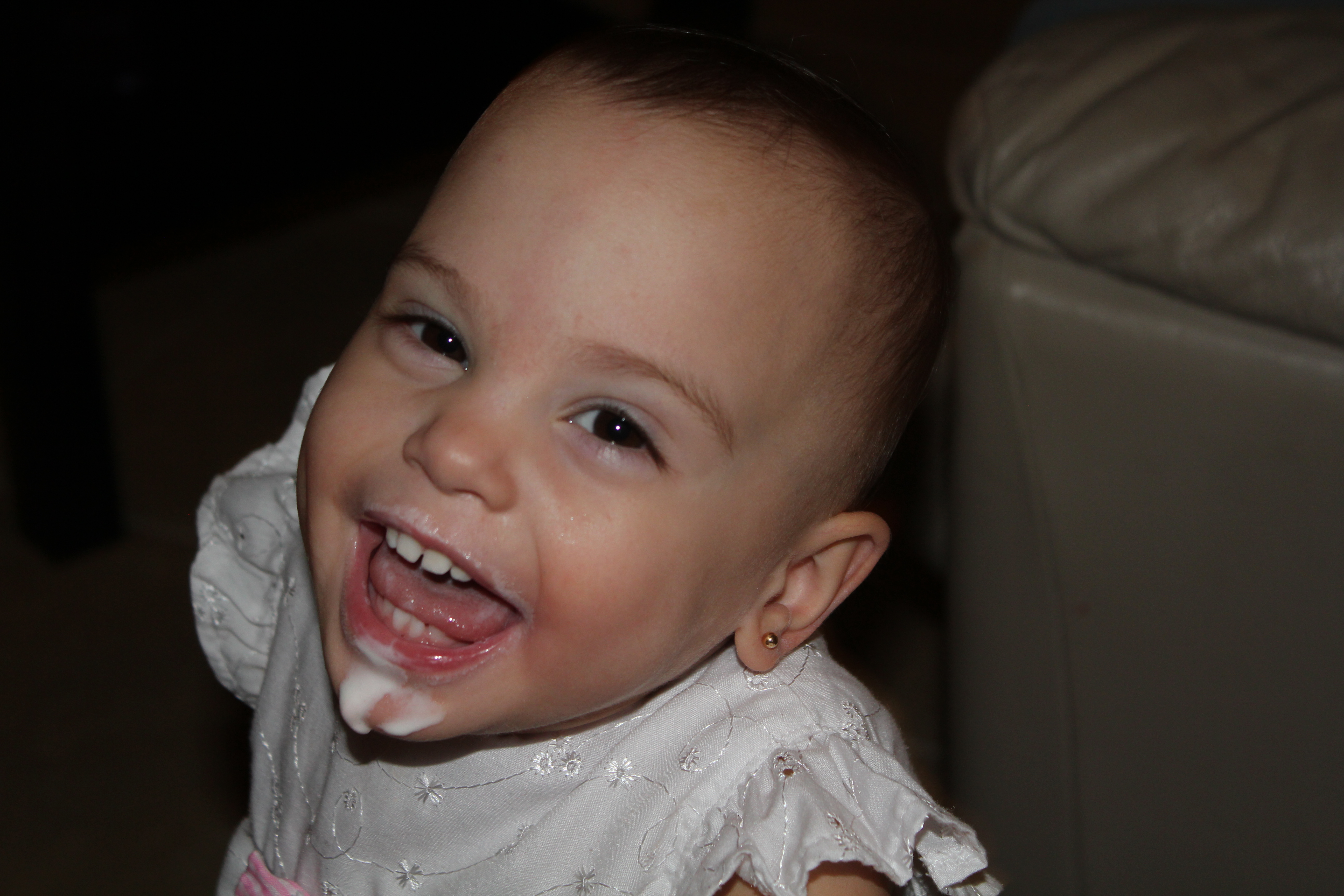 Here is my baby girl after eating a red velvet cupcake at a birthday party. We are still working on neatness, but she is having fun-she loves chocolate! She is around 23 lbs, and she is walking more-she only occasionally still walks on her knees. We are still working on words--she will say Uh-oh.