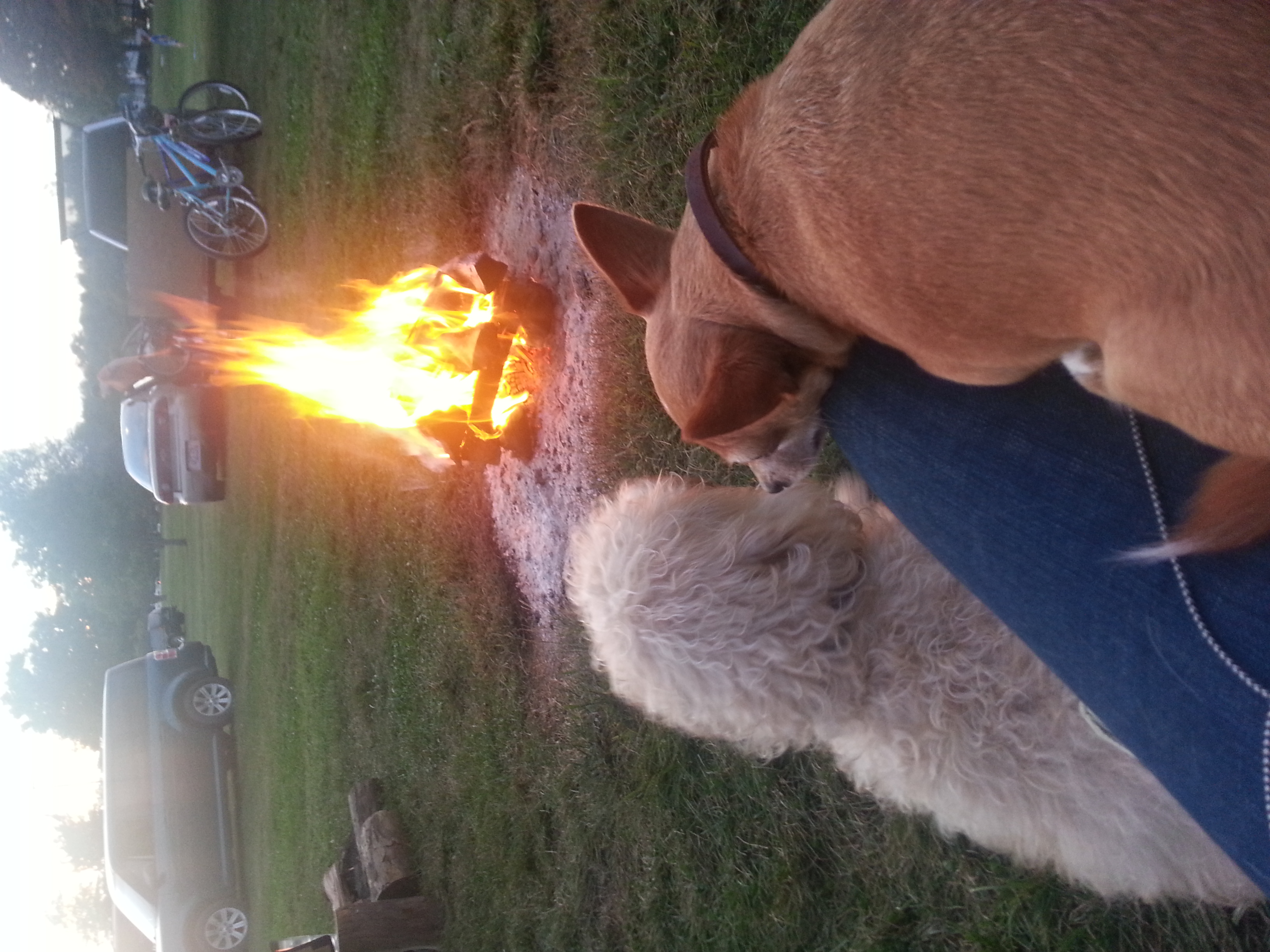 I'm late But here are my babes. Topper totally side eying me after I woke him up taking pictures of him sleeping. Cooper enjoying a puppy latte. Both sitting by the camp fire.