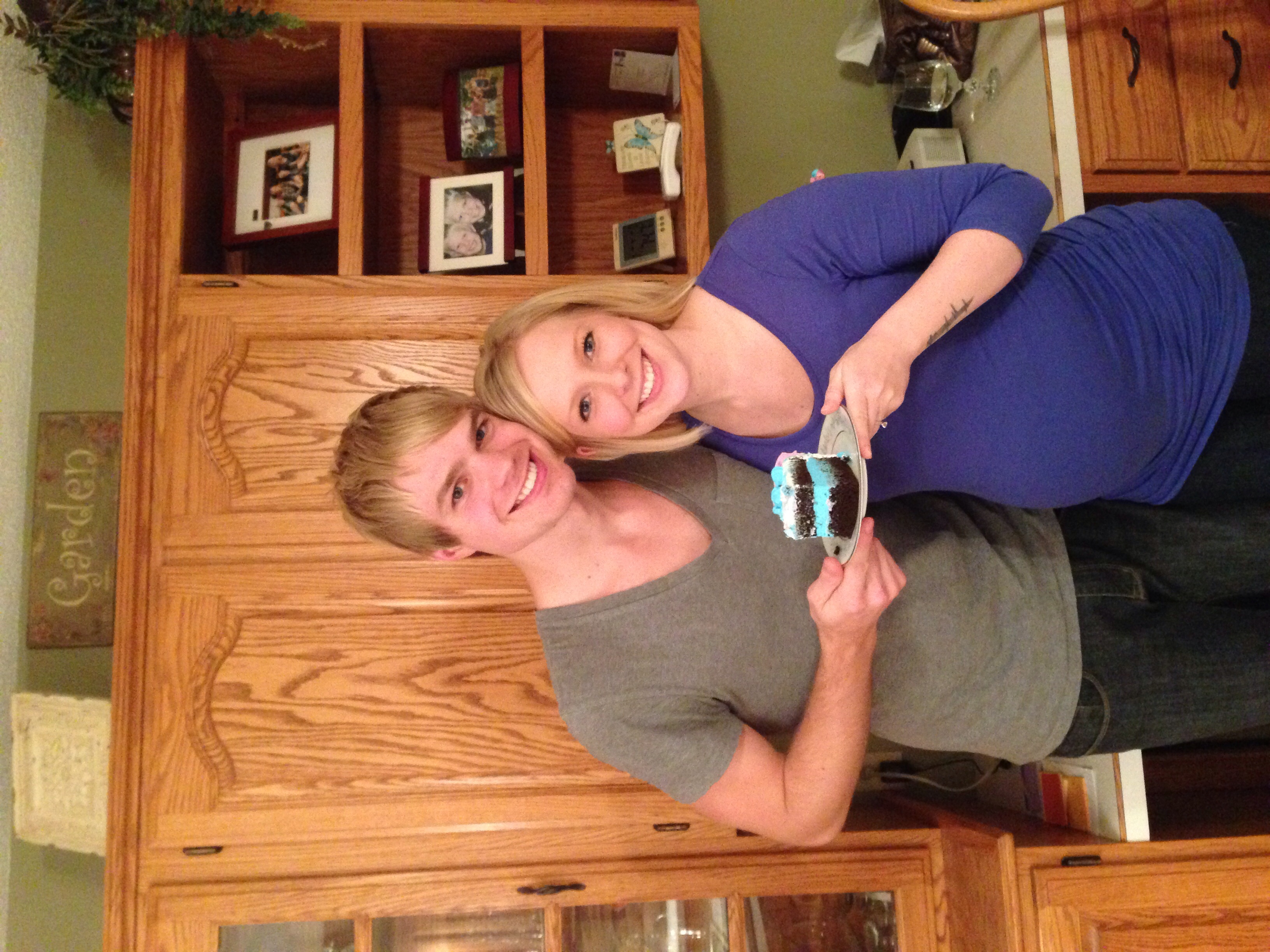 BLUE! We had a party with our immediate family and cut into a cake with blue filling! How exciting!