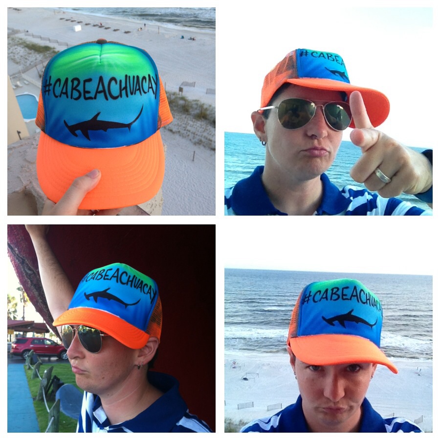 I find tacky things hilarious. So, when A and I went on vacation to the beach in Alabama, naturally I needed something airbrushed. Not just a t-shirt or a sand dollar, but something REALLY tacky. So I settled on a custom neon orange hat with a shark and the hashtag (#cabeachvacay) (C and A Beach vacation). It doesn't get tackier than that.