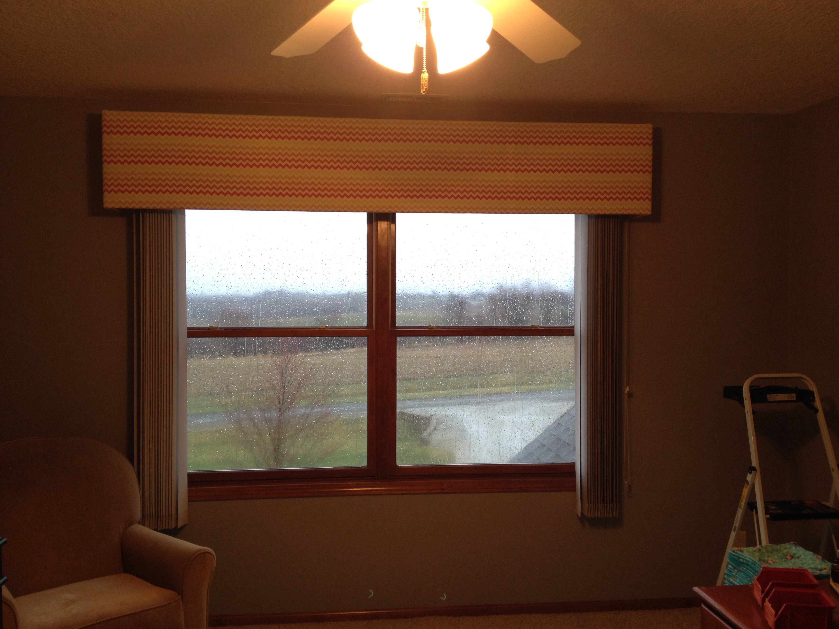 • Not the best picture as this room is hard to get good ones. DIY 8' x 16" window valance. It's yellow and various shades of orange chevrons.