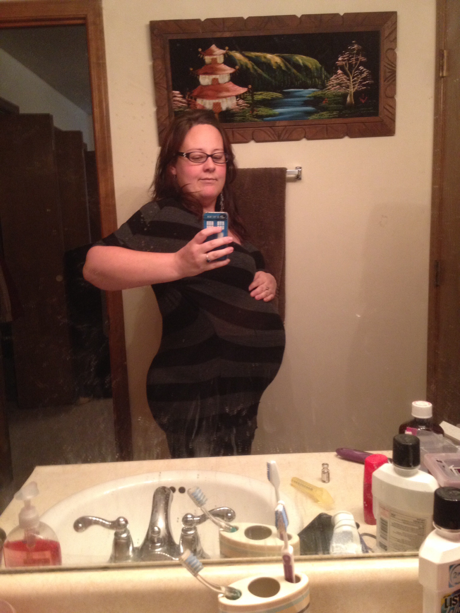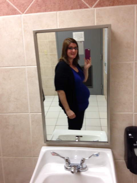 STM, 27 1/2 weeks...Yes, I am back to standing on my toilet again...It is getting harder and harder to heave myself onto the toilet lid, so I might have to suck it up and climb the stairs to my full length mirror I took this real quick this morning before I left. I call it "casual stripes".