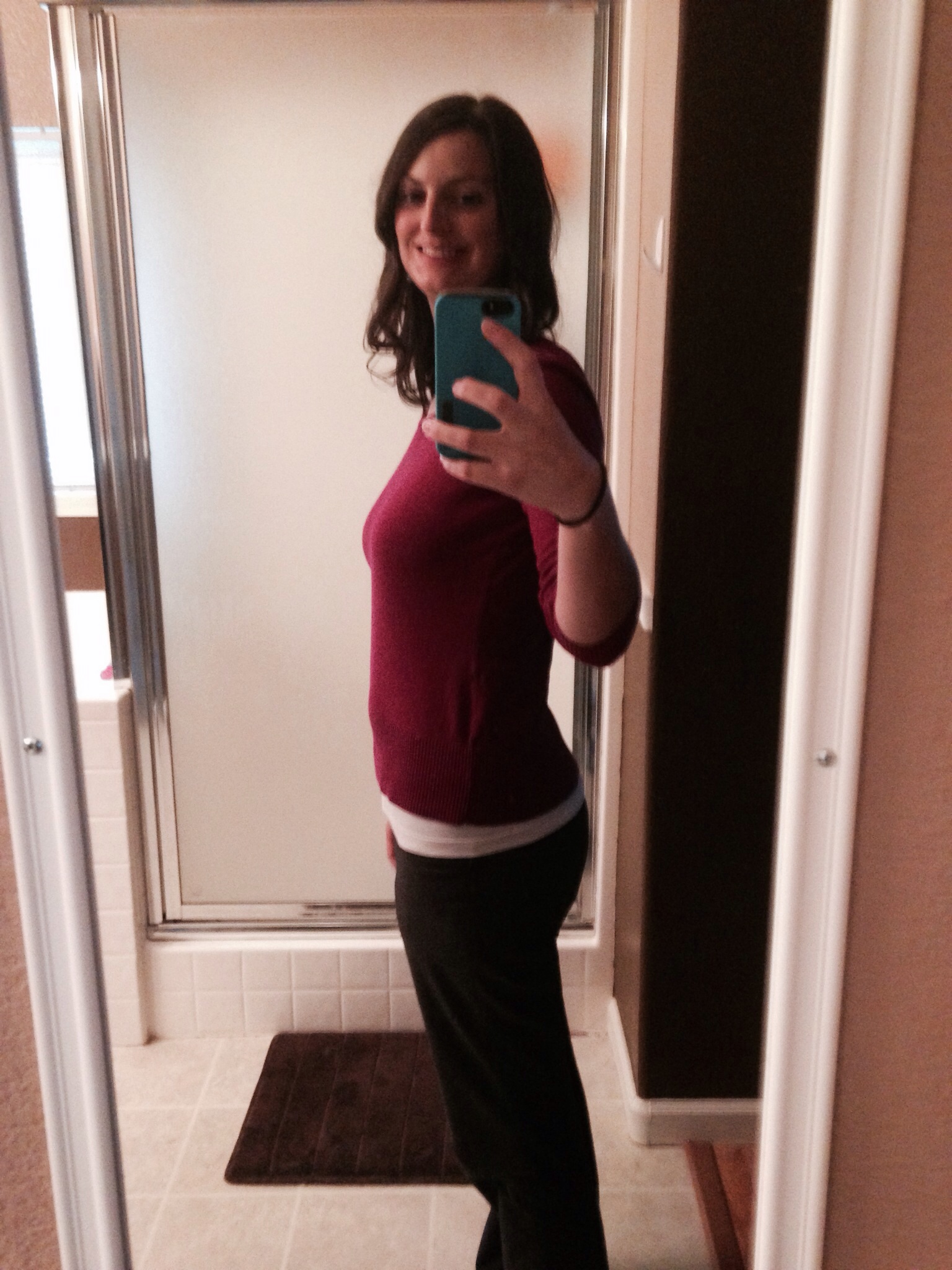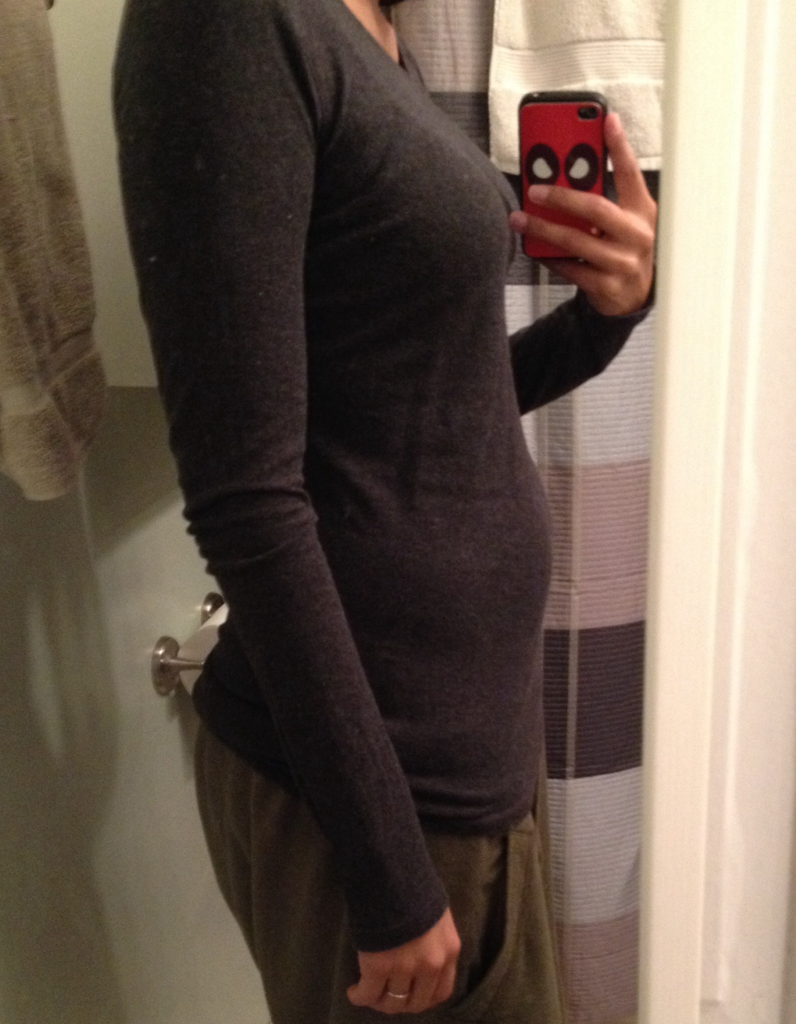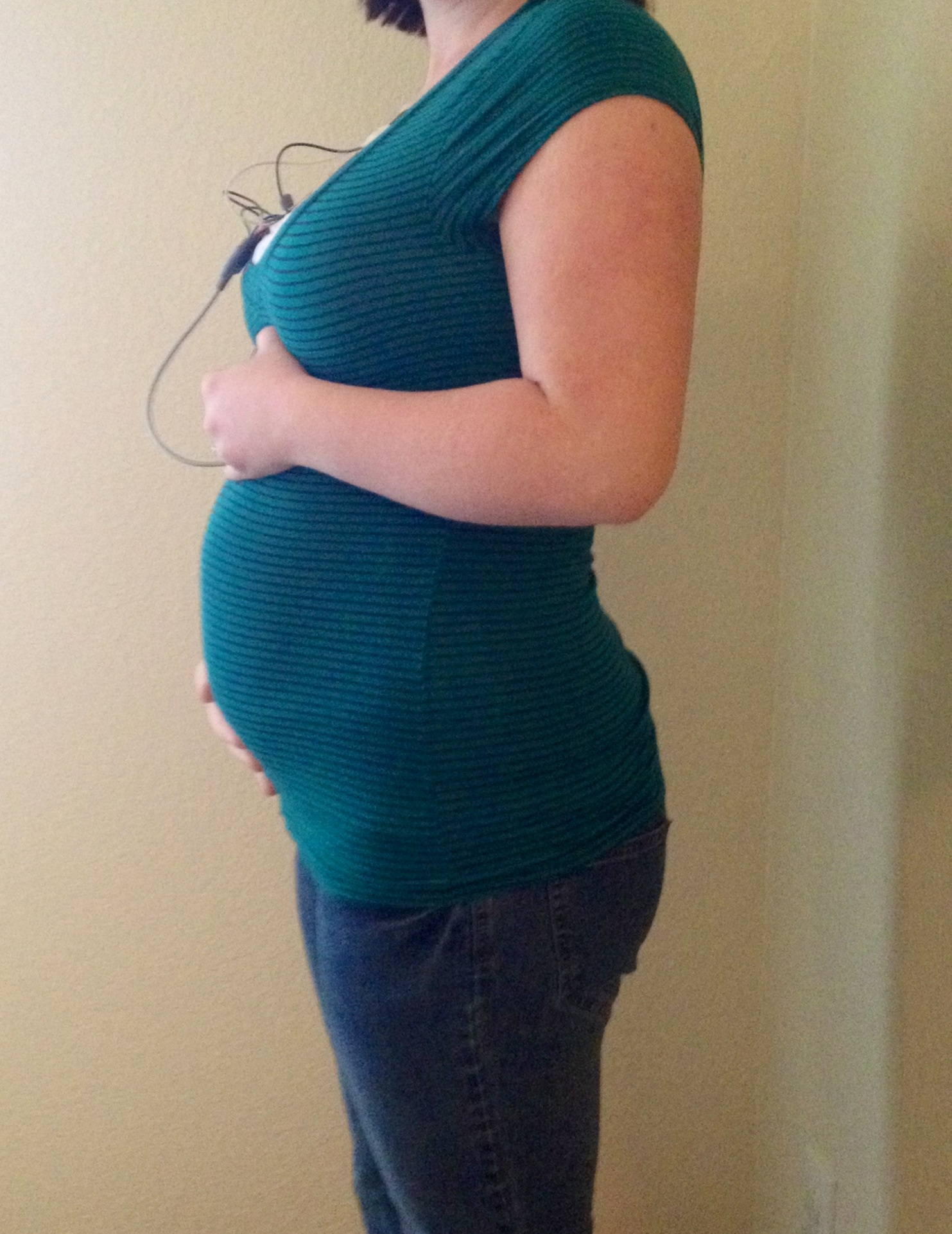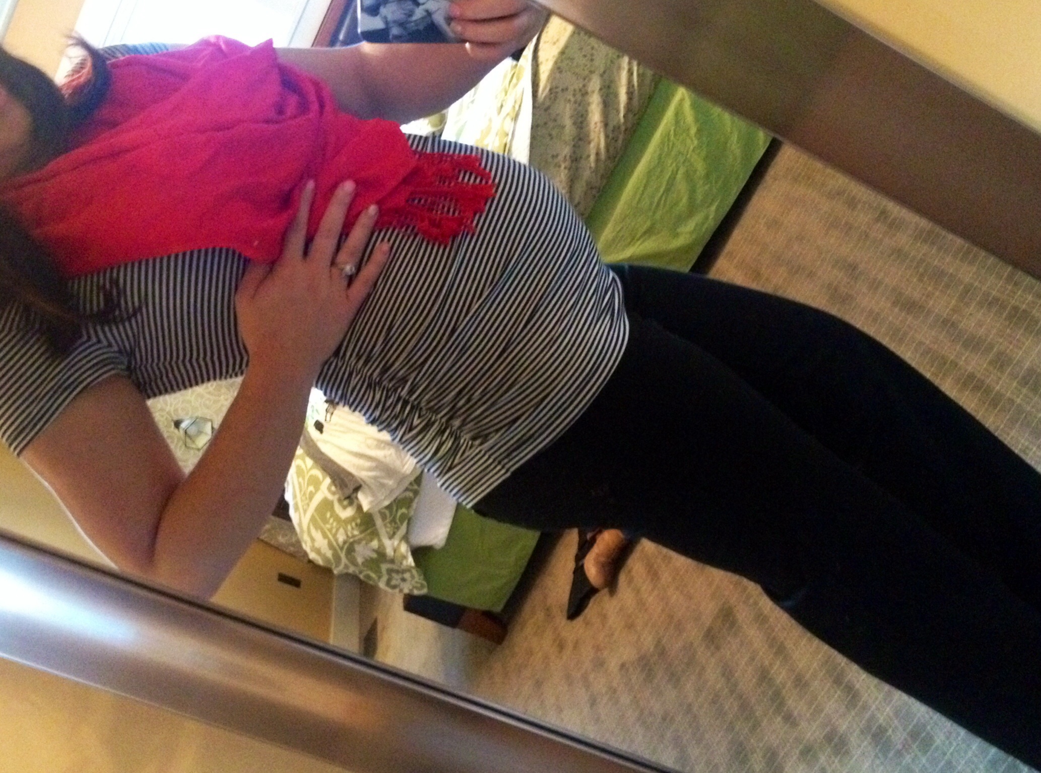 This is an absolutely horrid photo of me, but you can actually see the bump from the front and DD makes a pretty cute stinkin' strawberry, if you ask me!