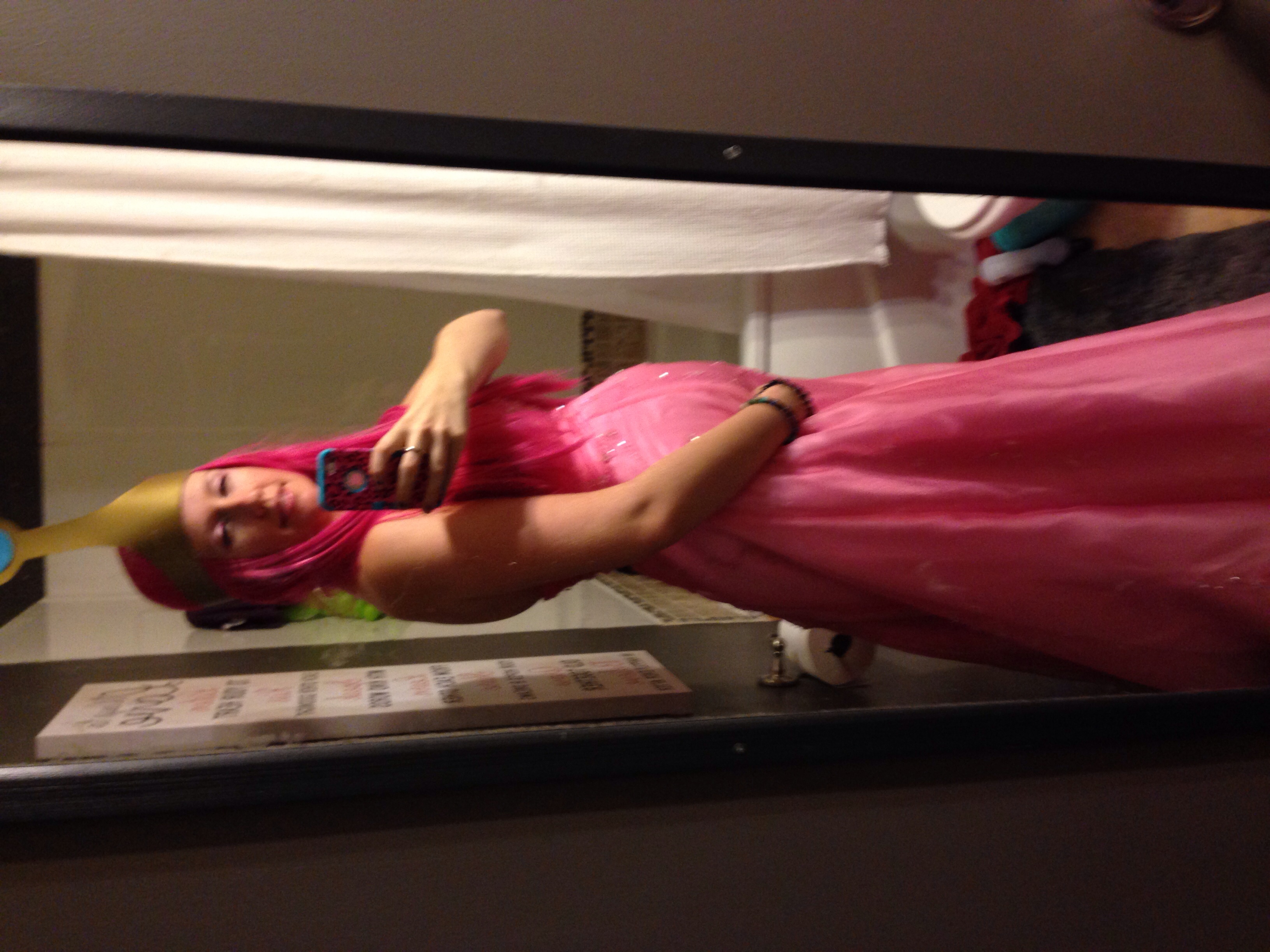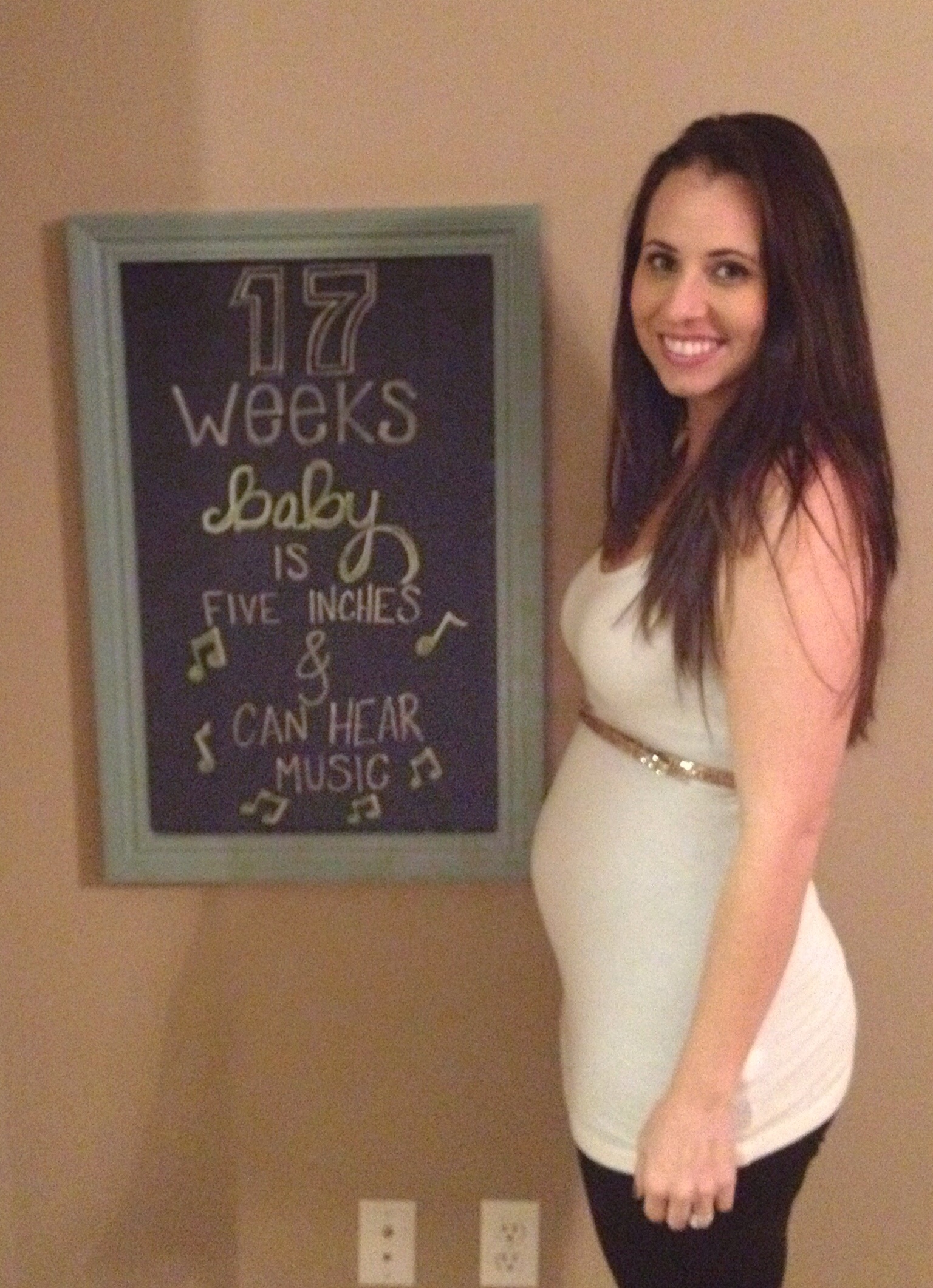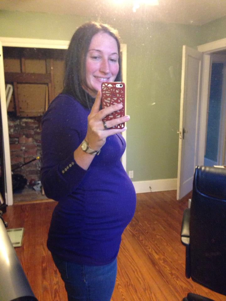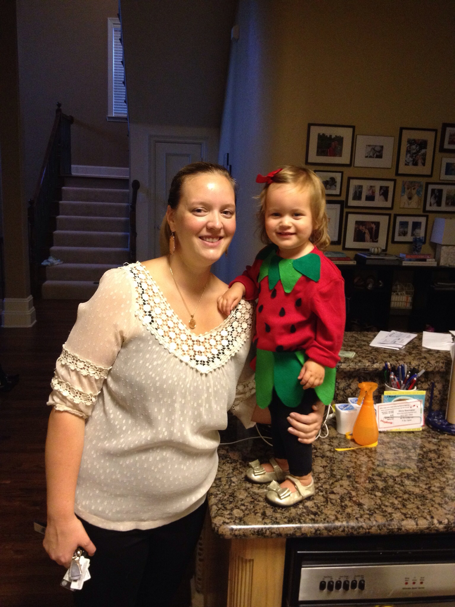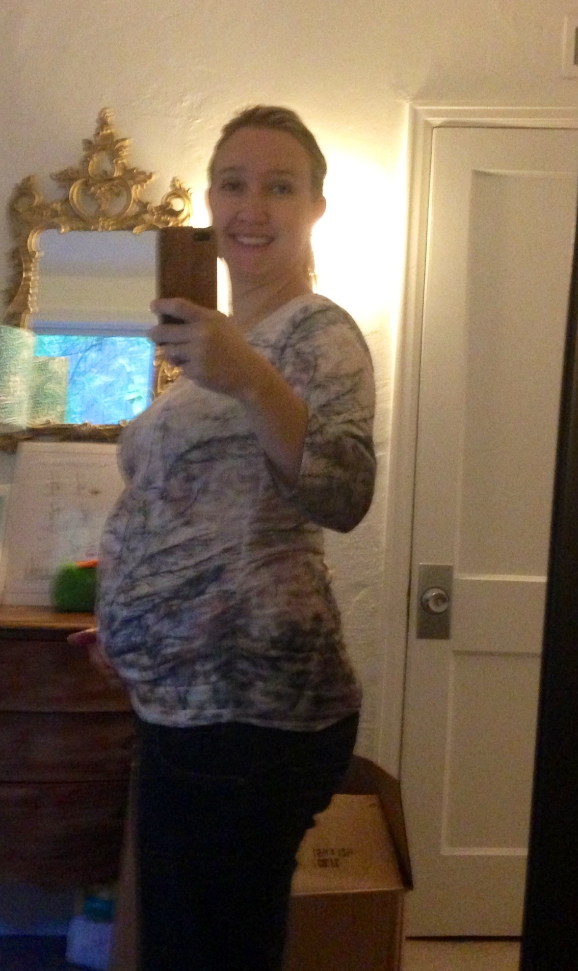 This is an absolutely horrid photo of me, but you can actually see the bump from the front and DD makes a pretty cute stinkin' strawberry, if you ask me!