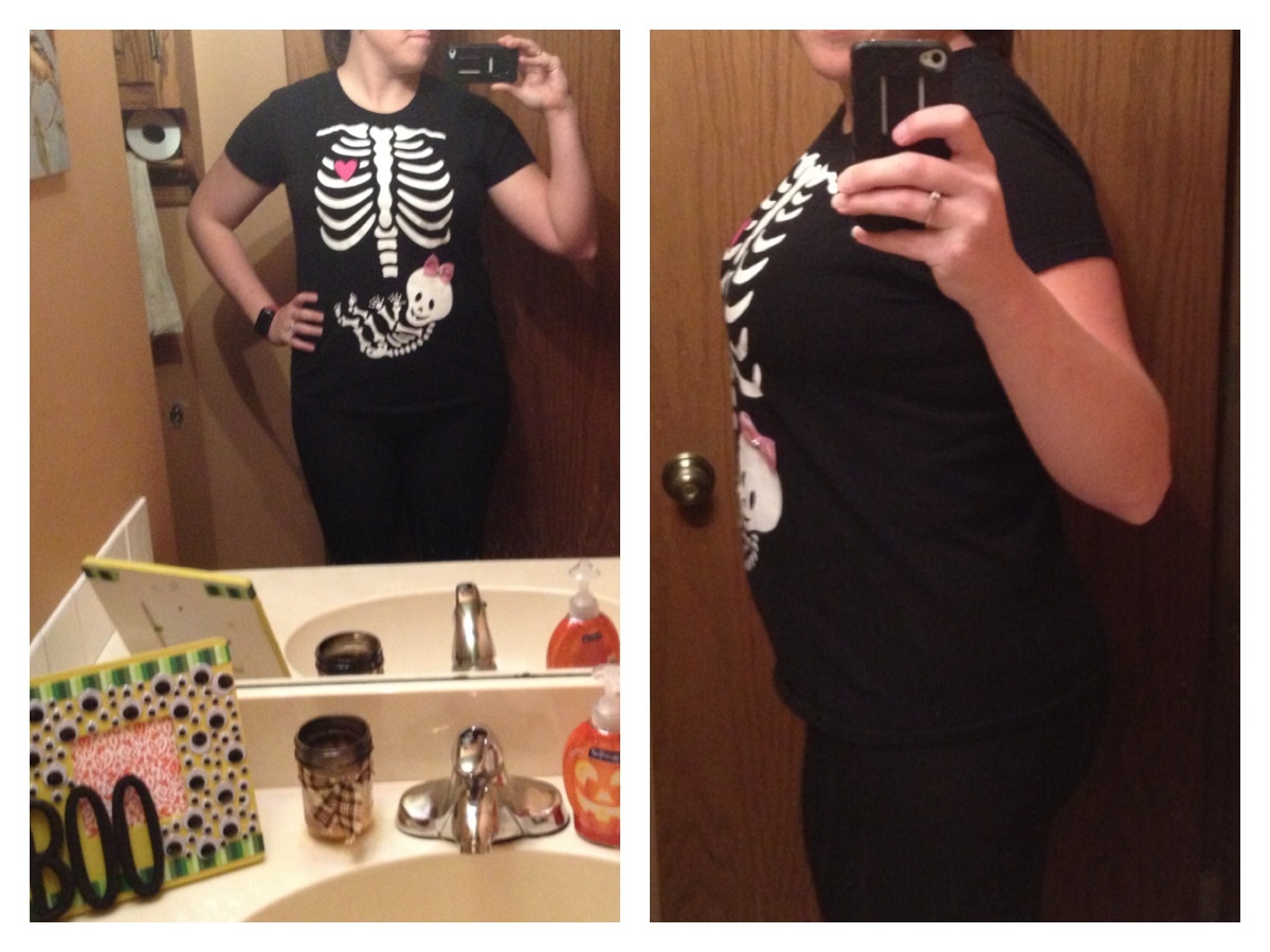 I took these last night in my Halloween shirt! I wanted to see what it looked like since I added the little bow on her head! Haha I think I'm going to take a picture with DH tonight and post on FB tomorrow! This will kind of be our announcement since we haven't made it public yet but once that picture is up I'm going to upload all the other ones I've been secretly hoarding (picture from our reveal, big brother bandana on our fur baby, and it's a girl chalkboard)!