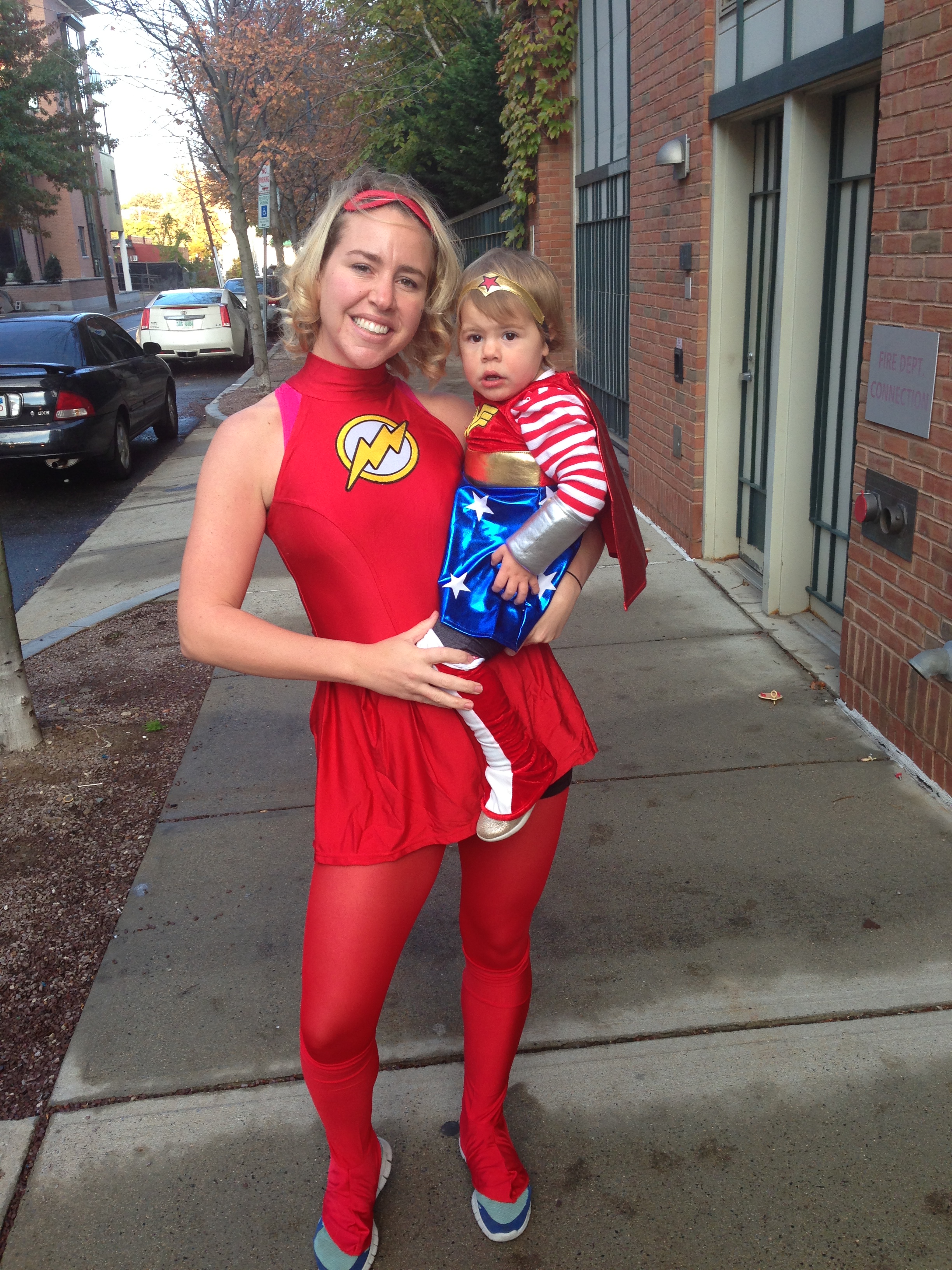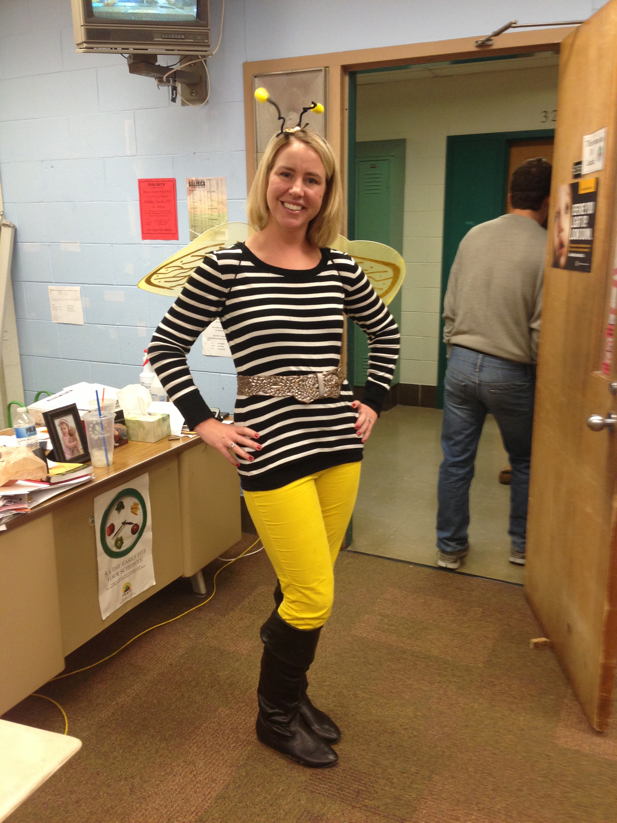 Here's one of DD and I at a Superhero race on Sunday (I was the Flash, she was Wonder Woman; I pushed her in the stroller.) The other picture is me as a bee at school today. Bzzzz!