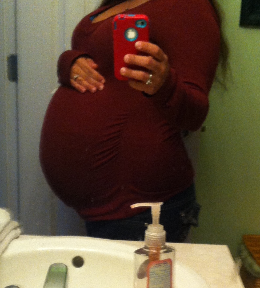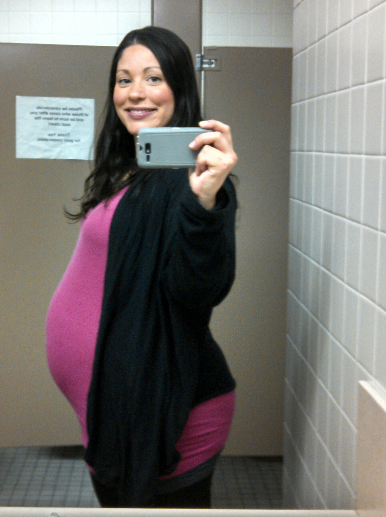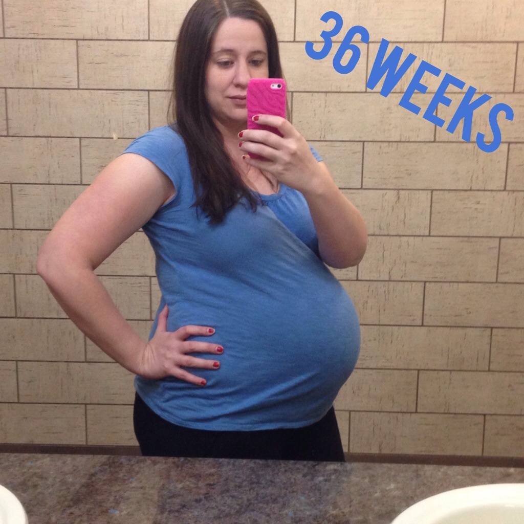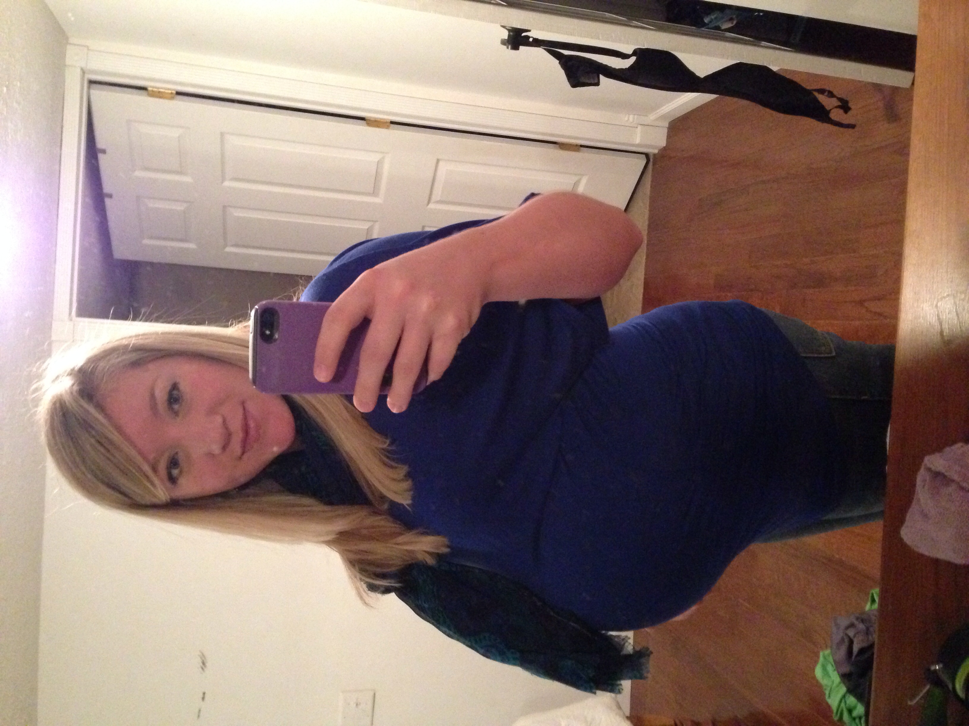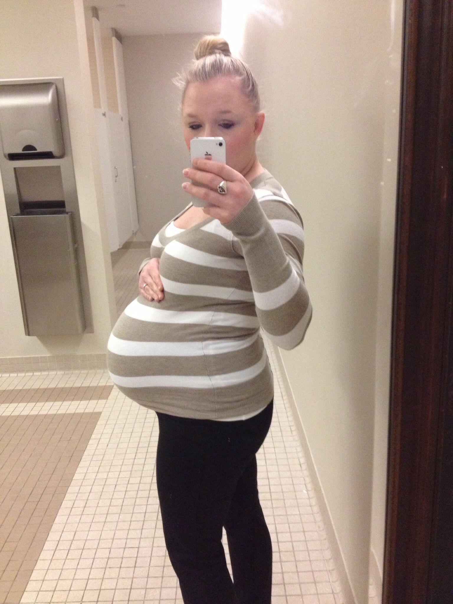 36 weeks w/ baby # 3. My shirts are getting too short but I refuse to buy more with less than 3 weeks to go. Also please excuse my puffy swollen face! You ladies look great