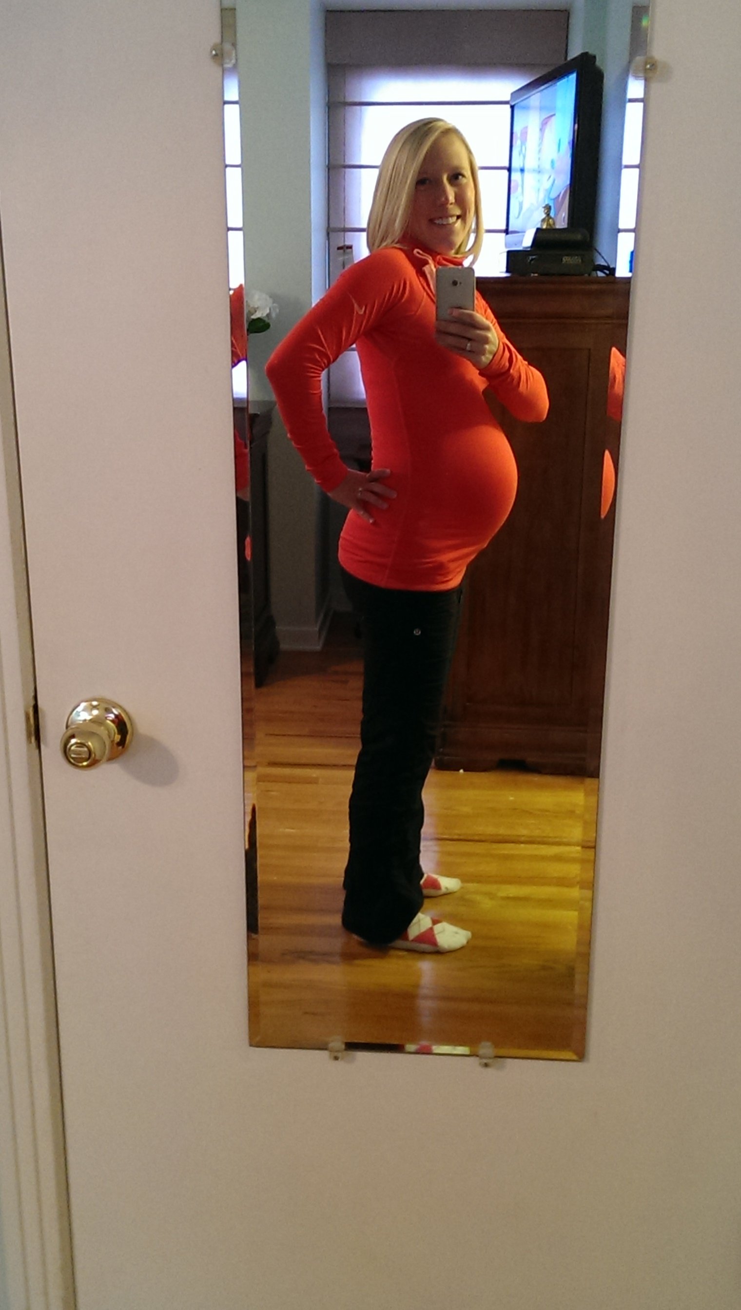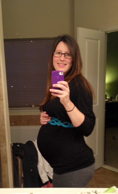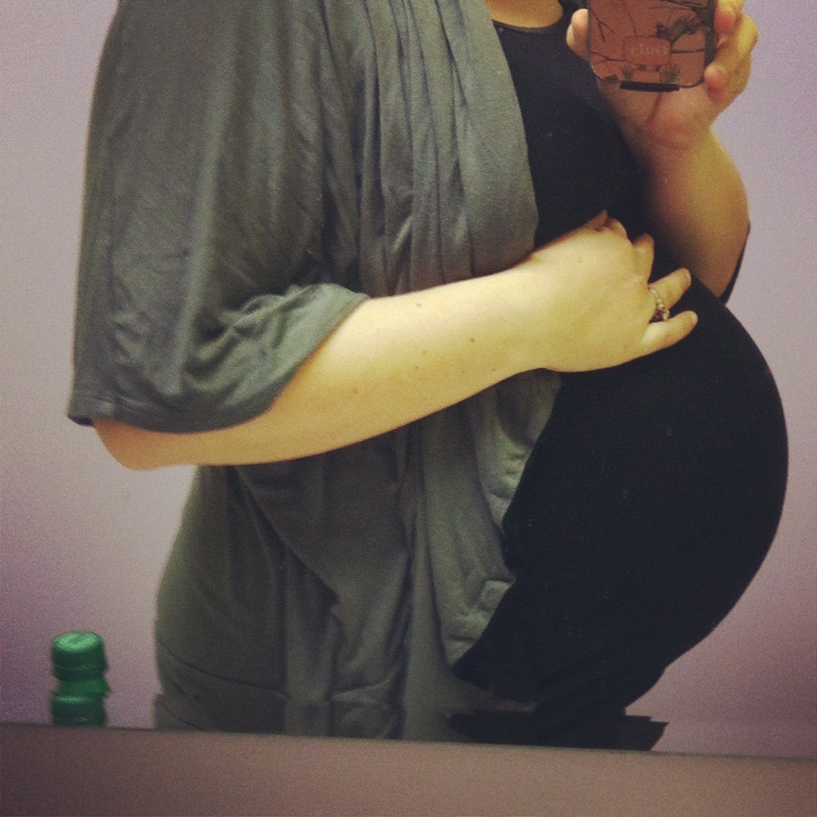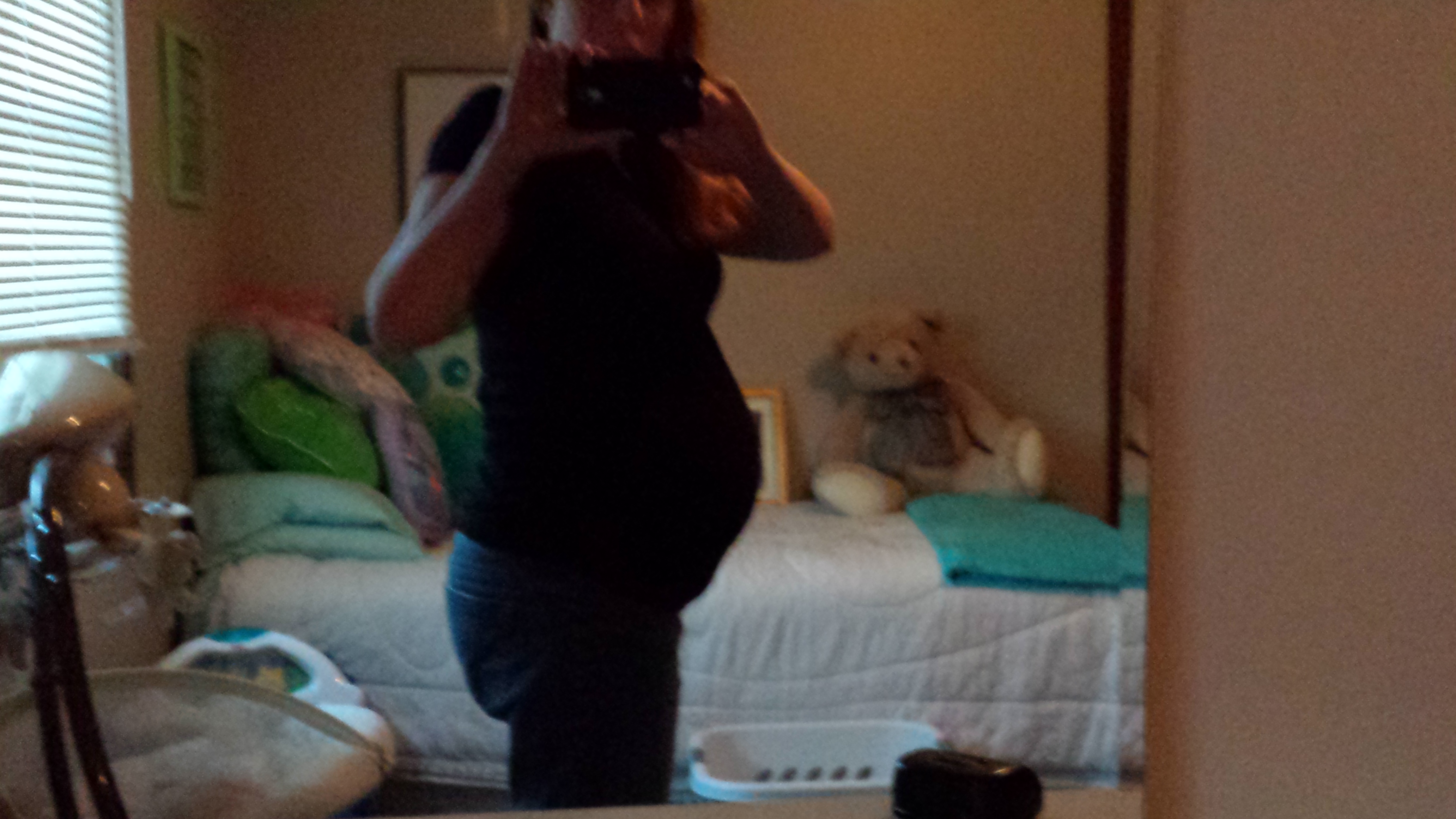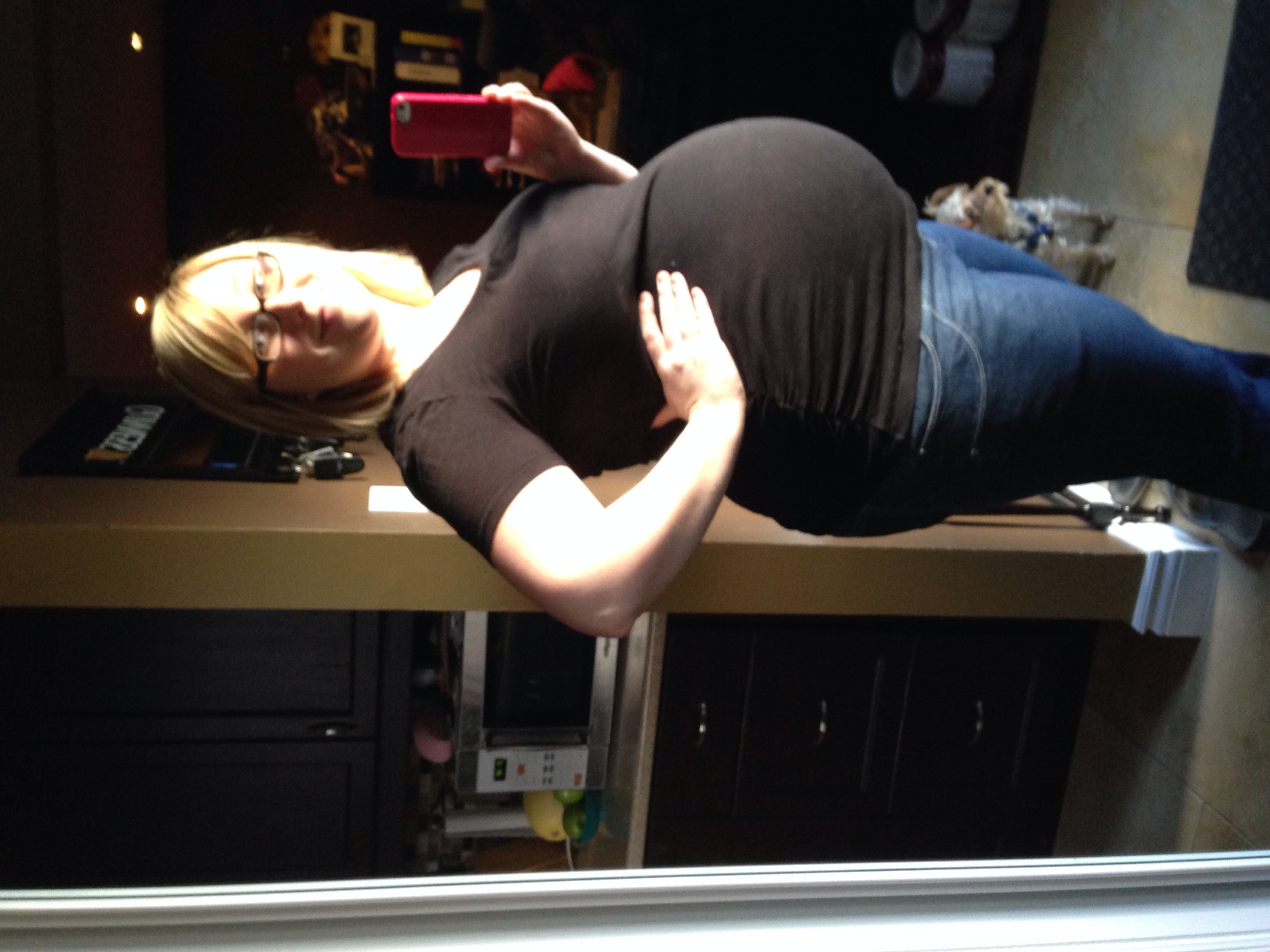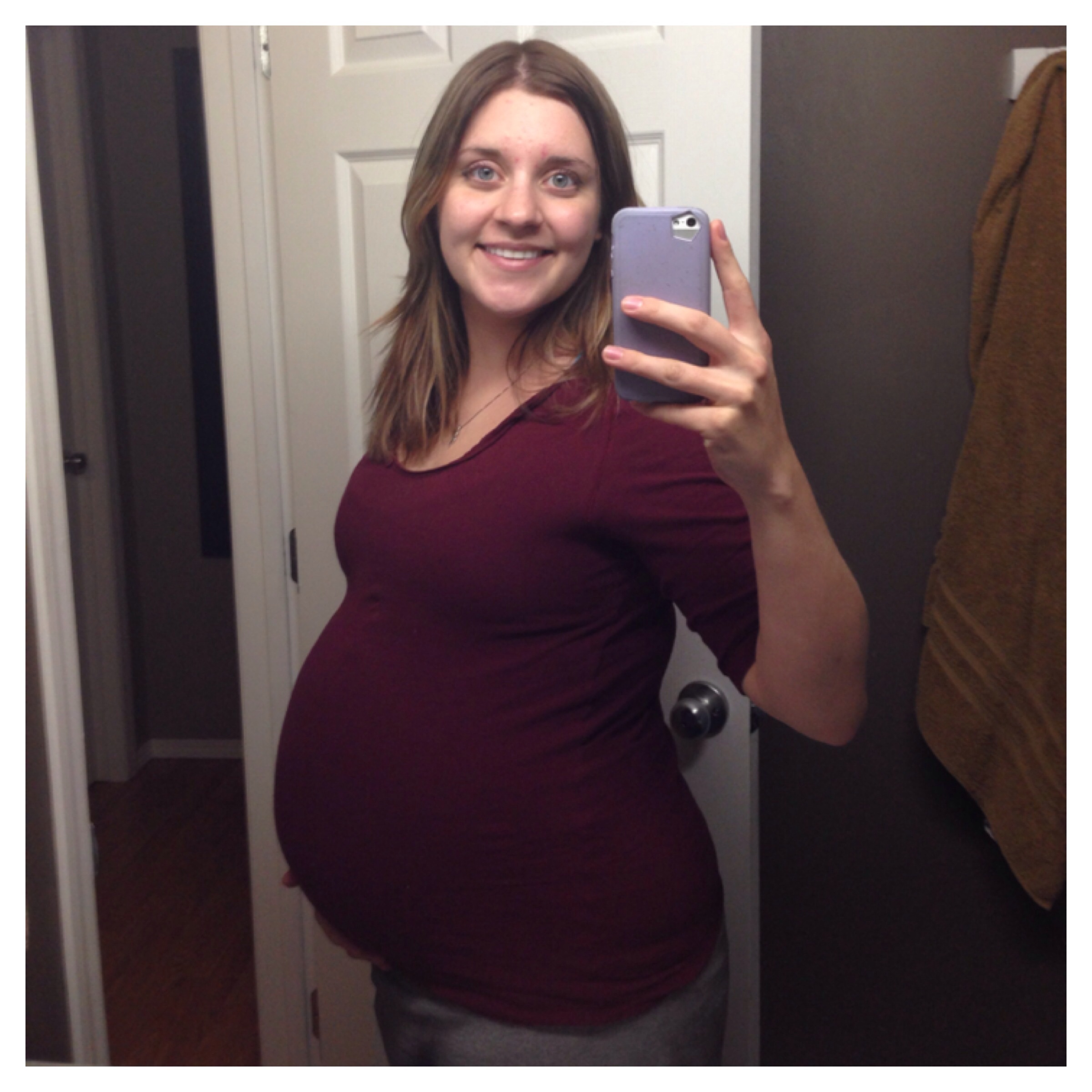 36 weeks w/ baby # 3. My shirts are getting too short but I refuse to buy more with less than 3 weeks to go. Also please excuse my puffy swollen face! You ladies look great
