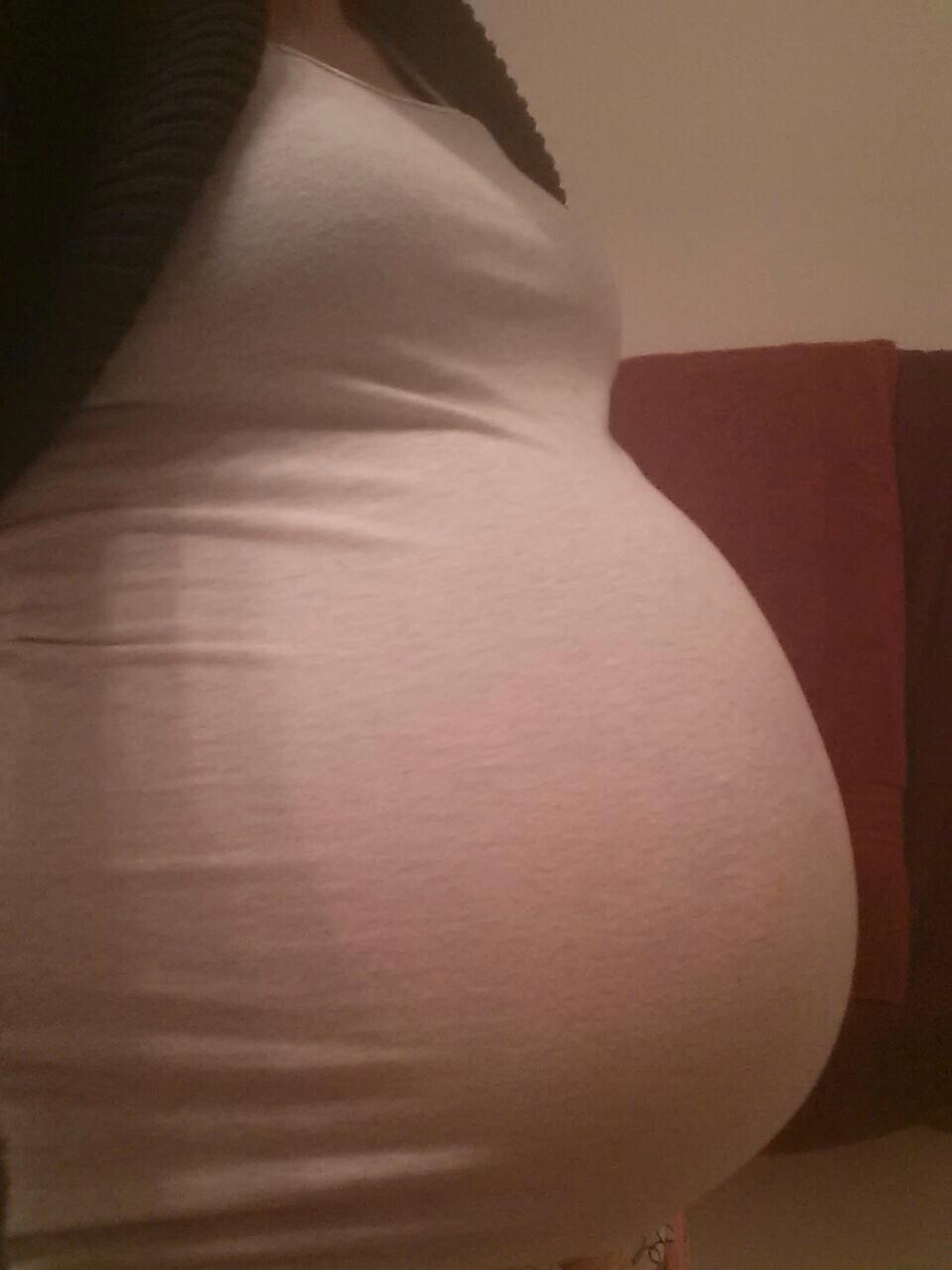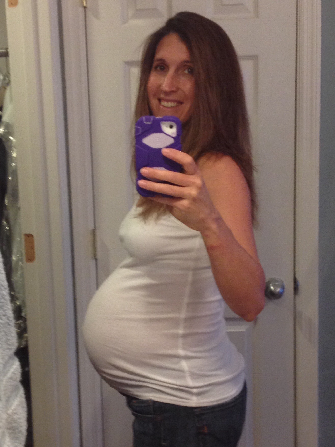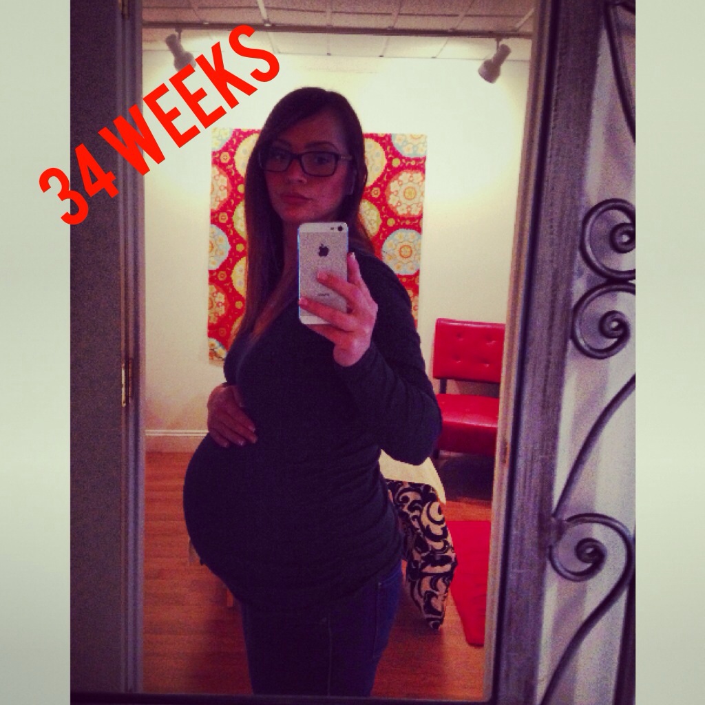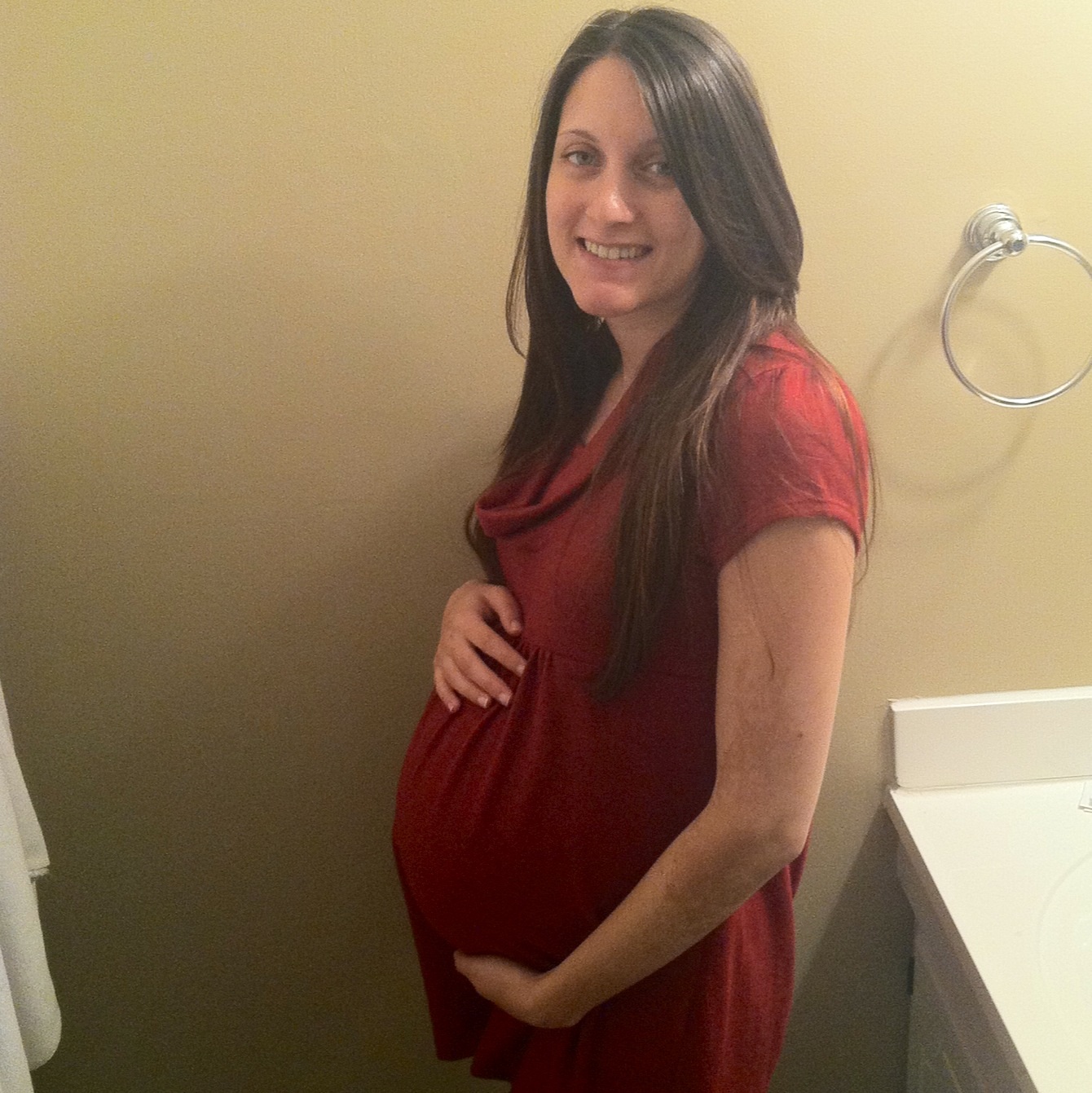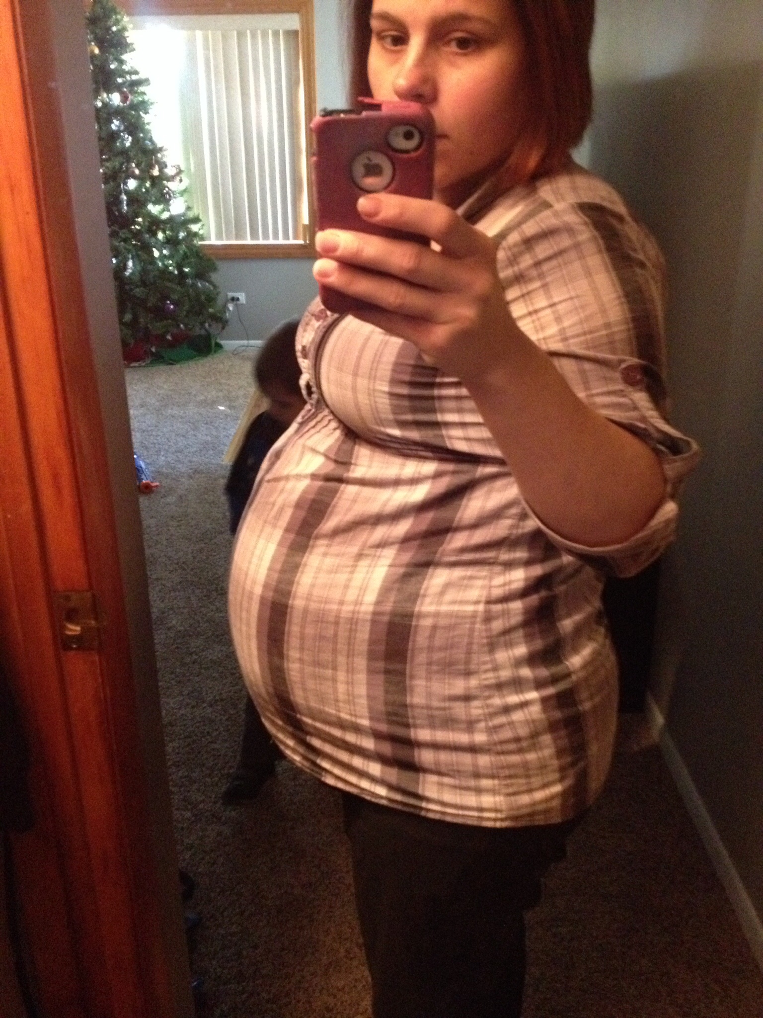 36 weeks w/ baby # 3. My shirts are getting too short but I refuse to buy more with less than 3 weeks to go. Also please excuse my puffy swollen face! You ladies look great