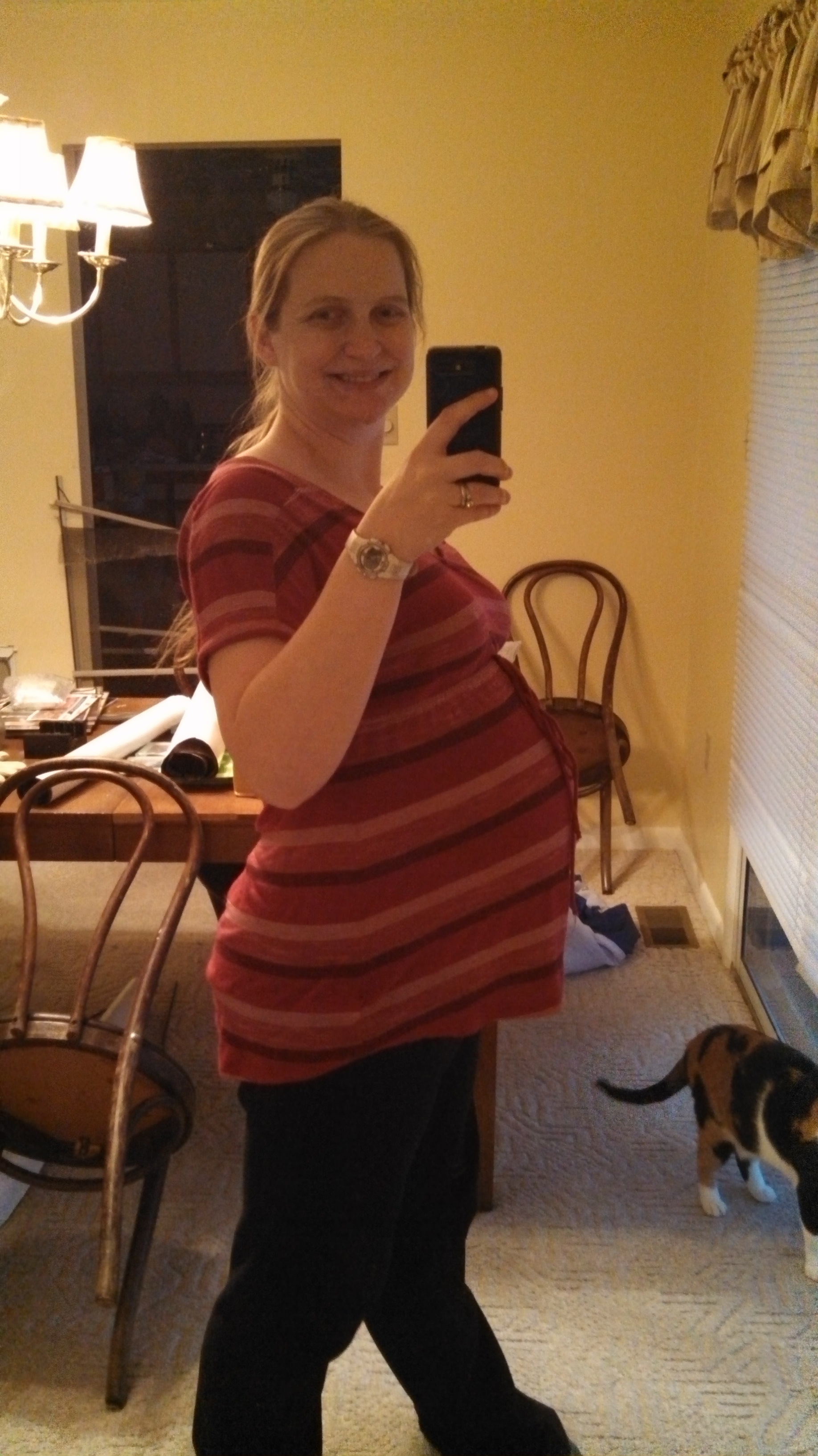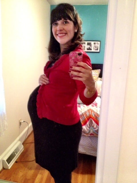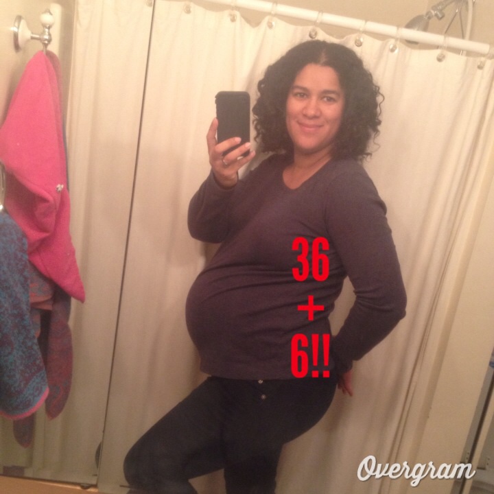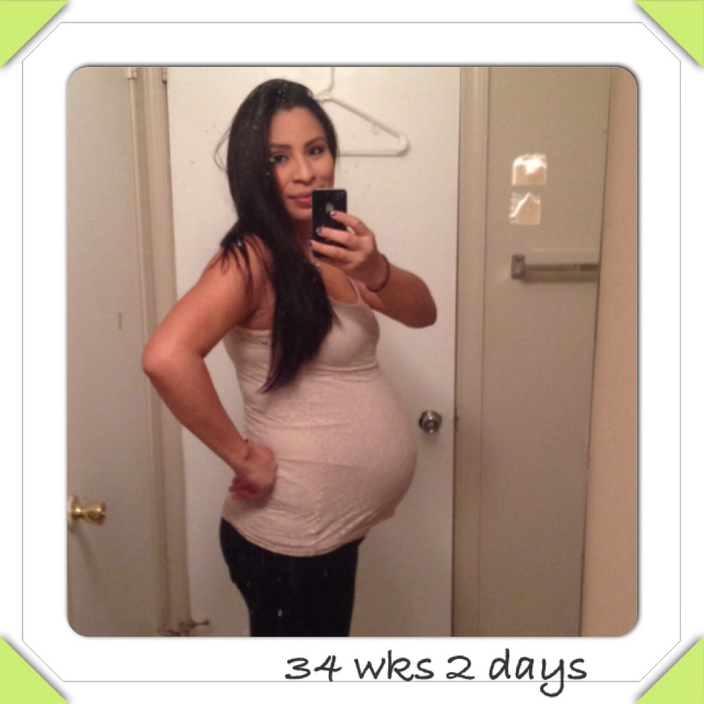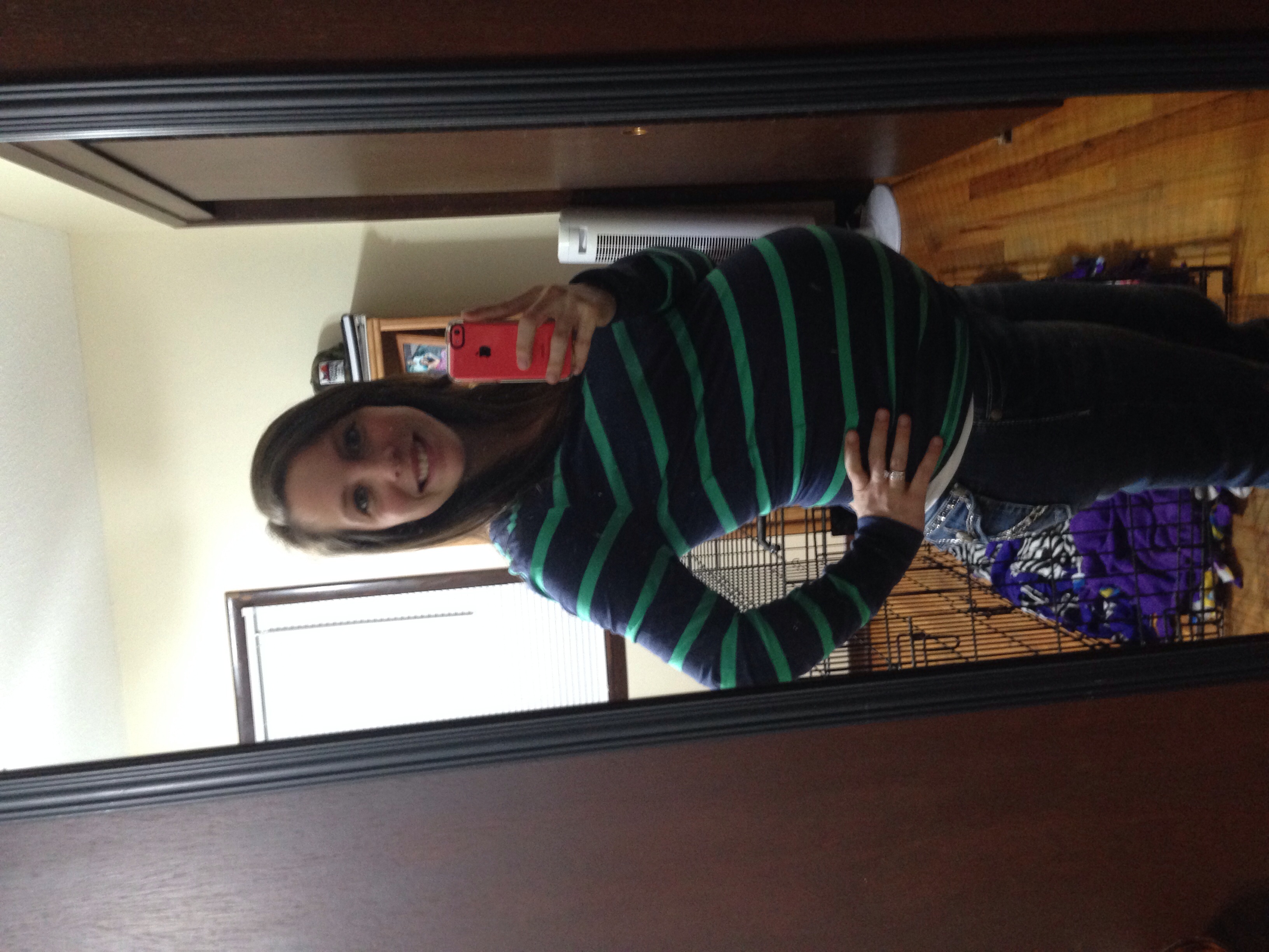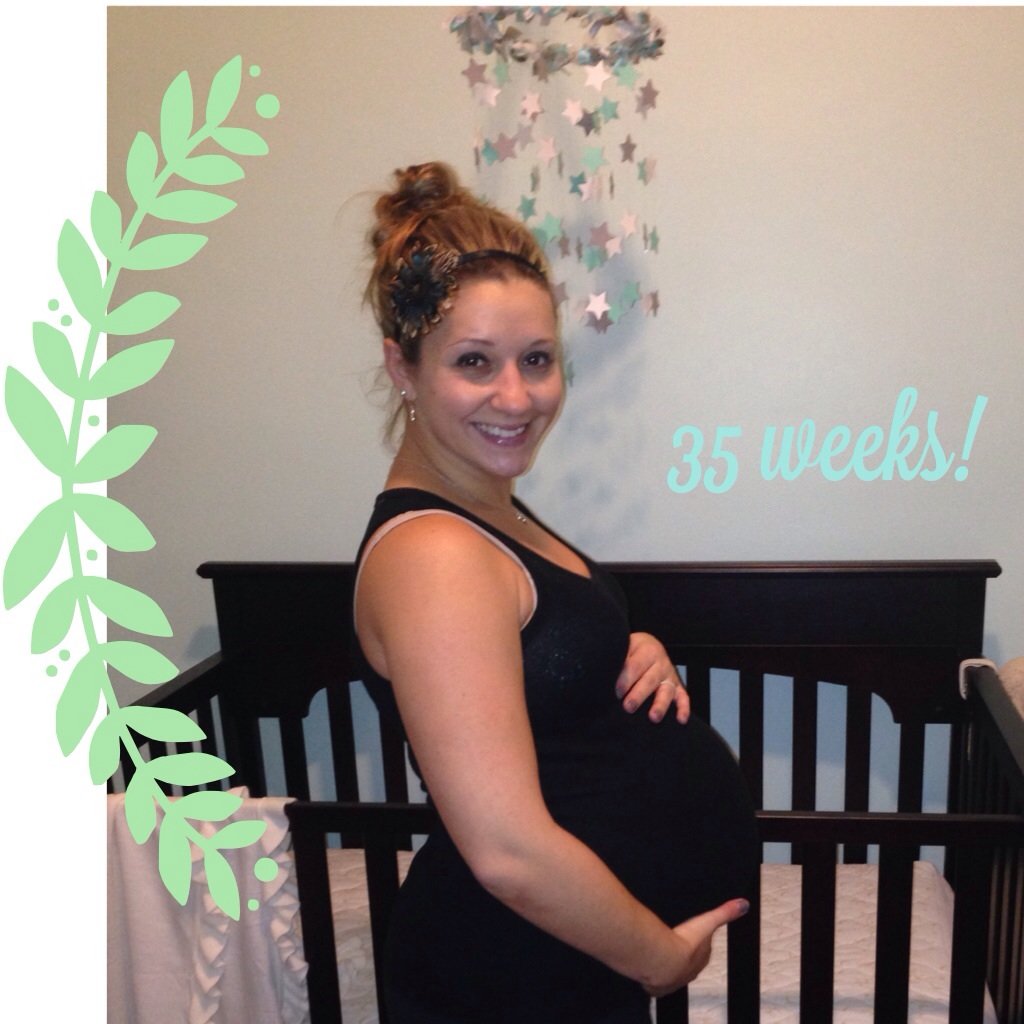 36 weeks w/ baby # 3. My shirts are getting too short but I refuse to buy more with less than 3 weeks to go. Also please excuse my puffy swollen face! You ladies look great
