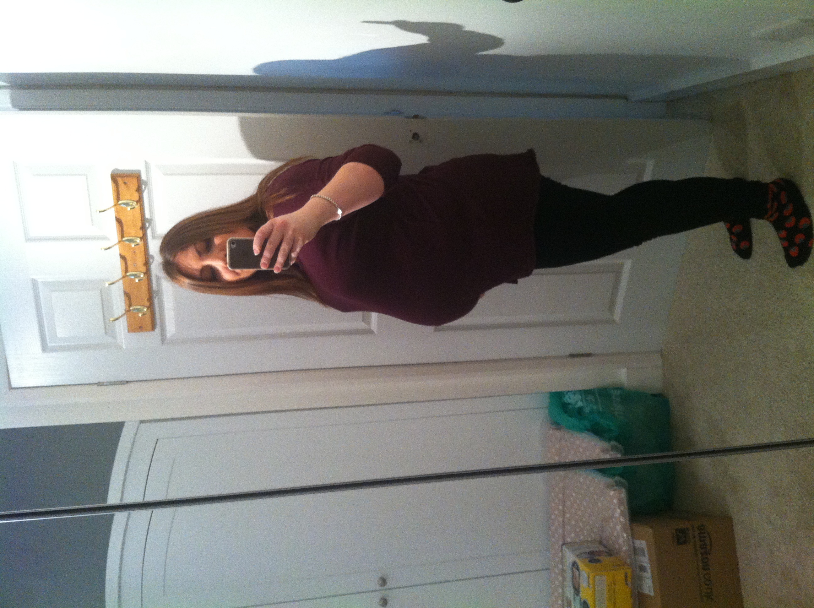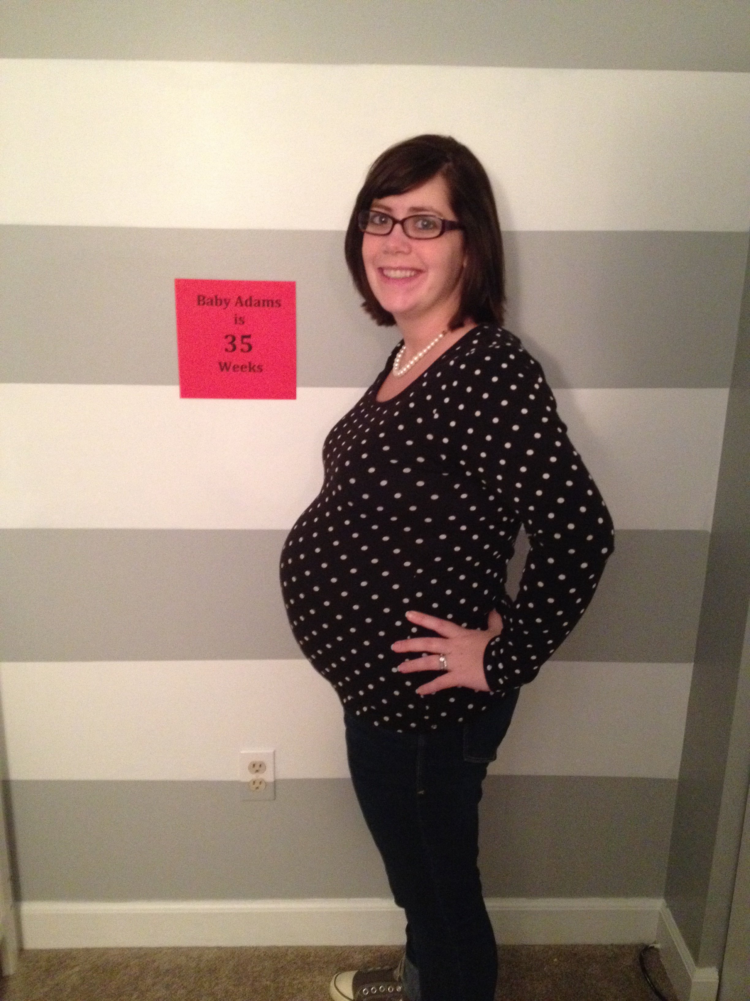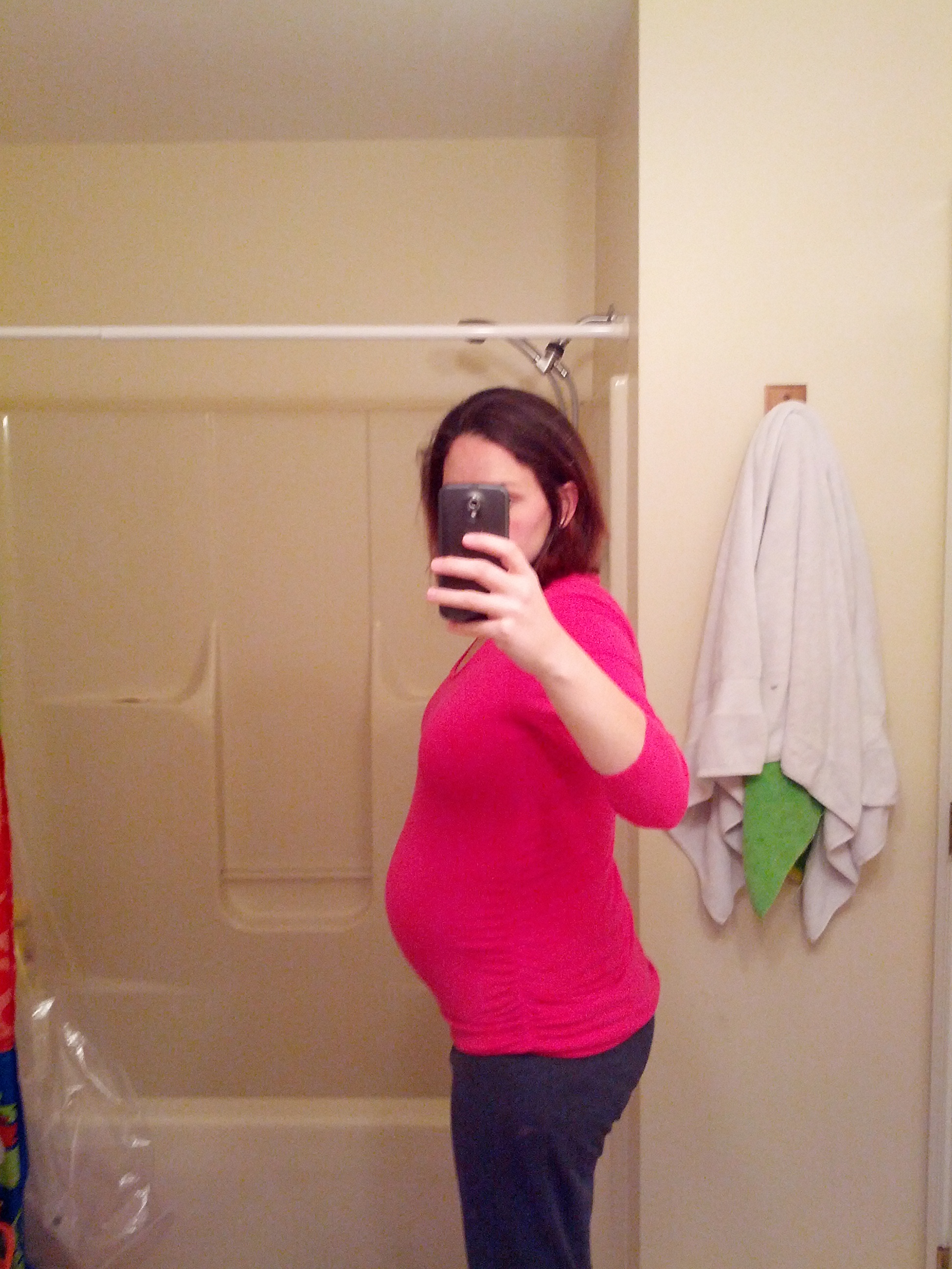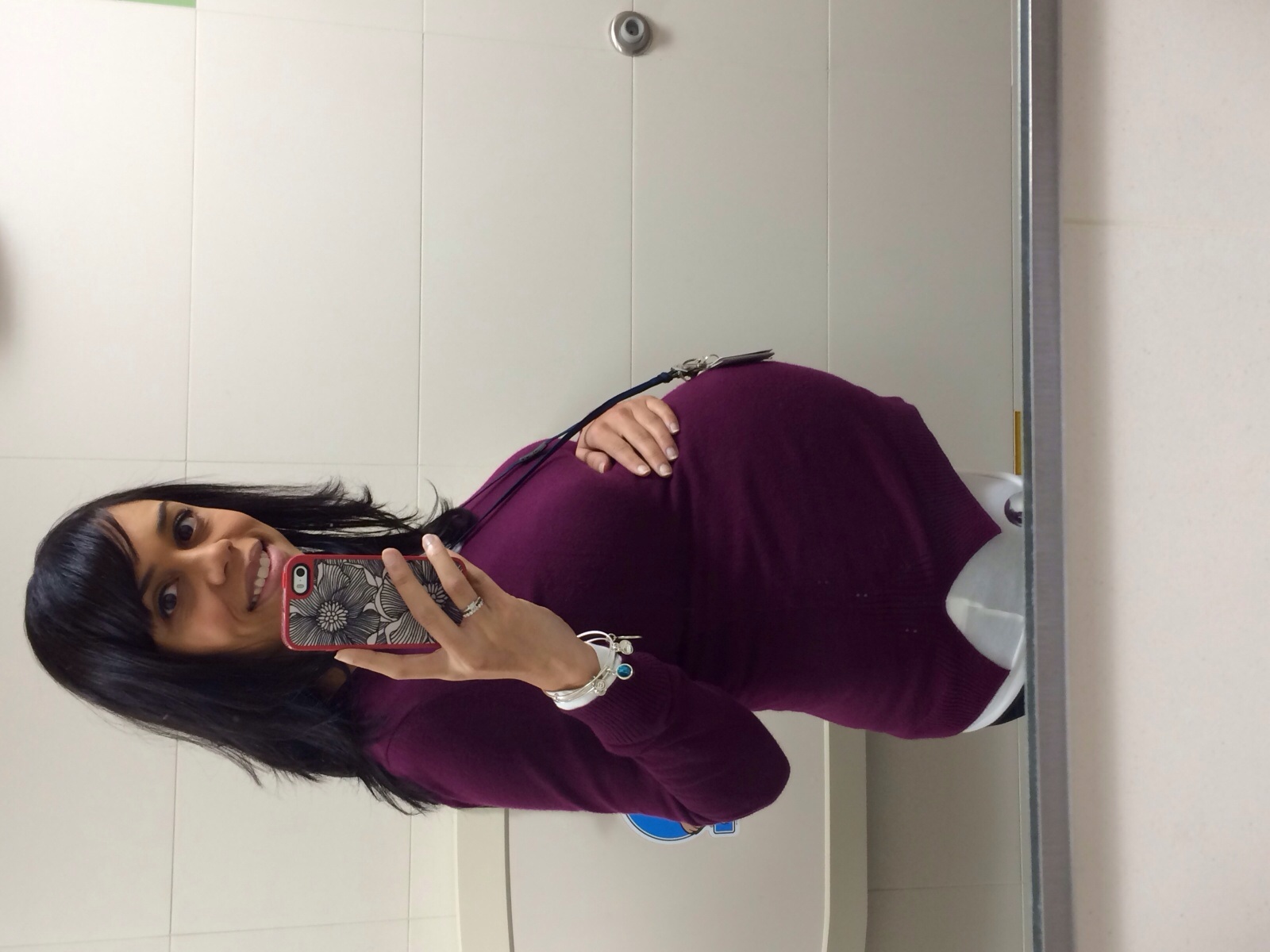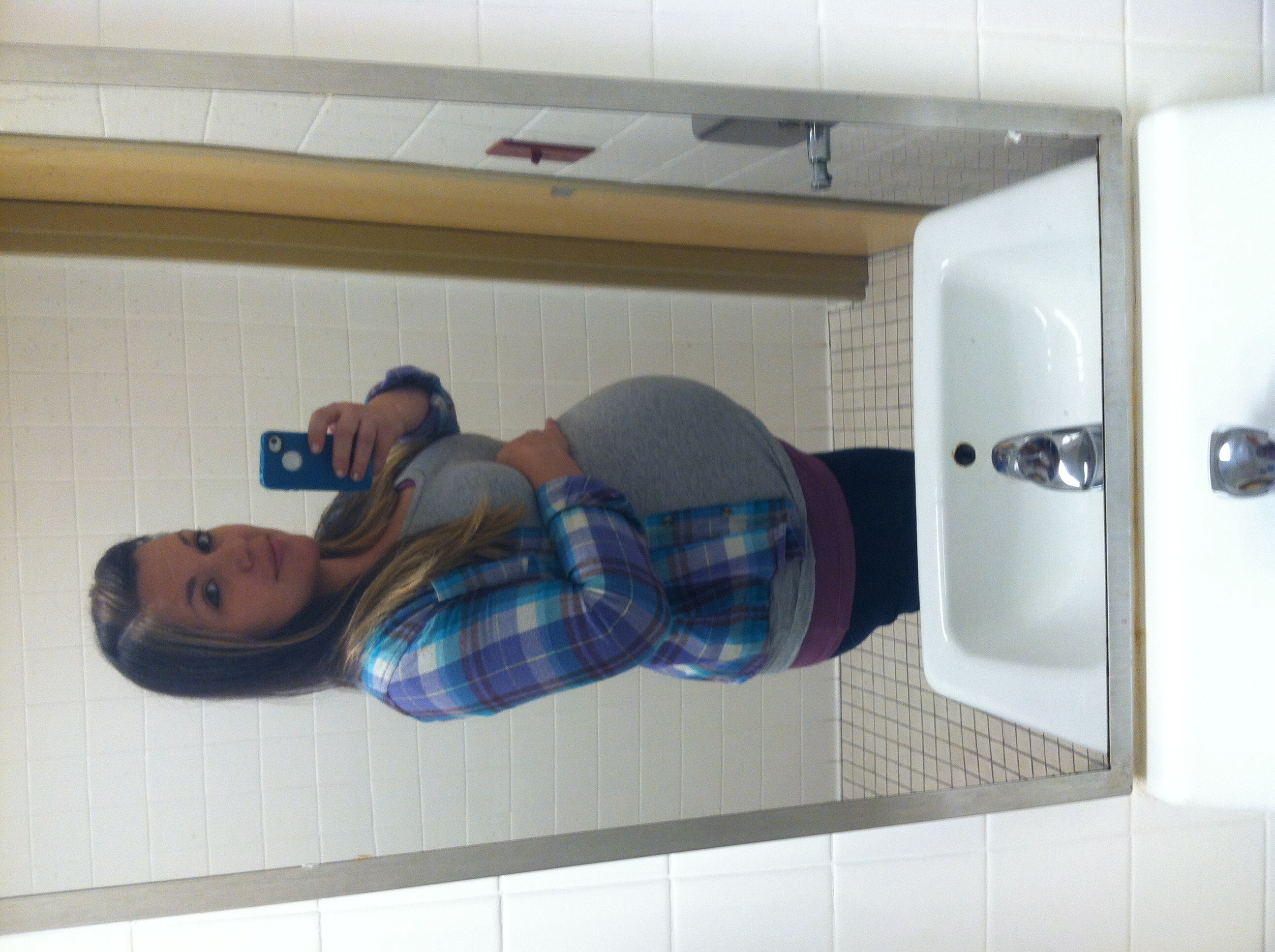 36 weeks w/ baby # 3. My shirts are getting too short but I refuse to buy more with less than 3 weeks to go. Also please excuse my puffy swollen face! You ladies look great