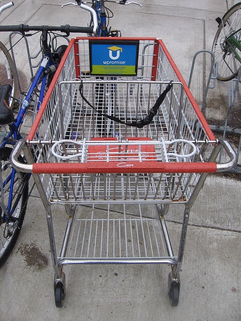 We shop at HEB and the carts have those rings that are for drink holders and you can put the bag handles around those. Also the part of the cart that's below where a kid would sit has arches in the design that doesn't meet the top so you can hang stuff from those too. Not sure how to describe that well.