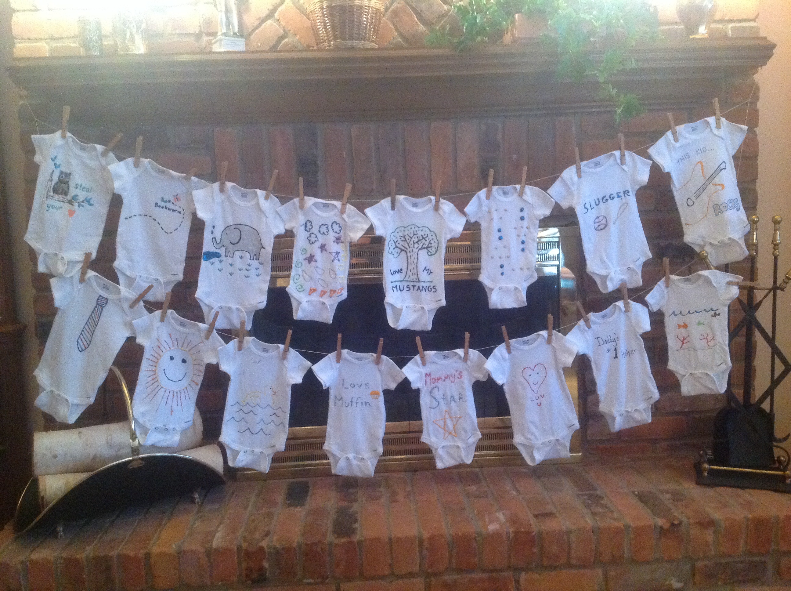 Baby shower was sooo much fun! We're all laying around the house exhausted, but totally worth it. Here's a photo of one of the crafts/games we did : onesie decorating with puffy paint!
