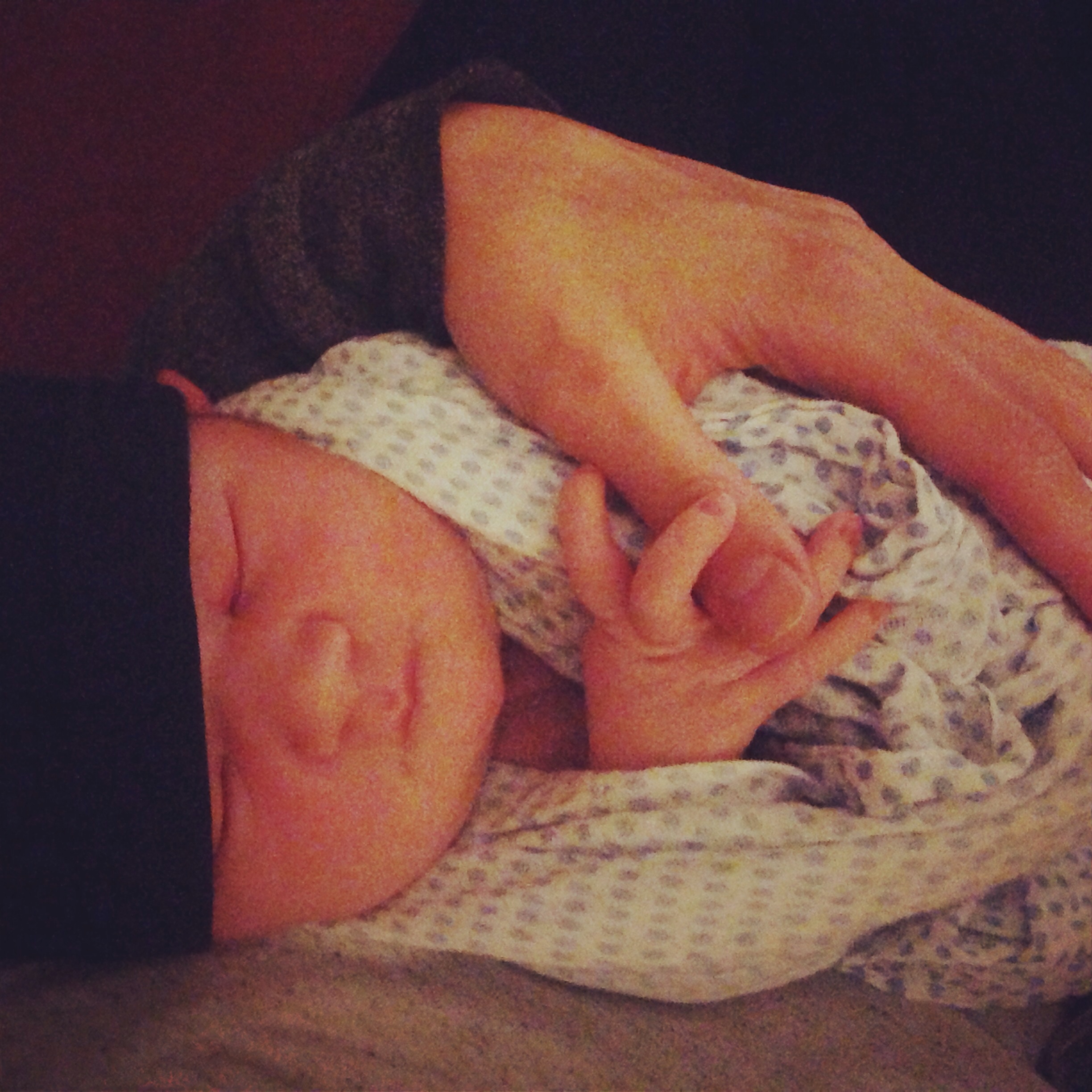 Cluster feeding already?! Oh my. Picked the wrong night to start rooming in! Lol. Poor DH -he was so frustrated that Asher kept acting hungry. He BF for over an hour, then I passed him to DH to put to bed. Wouldn't stop fussing, drank the 30ML I pumped earlier, fussed for an hour while I dozed. DH passed him back to me, nursed twice on both sides for an hour total while DH slept, then I needed a break from feeding so I attempted to wake up DH by saying his name. Loudly. Took 10 min. I can't get out of bed with the baby in my arms yet, so I was stuck. It was pathetically comical. Asked the nurse for formula to supplement. He's slamming that now. Dear heavens... Hope he sleeps now after eating for 3 hours straight. I need to sleep.