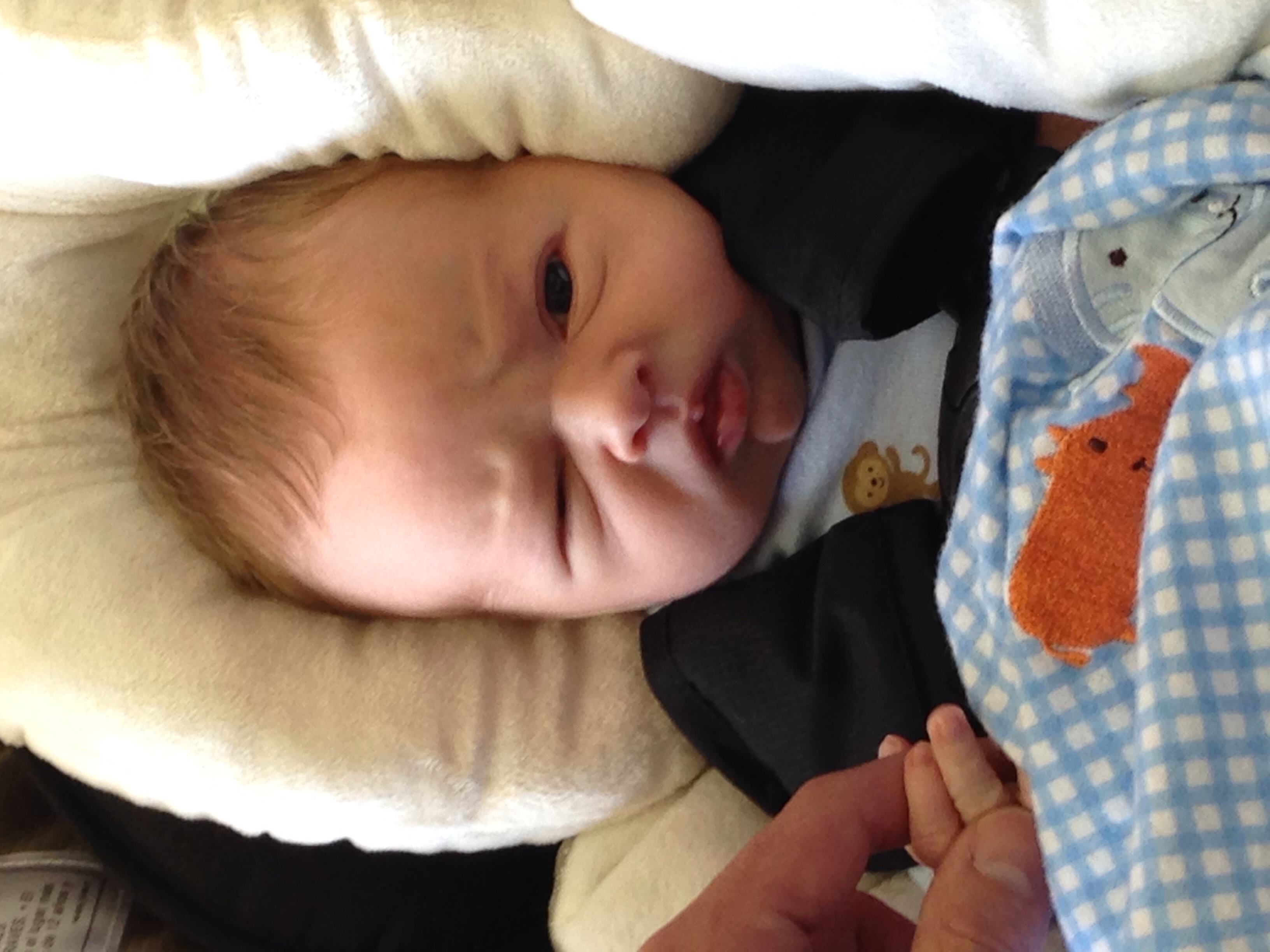 Hi everyone! I am back and with bebe. We are at home and doing really well! He is 5 days old and only 2oz away from birthweight!! I will post birth story later but until then: here is Andrew Joseph --- lots of blonde hair and a super grumpy face!!