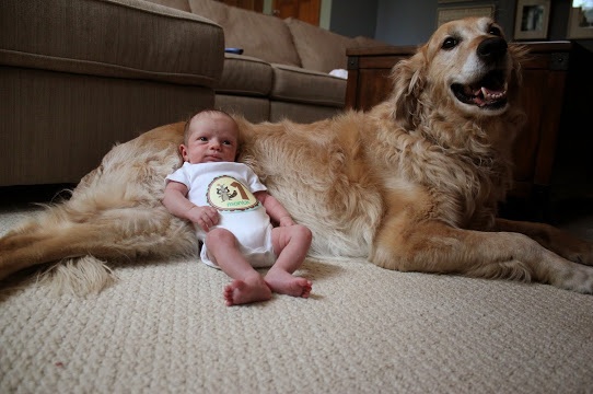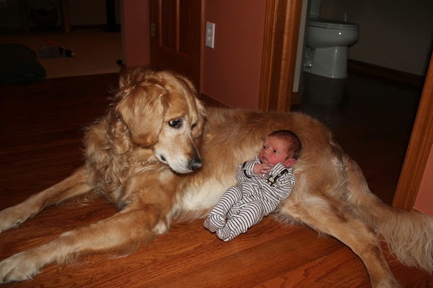 Here's our vicious fleabag! We took the photo on the wood floor at six days, and we're going to take monthly photos with the dog as well as with Aiden's stuffed elephant.