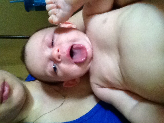 My poor sweaty kid. He is not happy unless I'm holding him, but he is already feverish and warm, and snuggling me is making him warmer despite the baby Tylenol. This two month shot misery for Captain Clammy Hands over here is breaking my heart.
