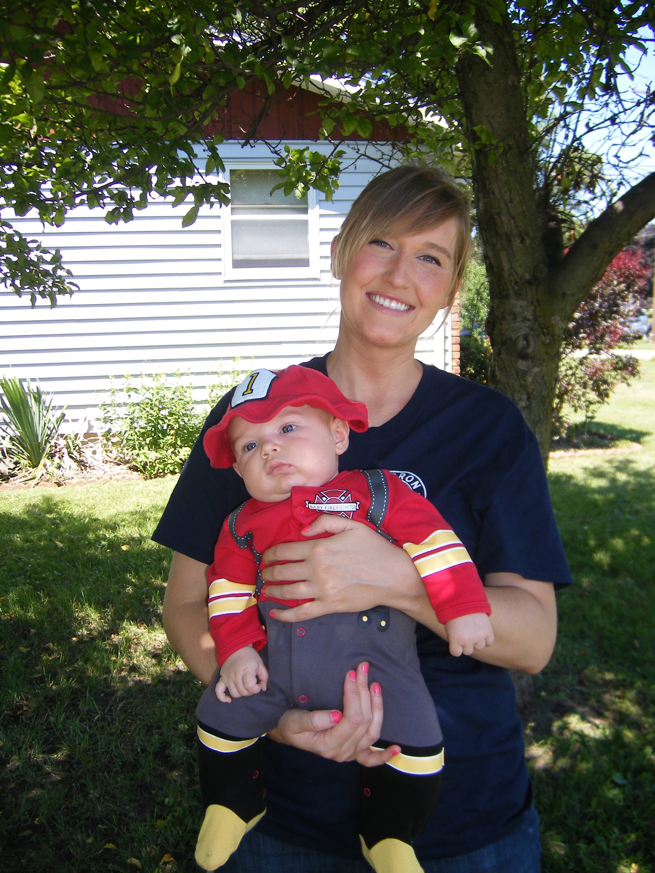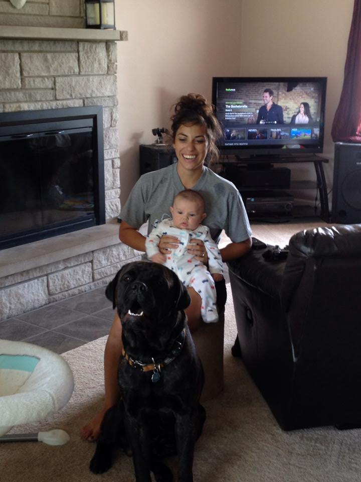 Deal! That's me with LO dressed as a fireman for the 4th of july parade because daddy is a volunteer fireman. Nyx is my 6 year old german shepherd. Talos is my 1 year old Cane Corso mastiff (that's my SIL holding lo with Talos). The dogs are so good with the baby! They are even more calm and protective than I imagined they would be. Nyx doesn't quite get that the tiny human can't throw her ball for her and will drop it next to his chair over and over again trying to play.