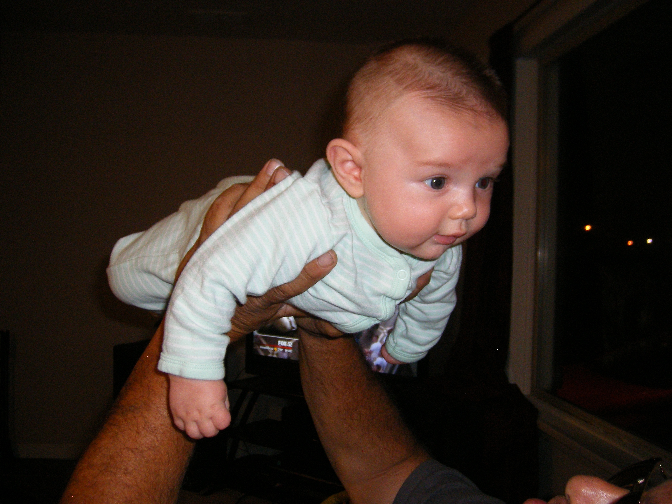 That's DH and I when I was about 39 weeks pg, a pic of lo as we are heading out for a walk (my current favorite activity!), a pic of my happy baby bear that daddy took during tummy time yesterday, and my favorite pic of LO doing his 'oooo' face. It's also my favorite pic of him because when I'm holding him and I look down, that's my view. That's my angle, that's what I see. and I love it!
