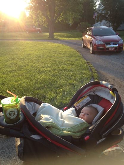 Just for fun, since you ladies love pics... That's DH and I when I was about 39 weeks pg, a pic of lo as we are heading out for a walk (my current favorite activity!), a pic of my happy baby bear that daddy took during tummy time yesterday, and my favorite pic of LO doing his 'oooo' face. It's also my favorite pic of him because when I'm holding him and I look down, that's my view. That's my angle, that's what I see. and I love it!