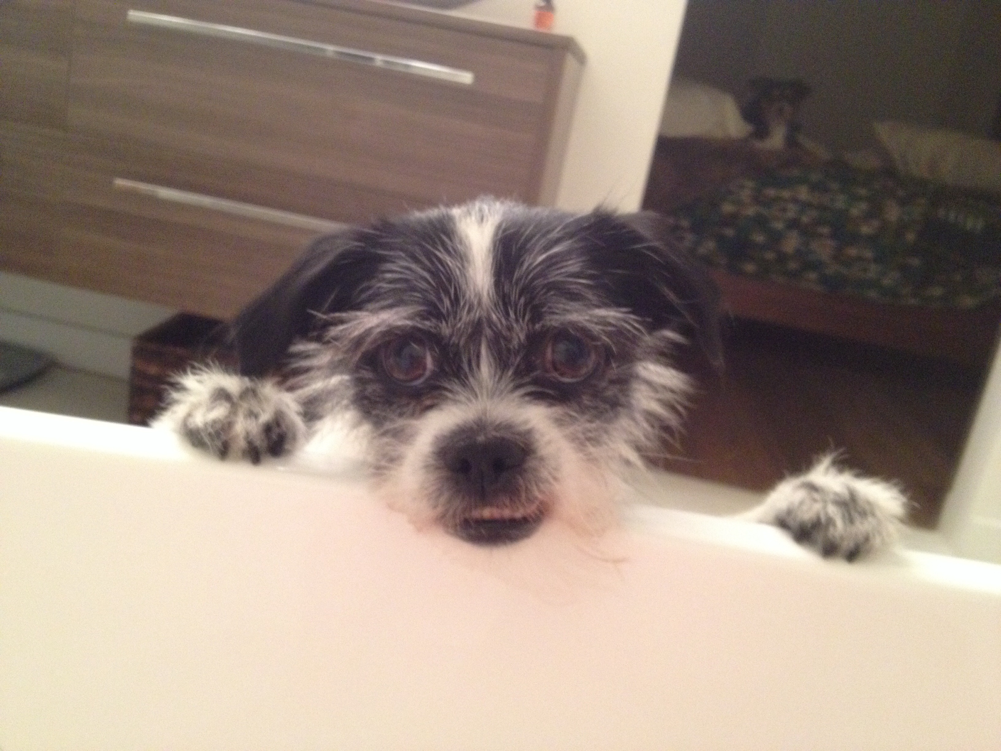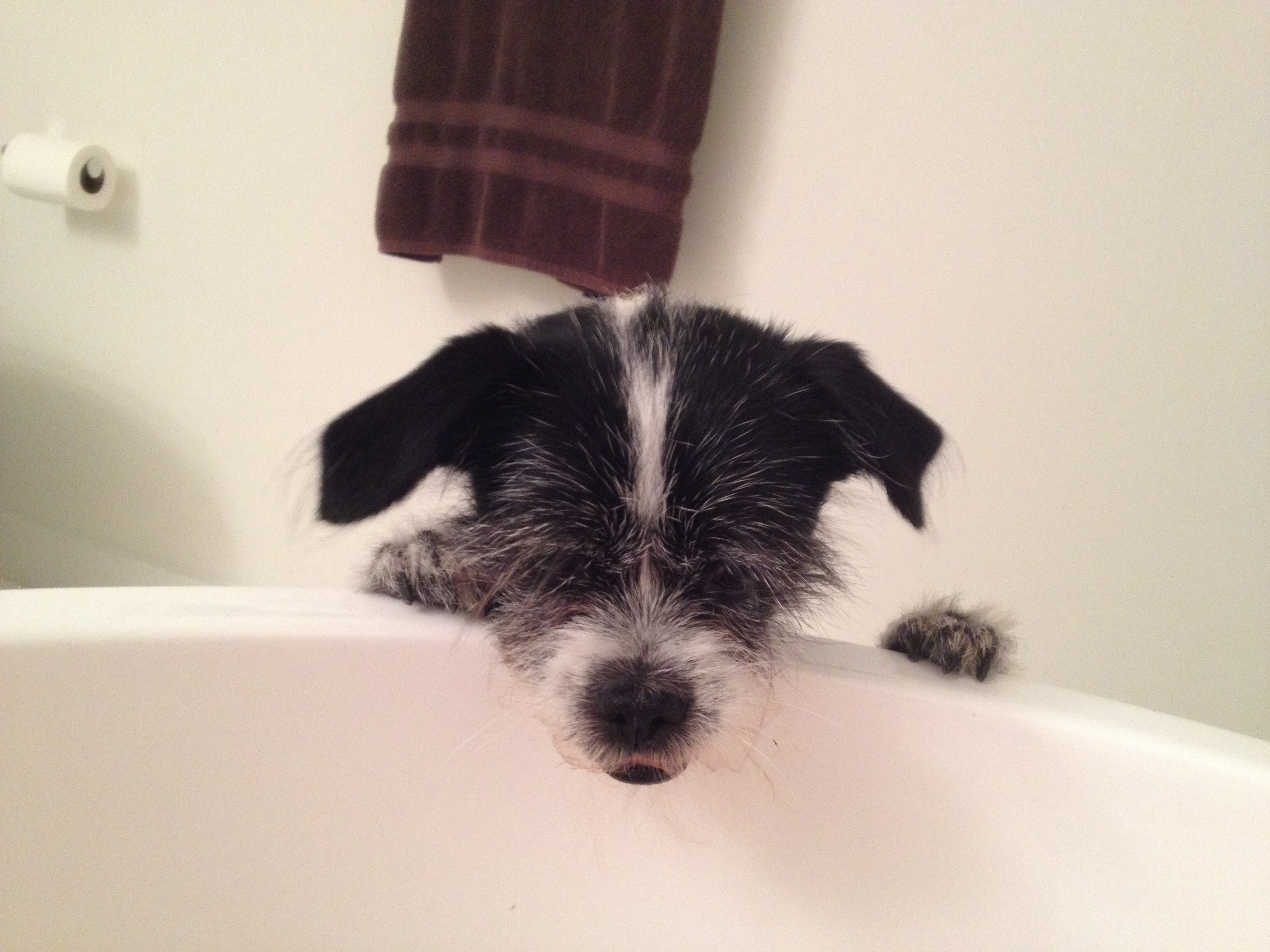 Every time I take a bath my dog Zira peeks over the edge at me and she looks so ridiculously cute. Last night I remembered to bring my phone into the bathtub with me.