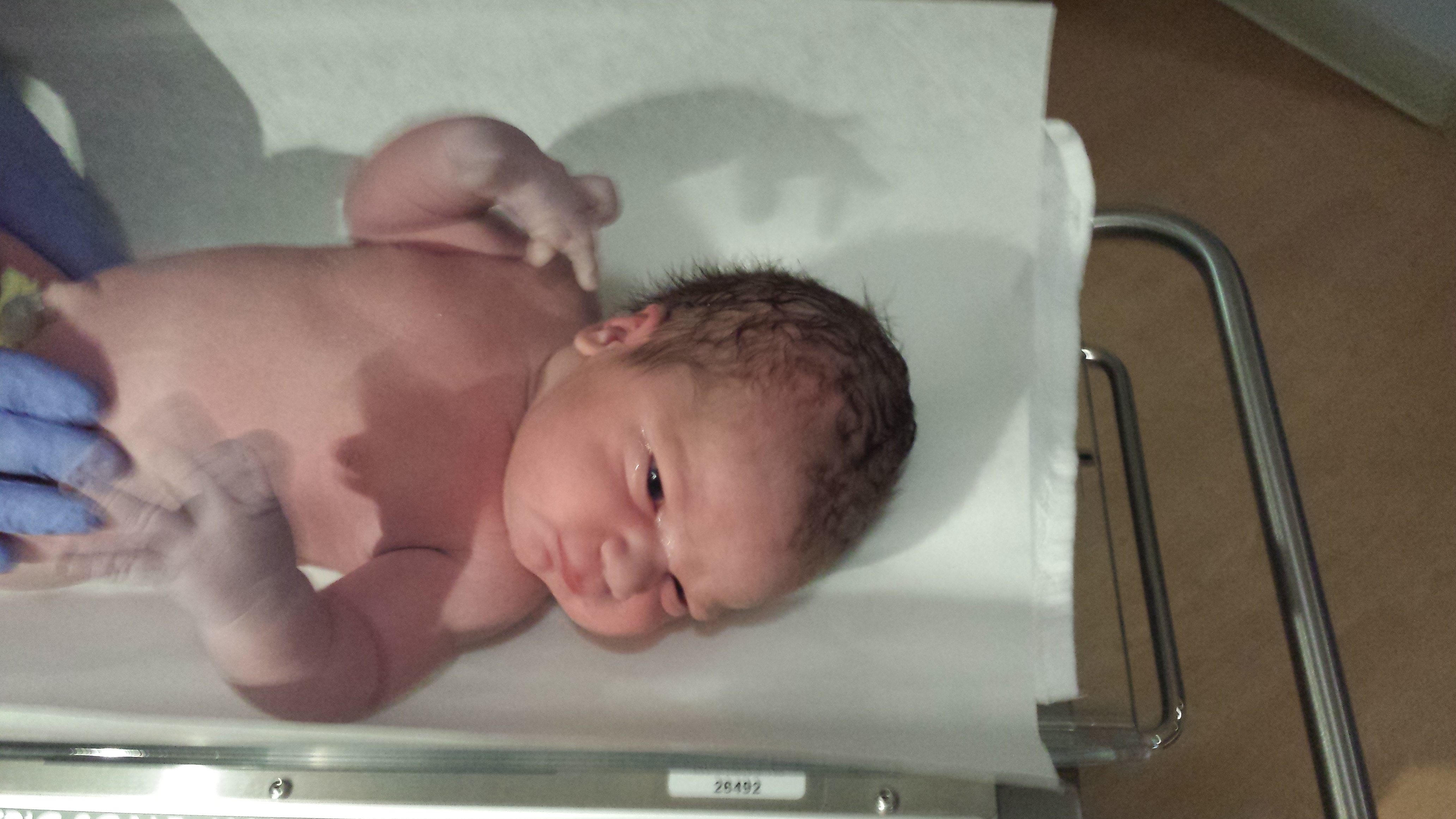 At 10 pm I was fully dilated and really feeling the urge to push. I tried pushing on my back but I couldn't focus the push so I ended up on my left side in the fetal position with one hand gripping the bed rail and the other gripping DH. 39 hours from when we started, after only 30 minutes of pushing and screaming "I CAN'T" Mason arrived. DH is pretty emotional and bawled through the whole delivery.