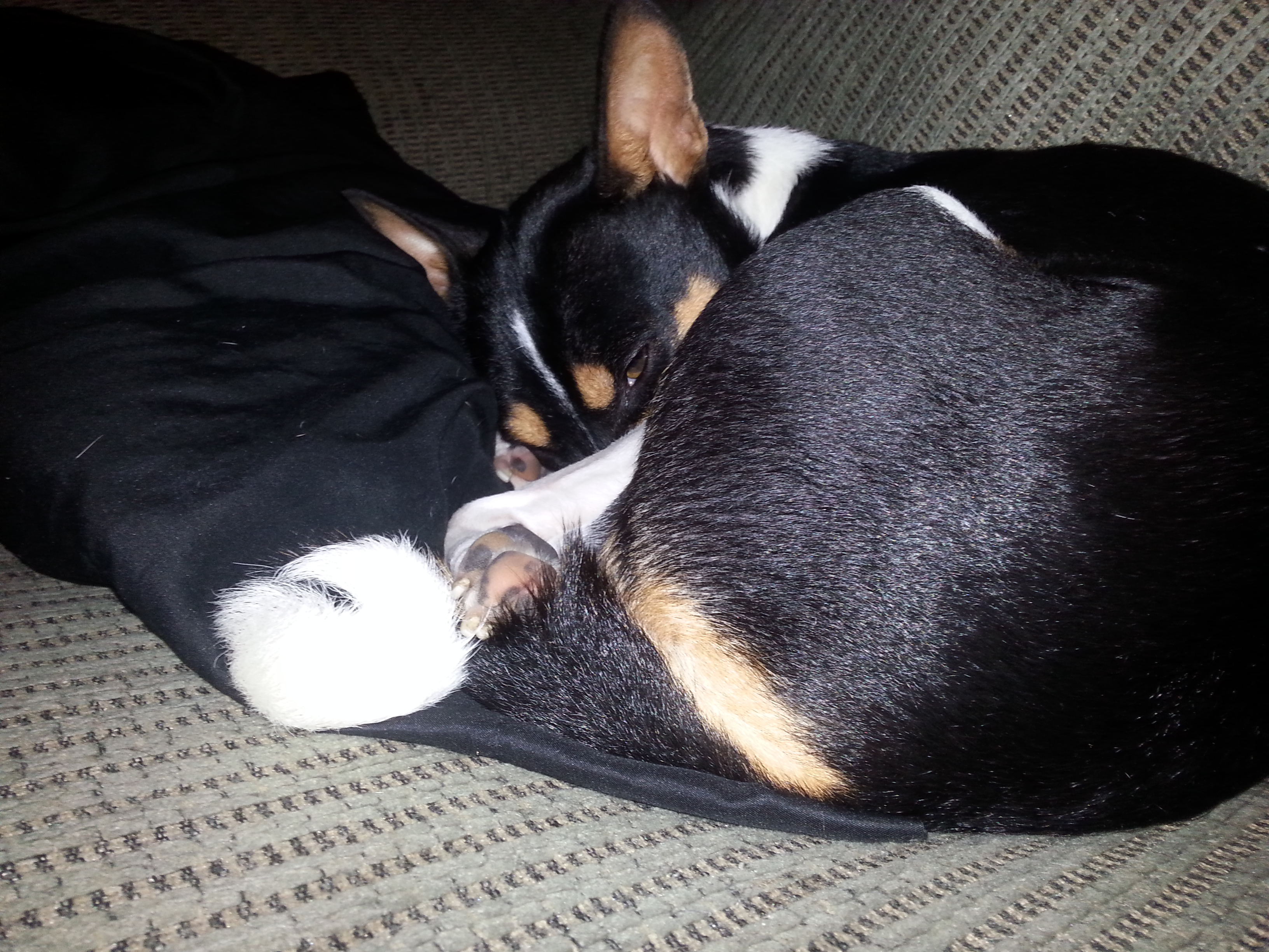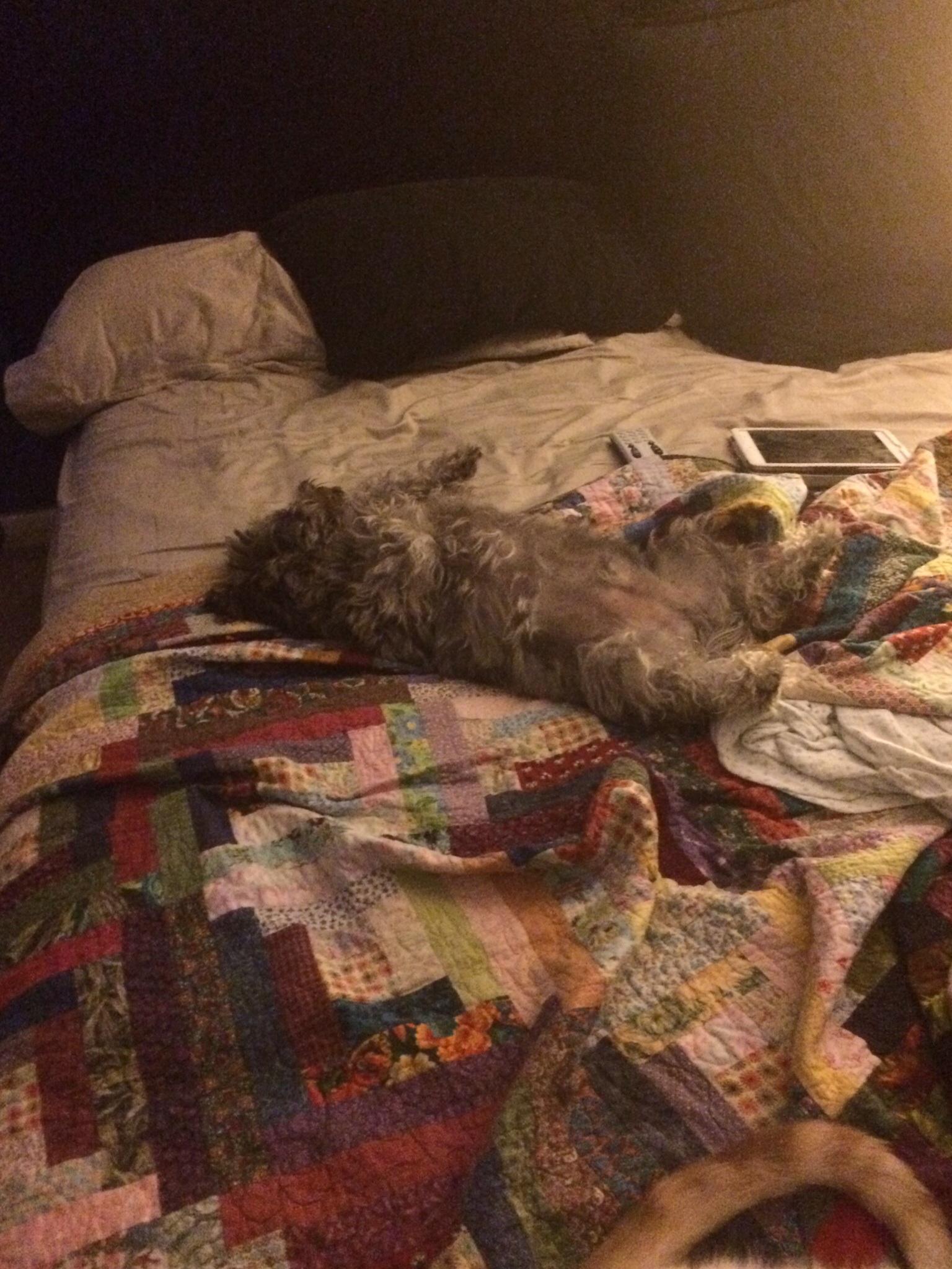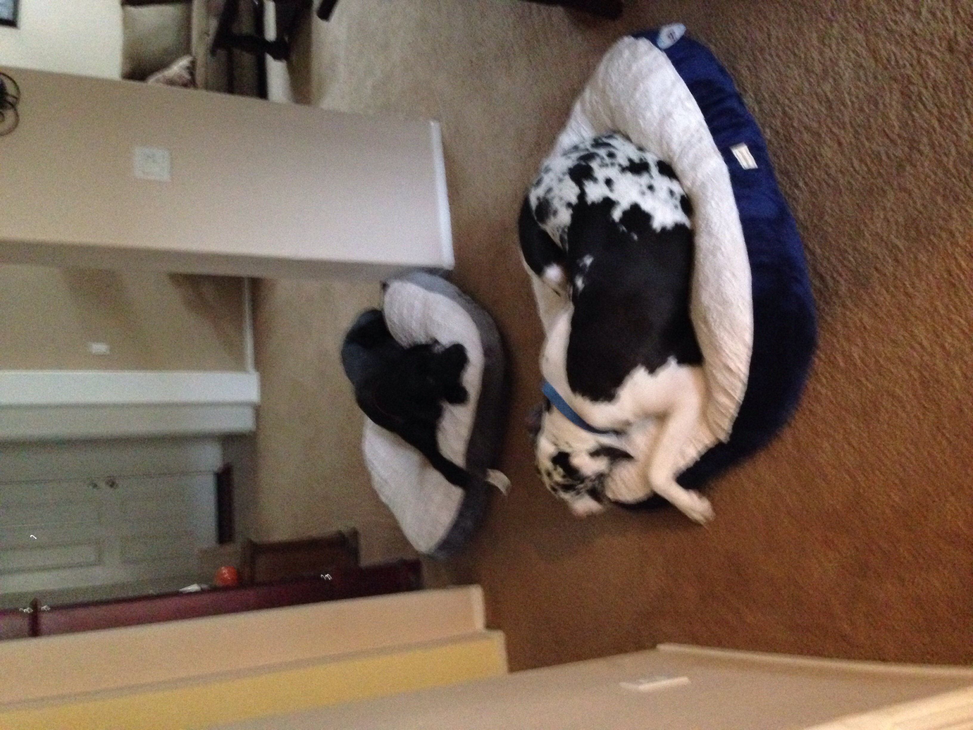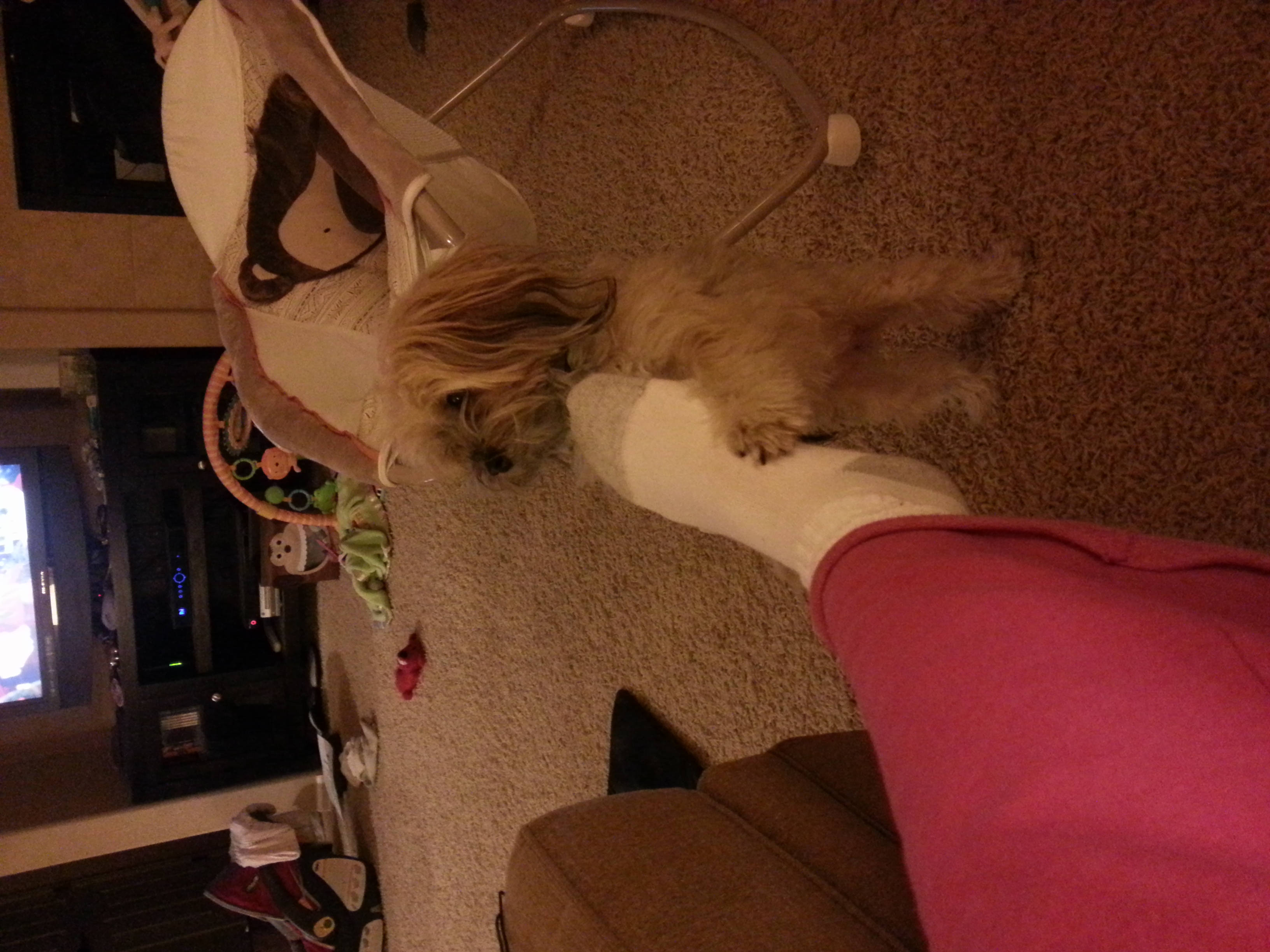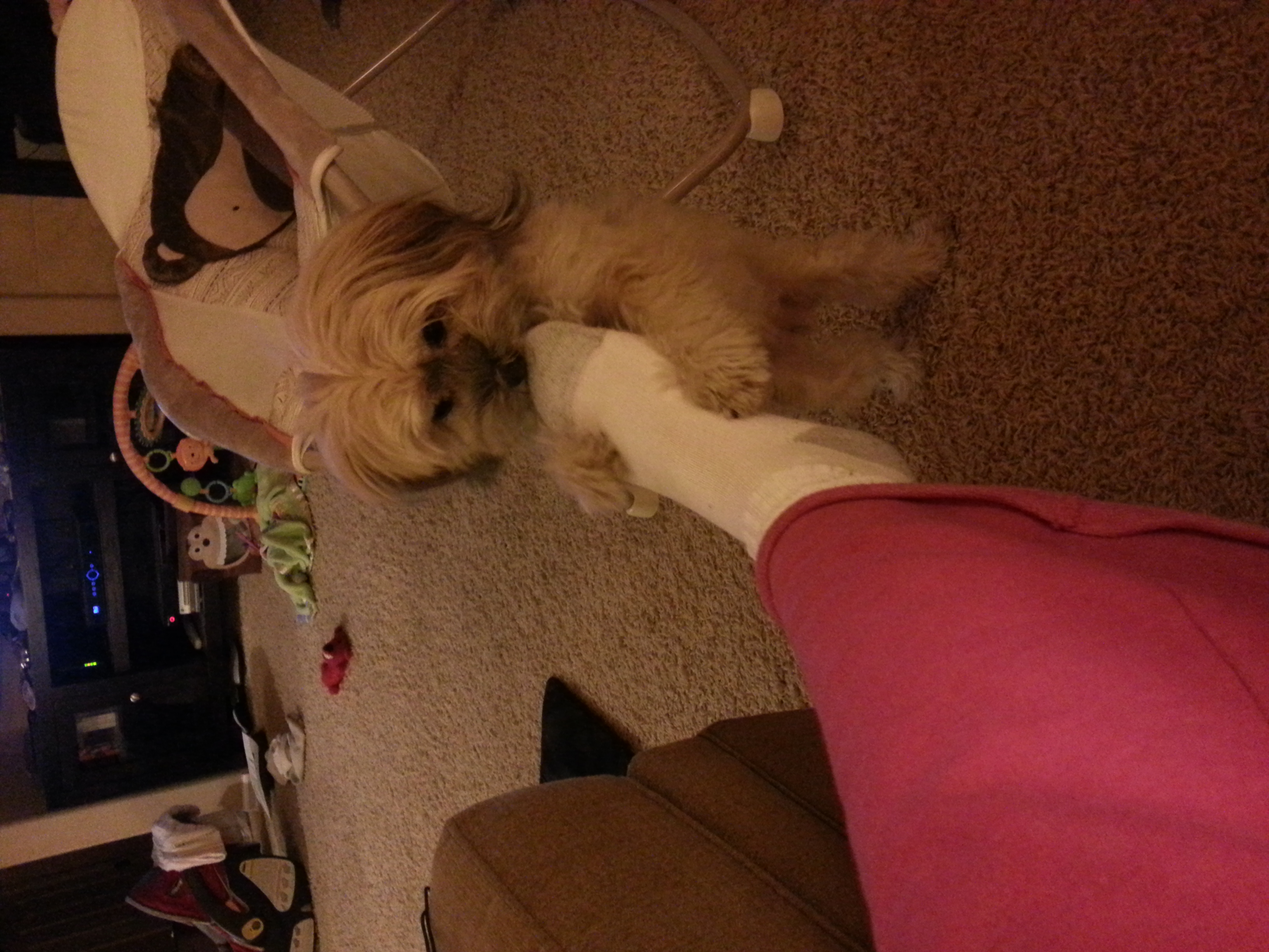 Chewy, after 6 days with just mommy and baby he stepped up to be the man of the house and protect us. Once dad got home and he knew he was off the hook, I walk into my bedroom to this!